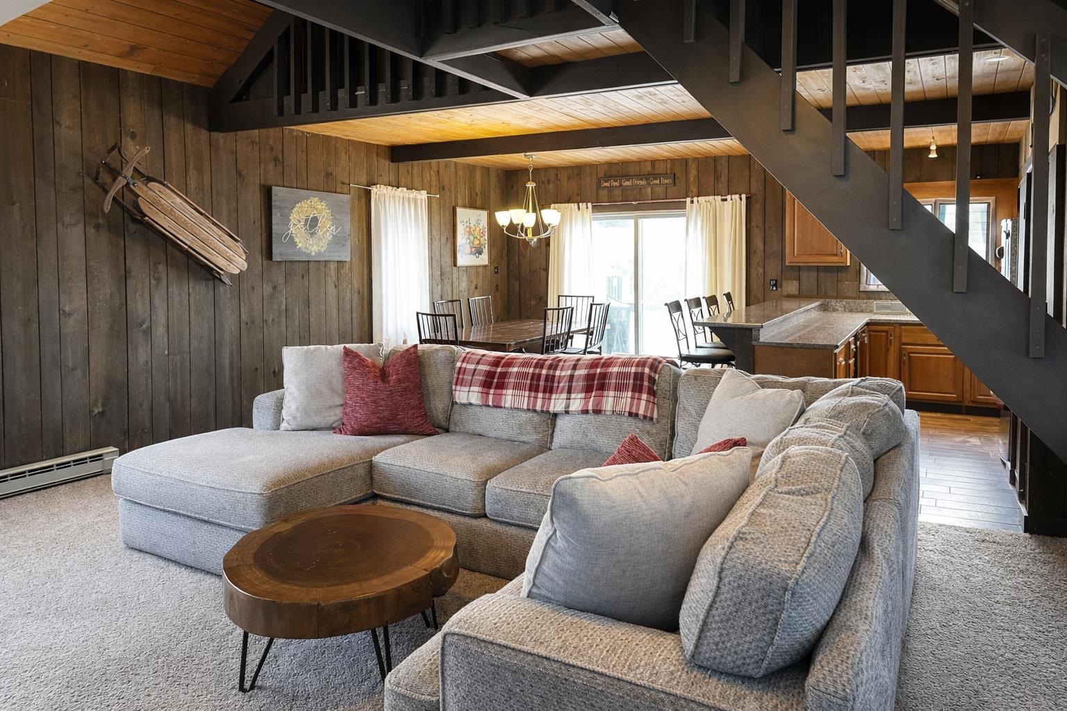 - Cathedral Ceiling, Dining Area, 1 Fireplace, Furnished, Kitchen/Dining, Kitchen/Living, Living/Dining, Natural Light, Natural Woodwork, Wood Stove Insert