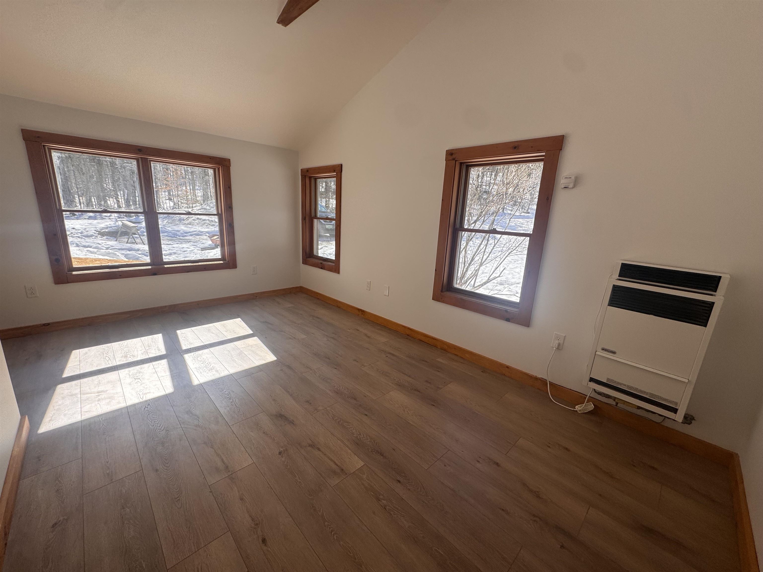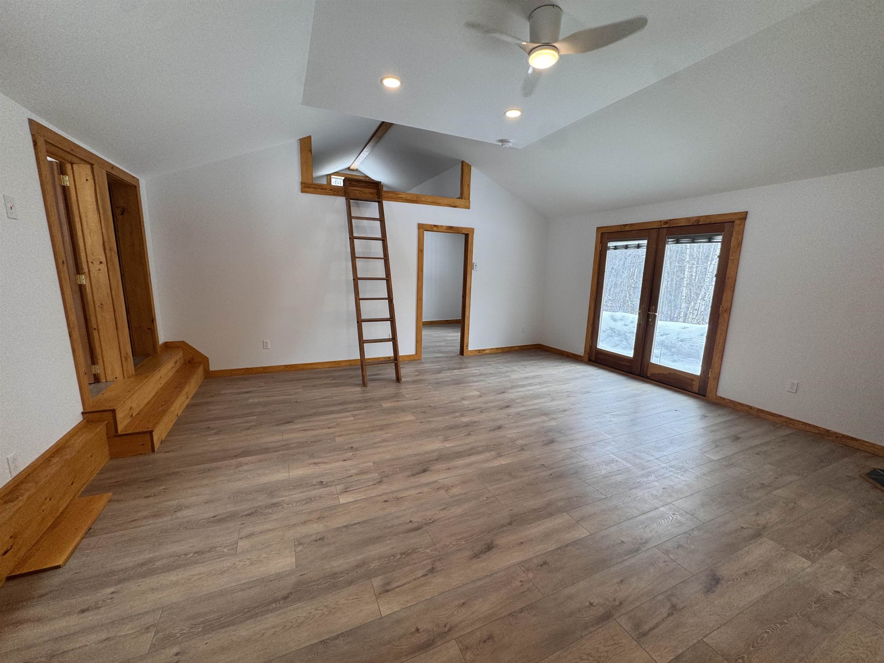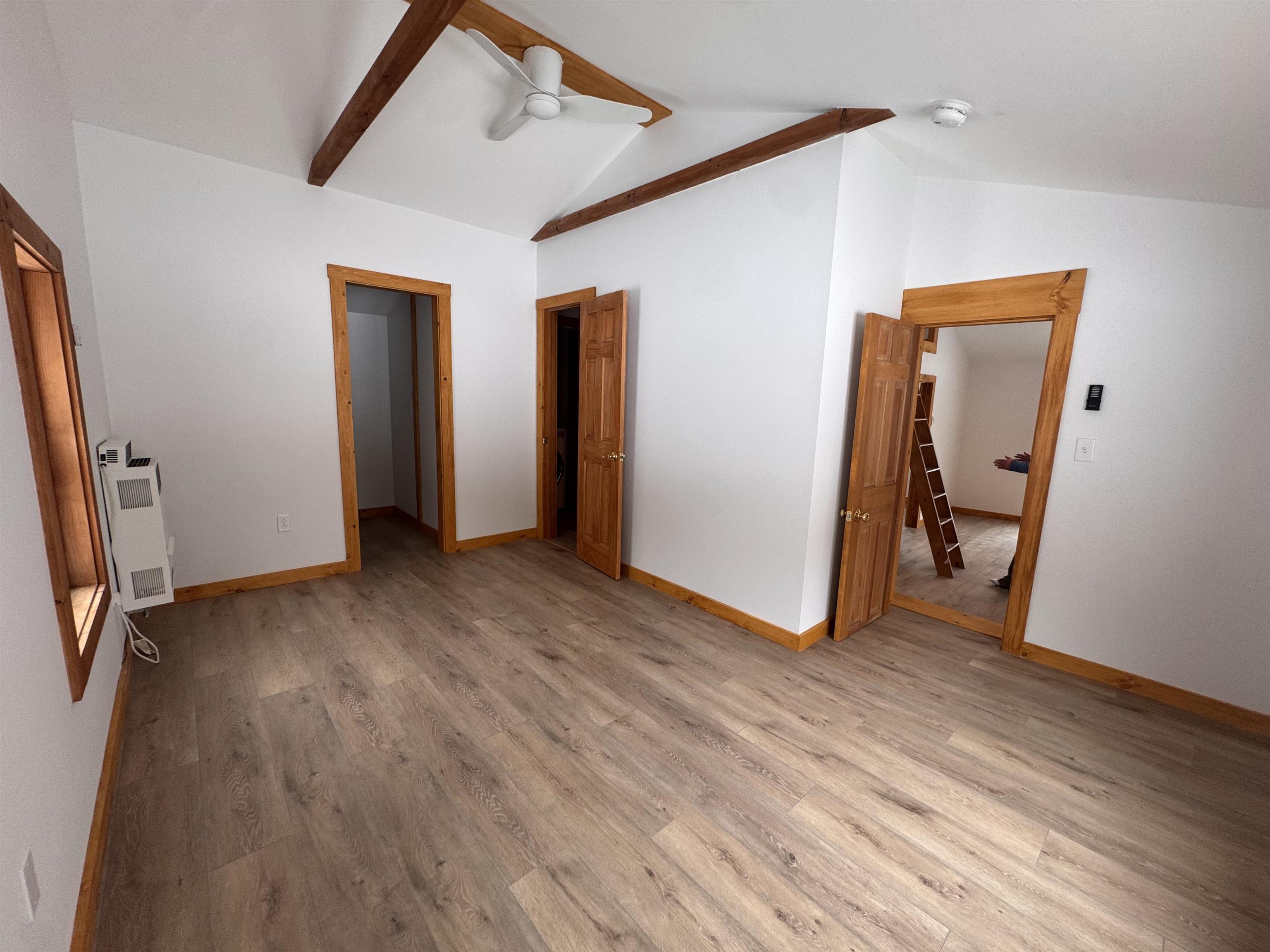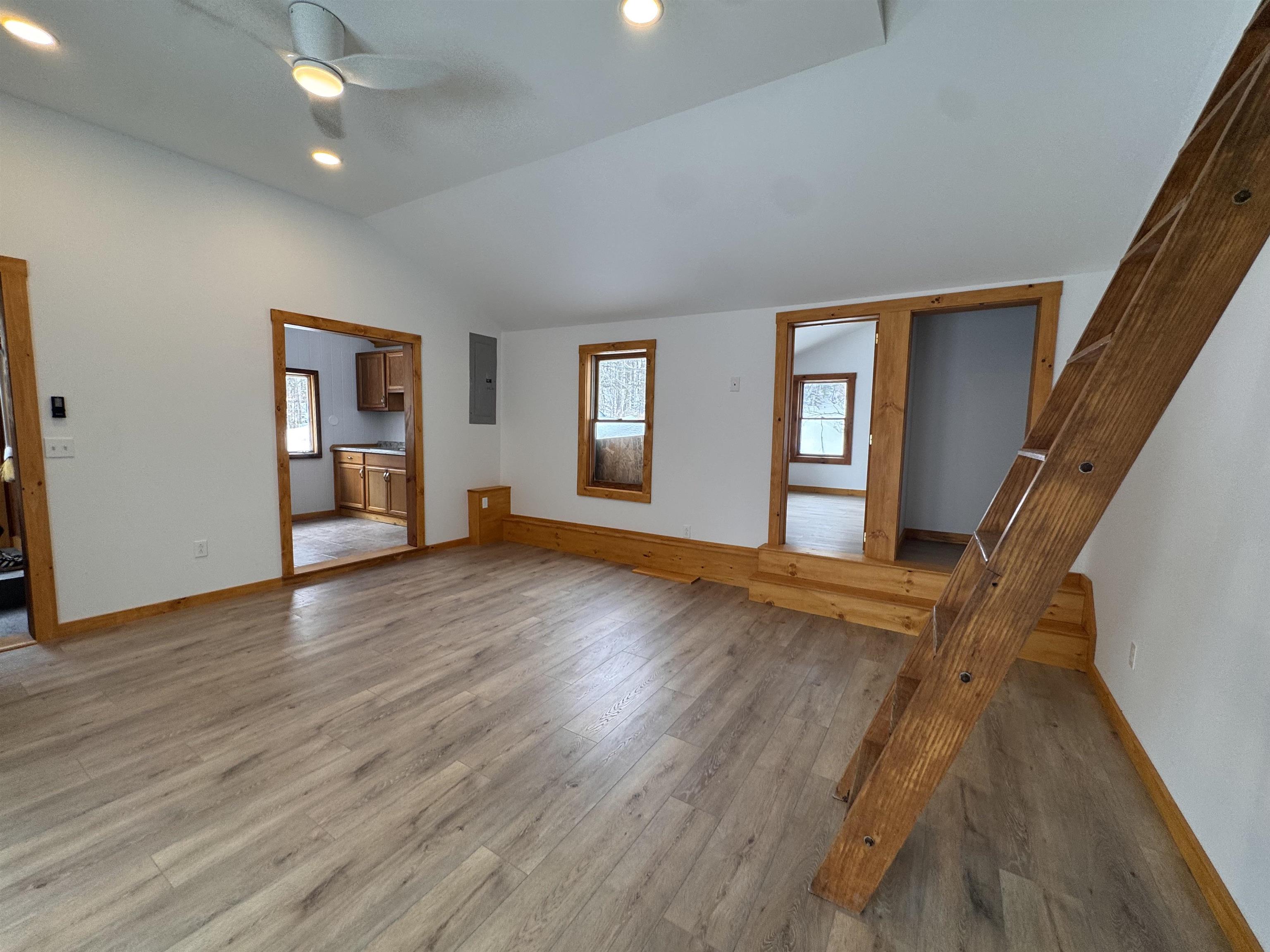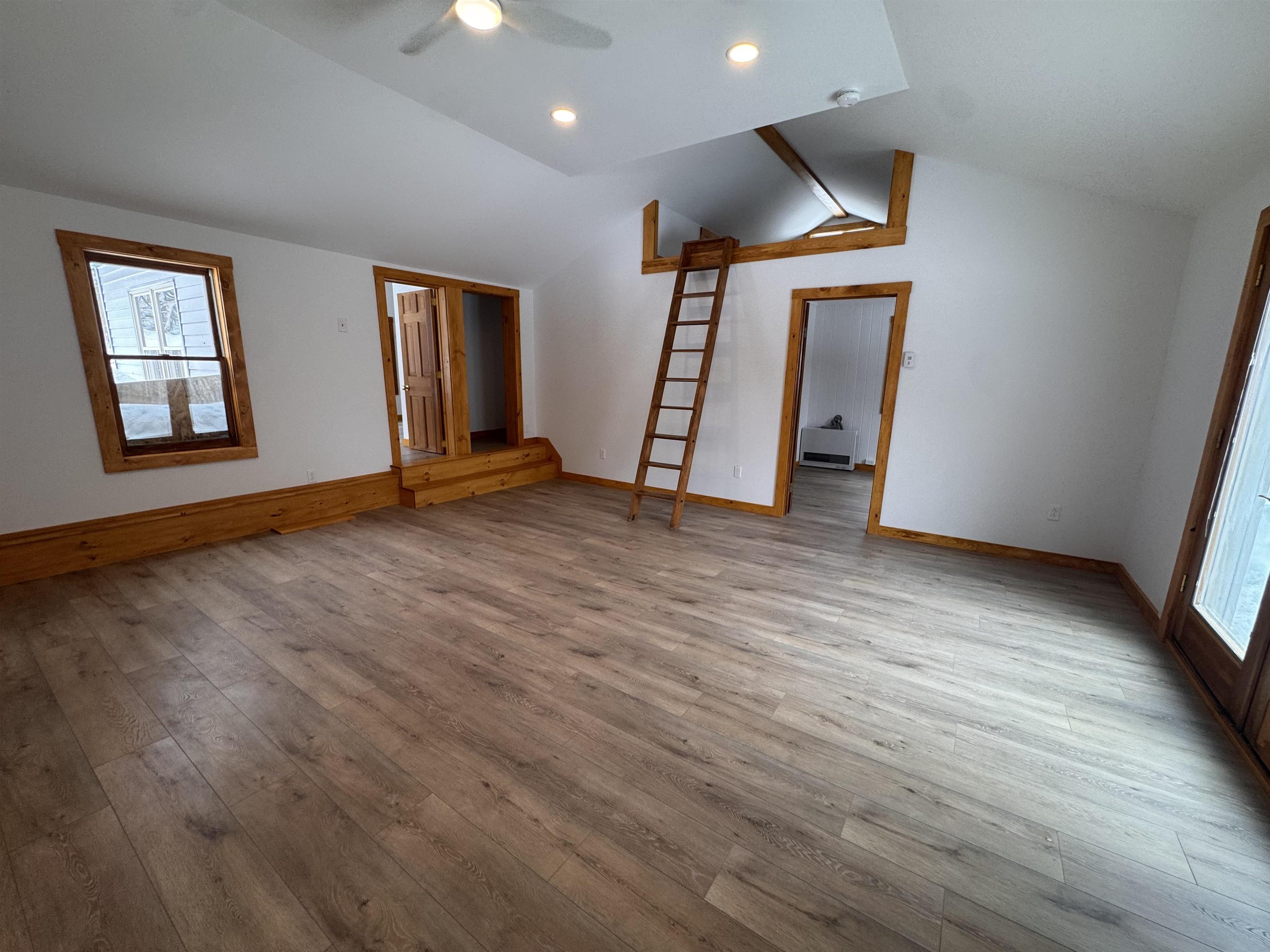 - Cathedral Ceiling, Ceiling Fan, Living/Dining, Natural Light, Natural Woodwork, Walk-in Closet