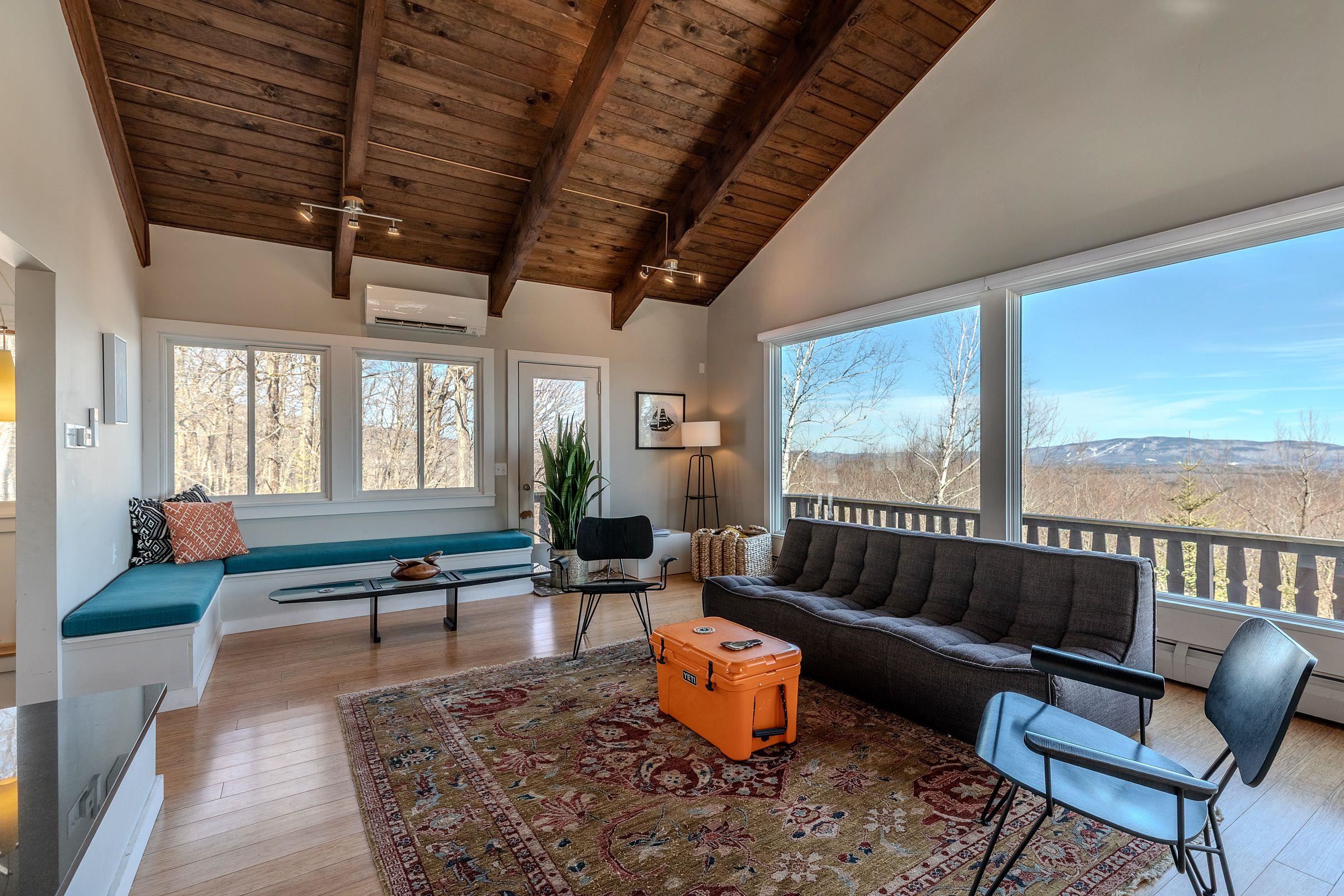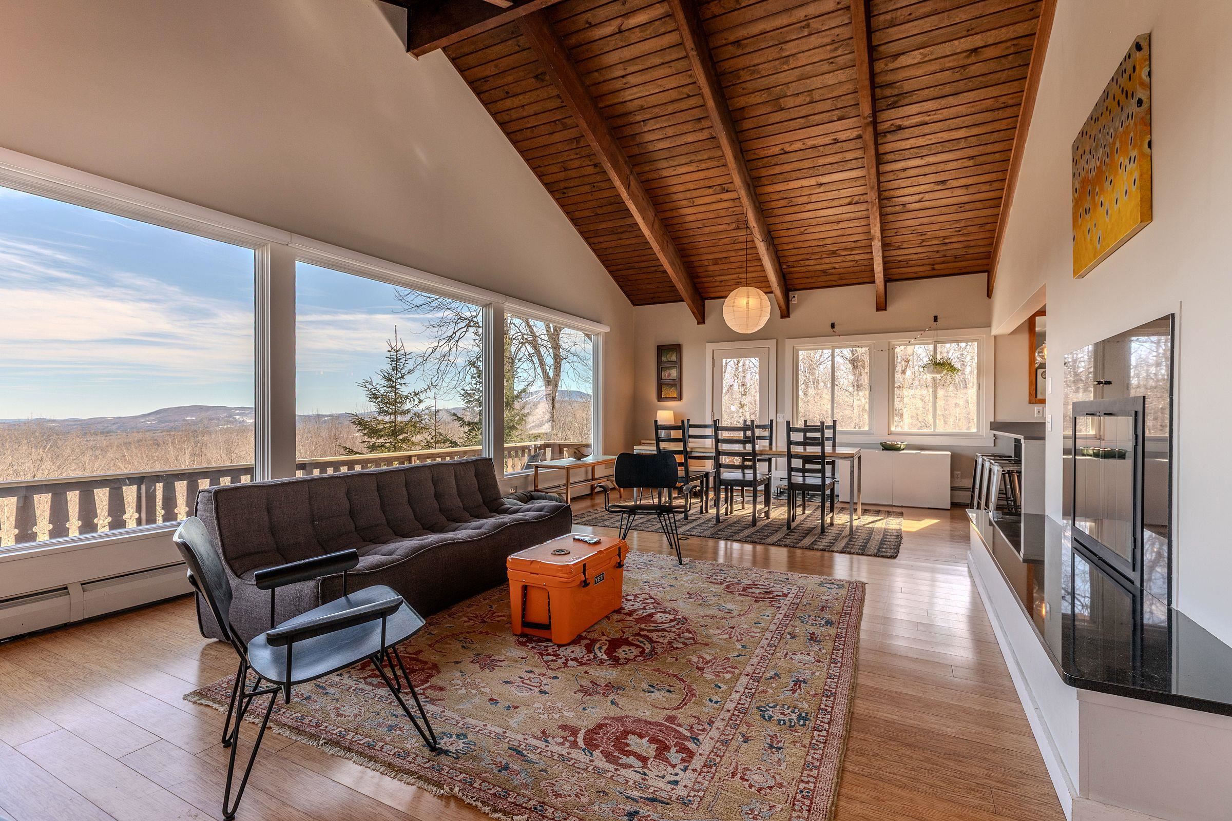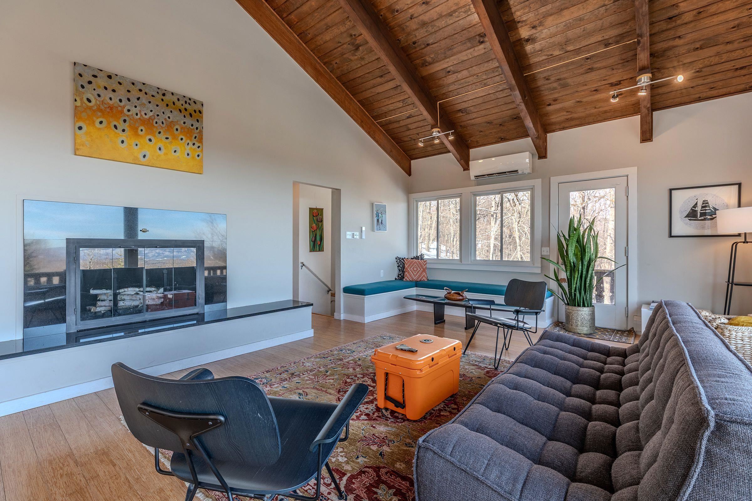 Perched to capture breathtaking long-range views, this striking ski home offers an unforgettable vantage point of Magic Mountain and Stratton, with Bromley visible to the northwest—a daily reminder that some of Southern Vermont’s best skiing and outdoor adventure are just minutes away. With its cool, modern vibe and classic alpine character, the home perfectly blends style, comfort, and mountain living. The main living area is designed to showcase the spectacular scenery, with large windows that frame the surrounding mountains and fill the space with natural light. A wood-burning fireplace anchors the living room, creating the perfect spot to gather after a day on the slopes. Clean architectural lines, warm materials, and thoughtful updates give the home a contemporary yet welcoming feel throughout. Several upgrades and renovations provide comfort and efficiency for years to come. The property also includes a carport, providing convenient covered parking so you won’t have to clear snow off your car after a Vermont snowfall, along with space for skis and all the gear that comes with an active mountain lifestyle. Perfectly located just minutes from Bromley Mountain and a short drive to Stratton Resort, this home is ideally positioned for year-round recreation—from skiing and snowboarding in winter to hiking, biking, and golf in the warmer months. An added benefit of this property, if you opt to join, is that a Bromley Bond is available, providing driveway plowing, and garbage pickup services. Whether you are seeking a full-time residence or a retreat, this unique mountain home offers style, views, and an unbeatable Southern Vermont location. Closing to occur on or after June 15. The buyer may elect to close earlier and allow the seller to rent the property back until June 15. This property will transfer unfurnished.