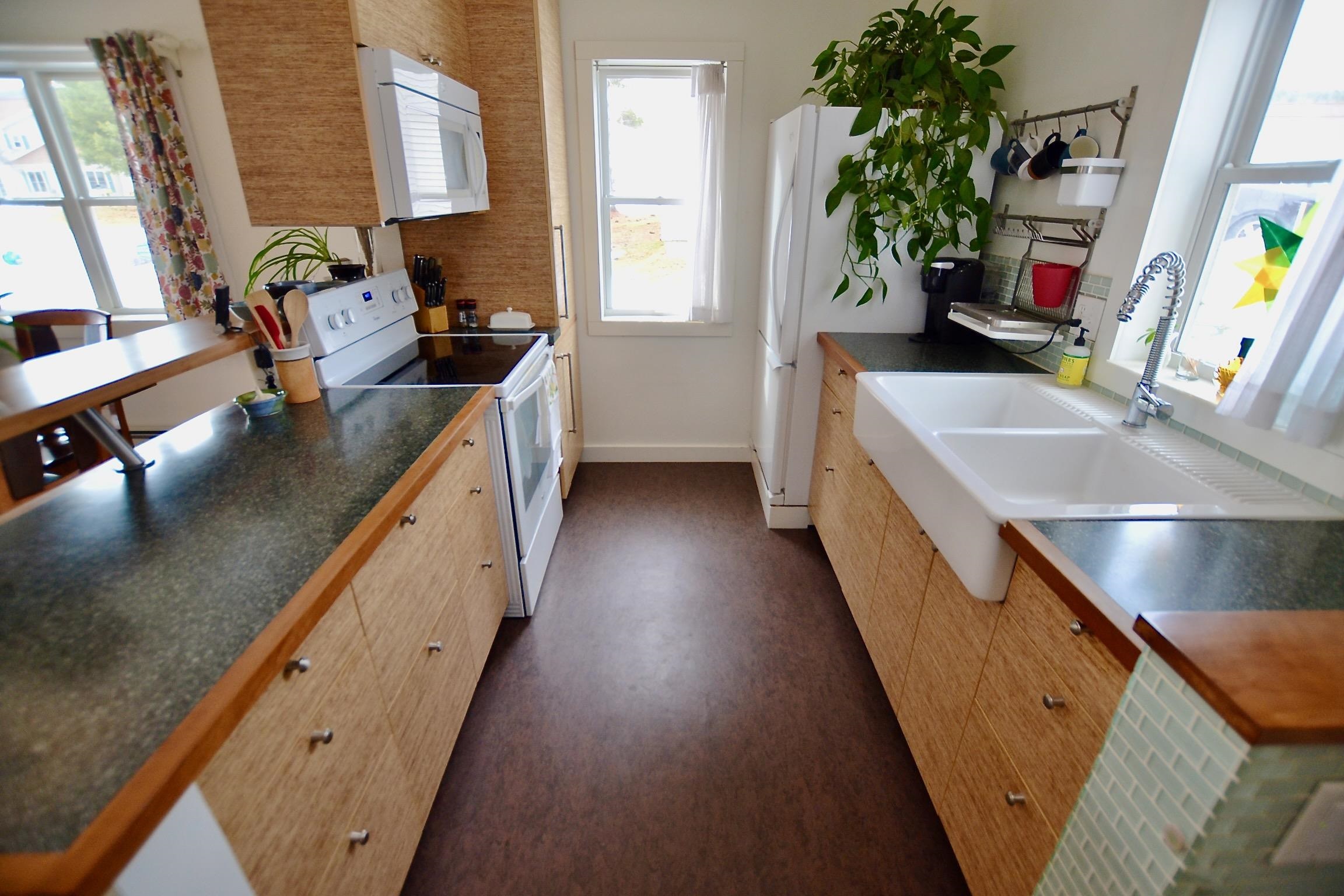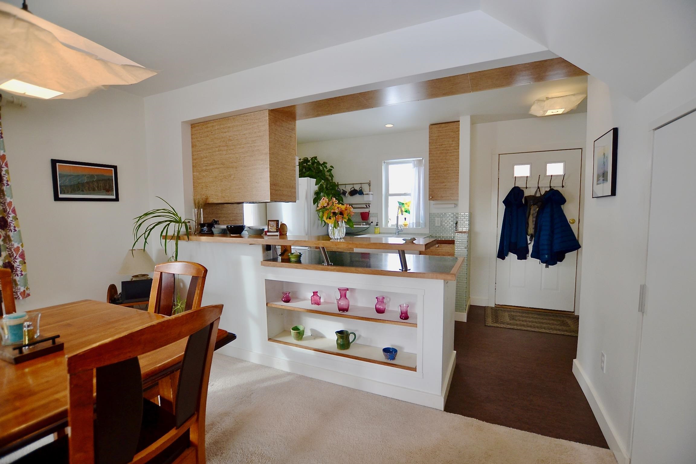 One of Waterbury's most distinctive condos, this sun-drenched, south-facing end-unit townhouse at Oakwood Estates carries a character all its own — the result of a thoughtful, high-quality renovation that set it apart from every other unit in the complex. The open-concept kitchen features custom aspen cabinetry floor to ceiling, sleek countertops, recessed lighting, and a cherry and stone bar that flows into the dining area — perfect for quiet dinners or lively entertaining. Living spaces beyond are anchored by soaring ceilings and generous southern light. Upstairs, the primary bedroom offers double closets and sweeping views of a wooded ridgeline — the kind of Vermont backdrop that never gets old. Outside, a private stone patio captures the southern exposure beautifully, with a detached garage rounding out the package. Minutes from Waterbury Village, I-89, Stowe, and the Mad River Valley.