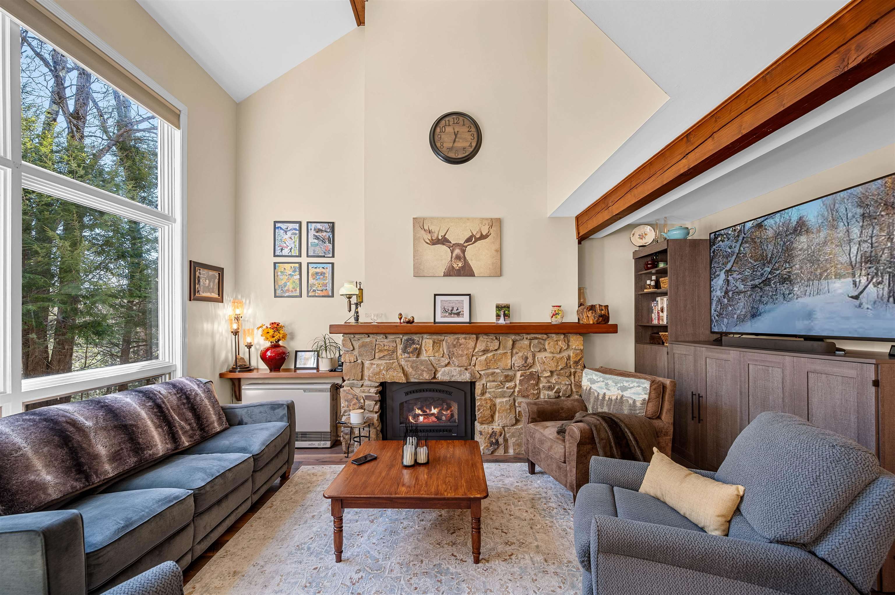 - Cathedral Ceiling, Dining Area, Draperies, Gas Fireplace, Furnished, Hearth, Primary BR w/ BA, Natural Light, Smart Thermostat