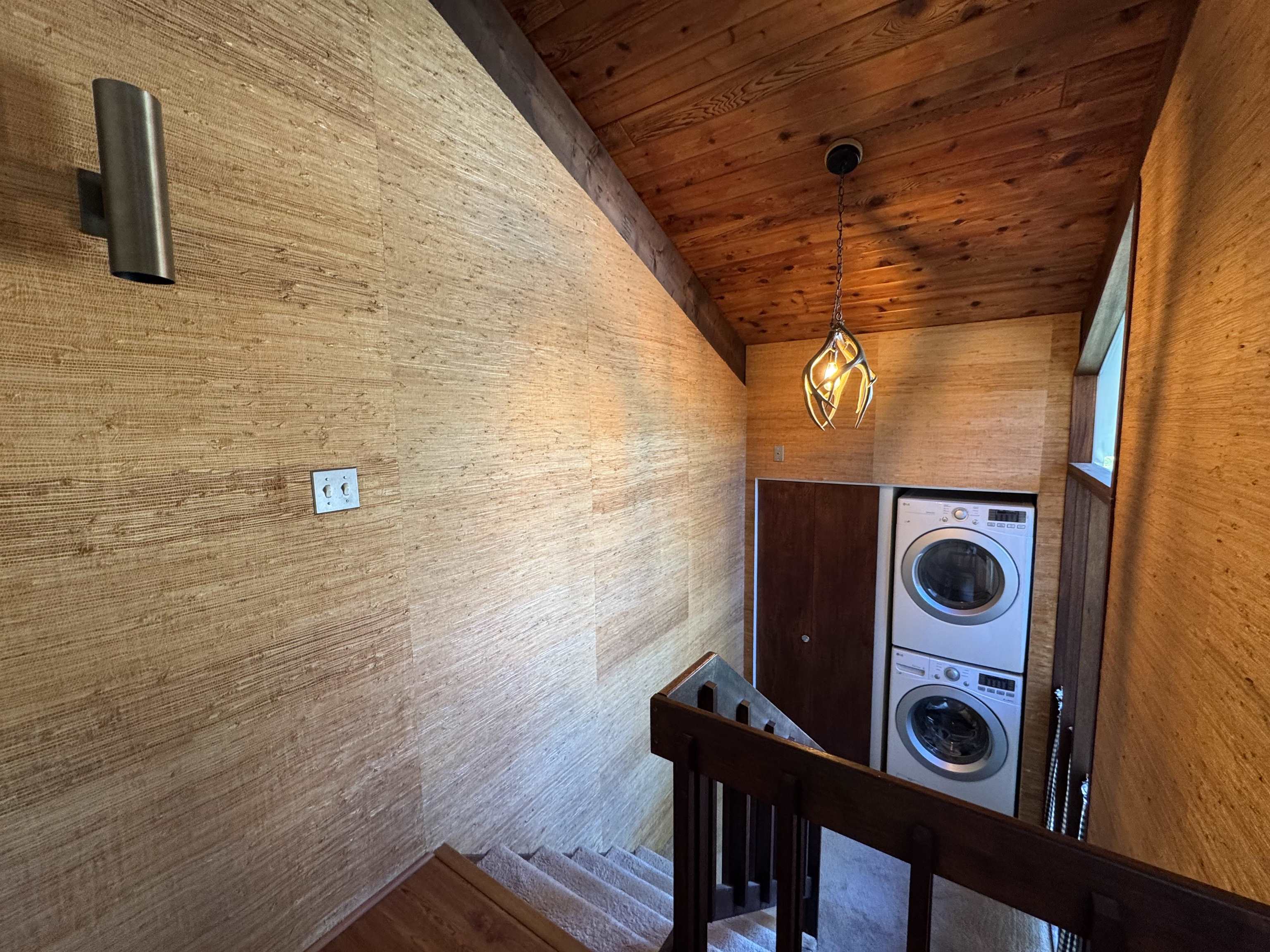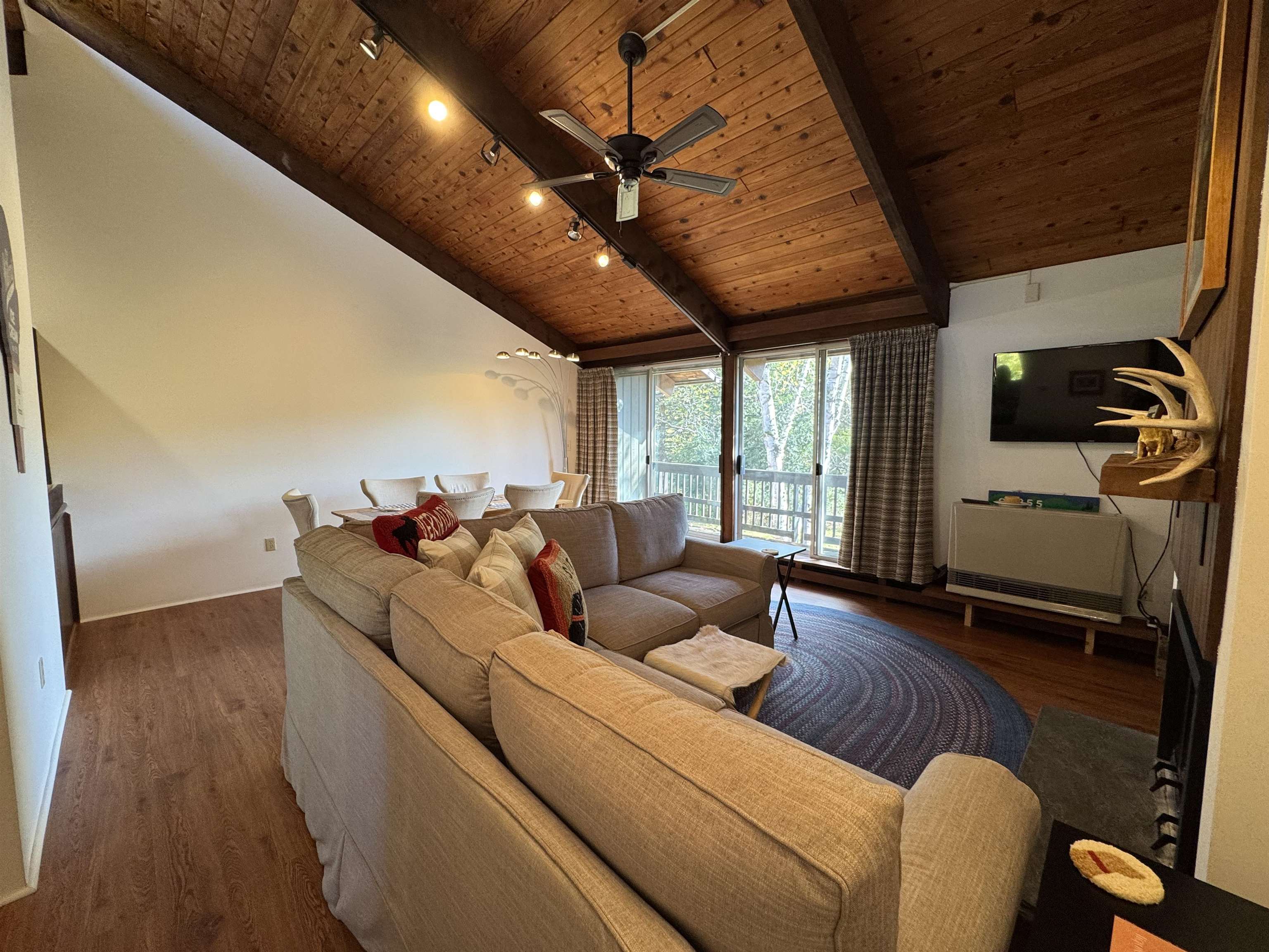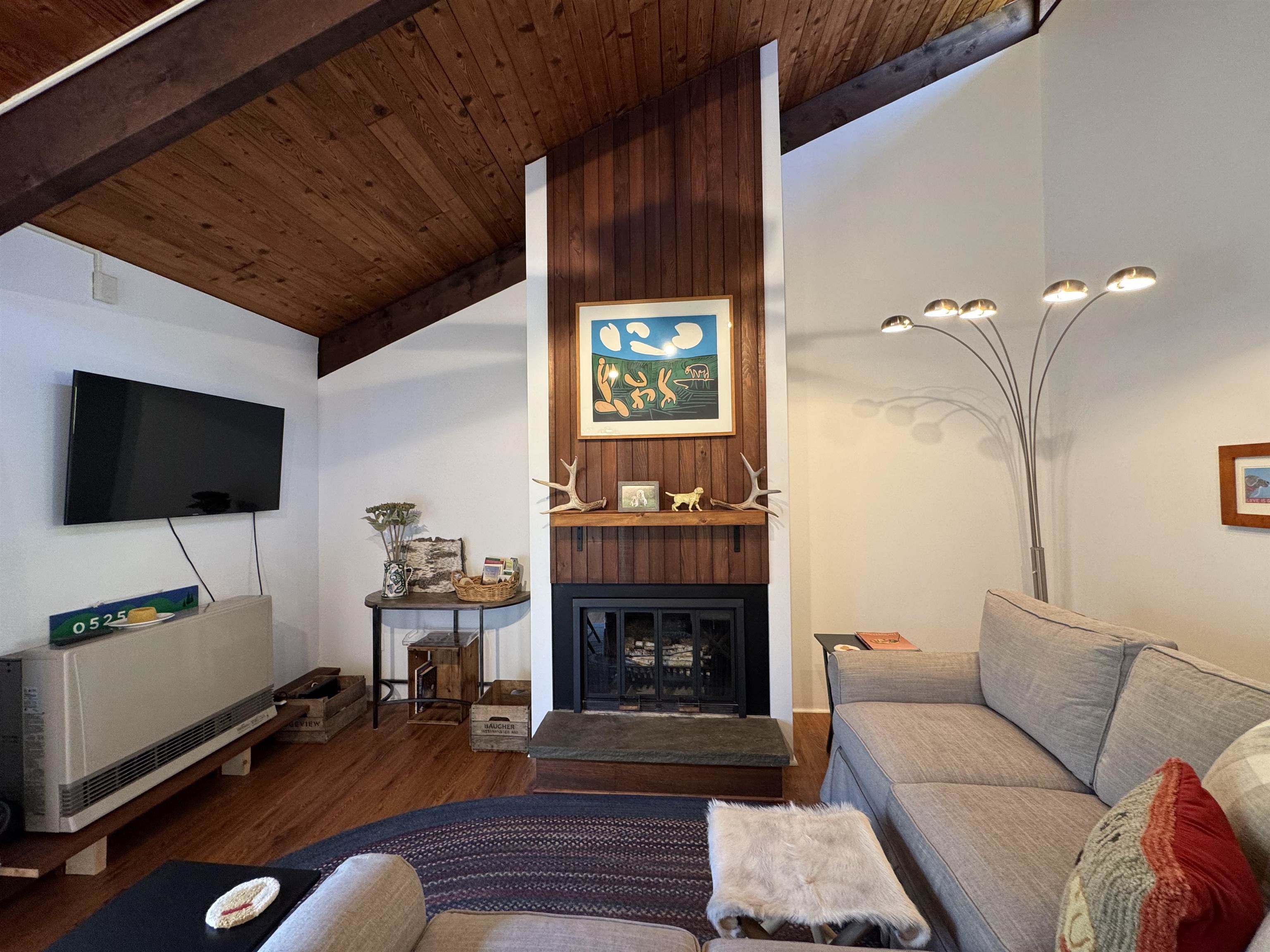 - Cathedral Ceiling, Dining Area, Wood Fireplace, 1 Fireplace, Furnished, Living/Dining, Natural Woodwork, Vaulted Ceiling, 1st Floor Laundry