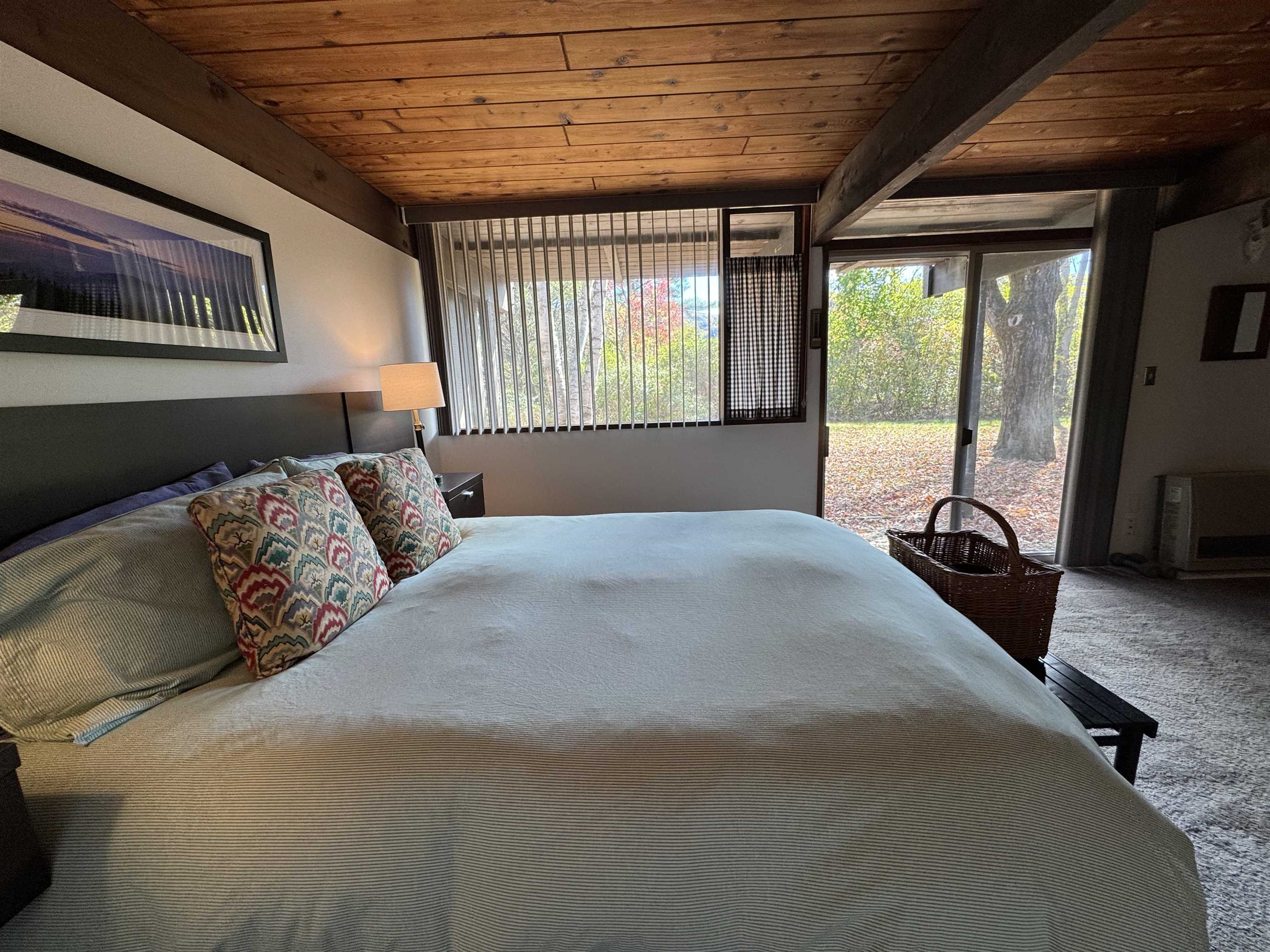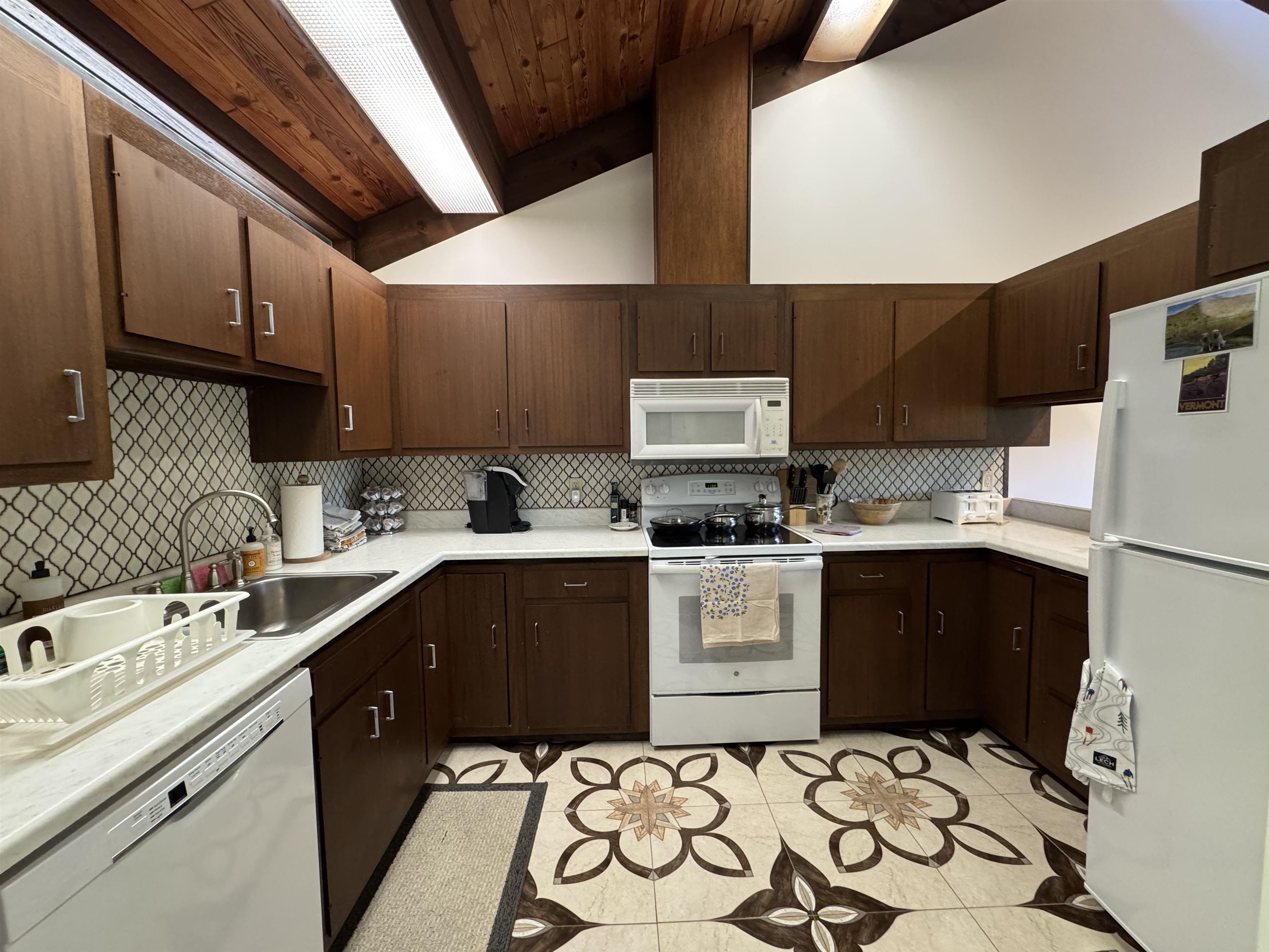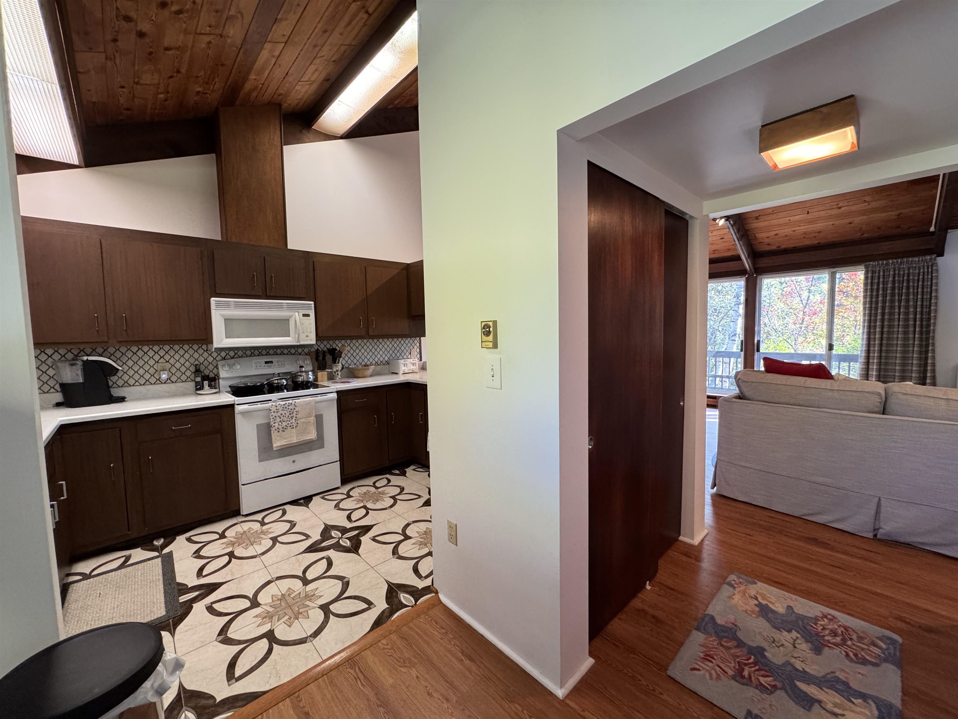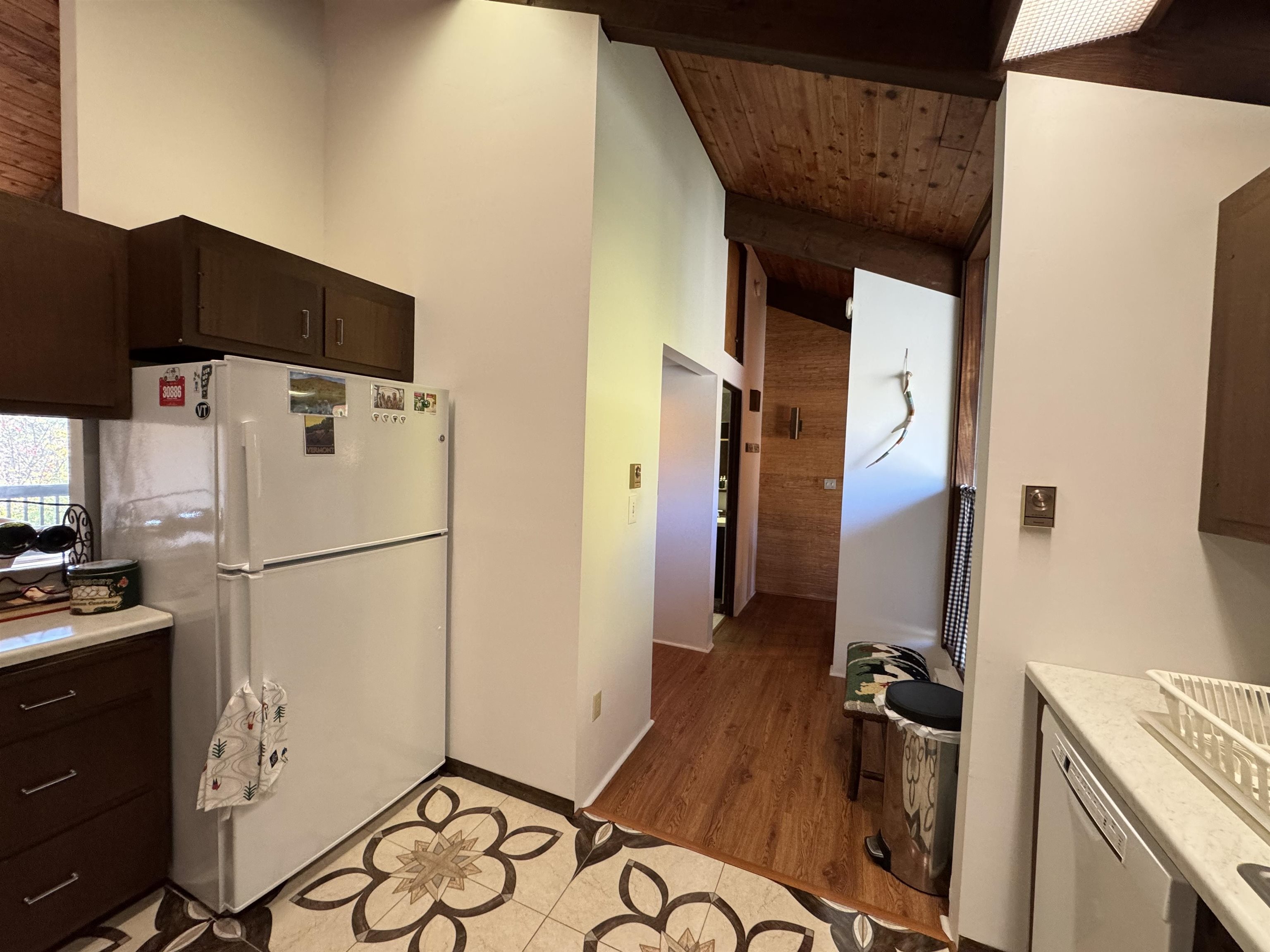 - Cathedral Ceiling, Dining Area, Wood Fireplace, 1 Fireplace, Furnished, Living/Dining, Natural Woodwork, Vaulted Ceiling, 1st Floor Laundry