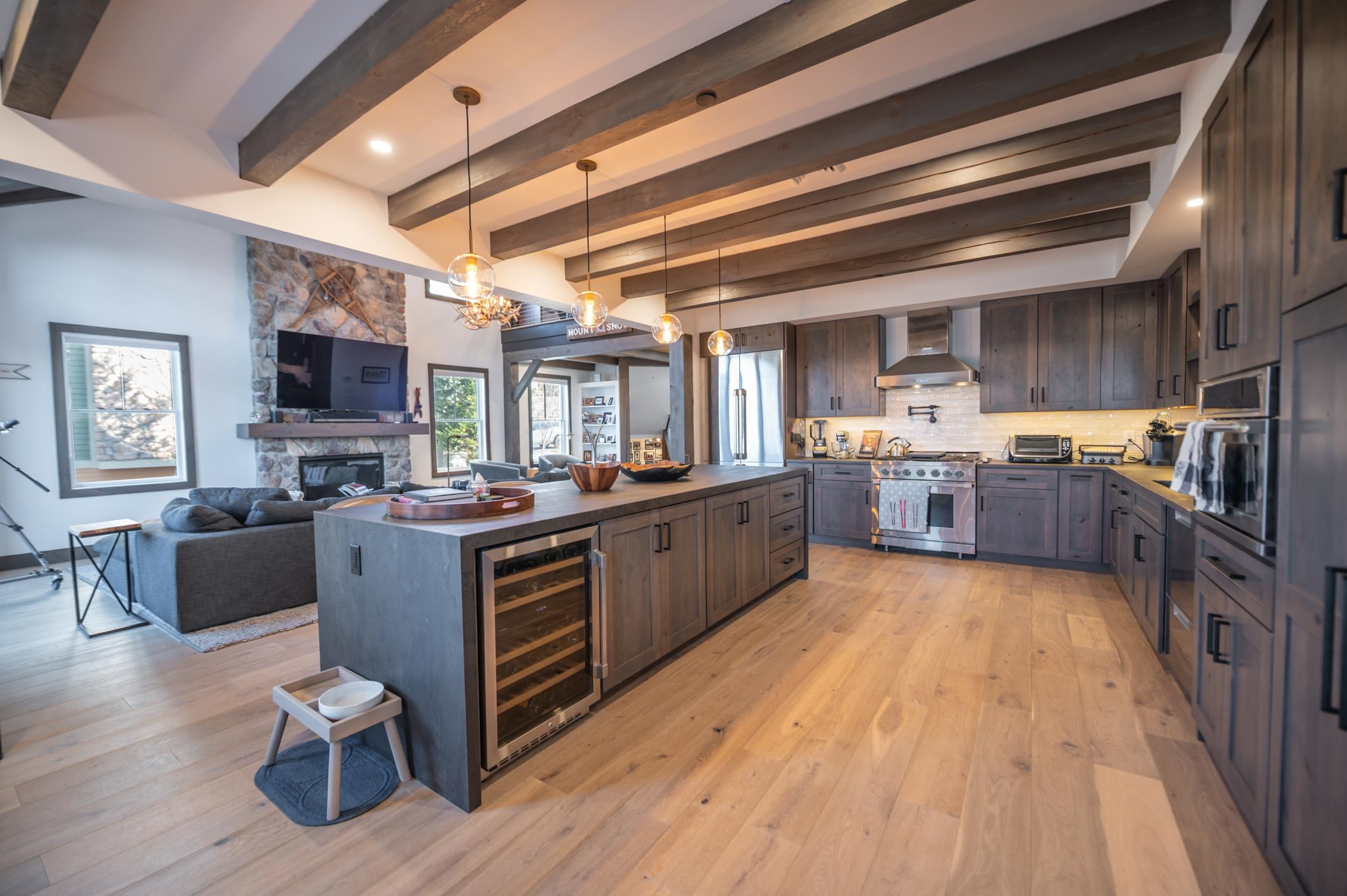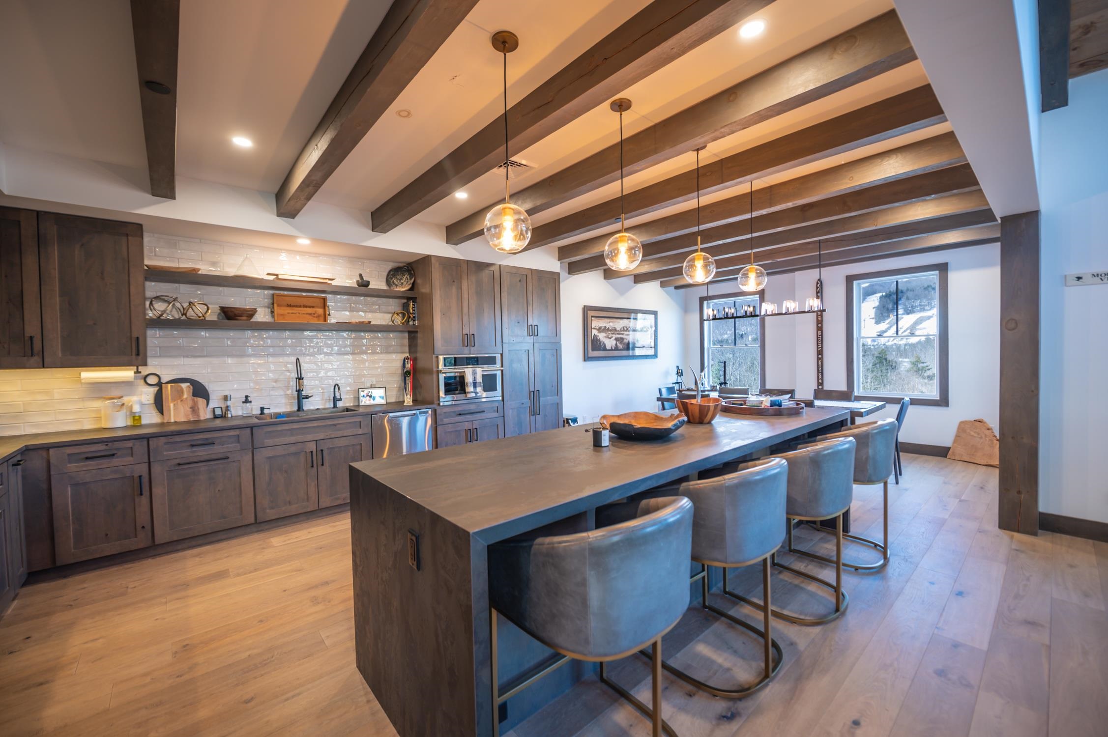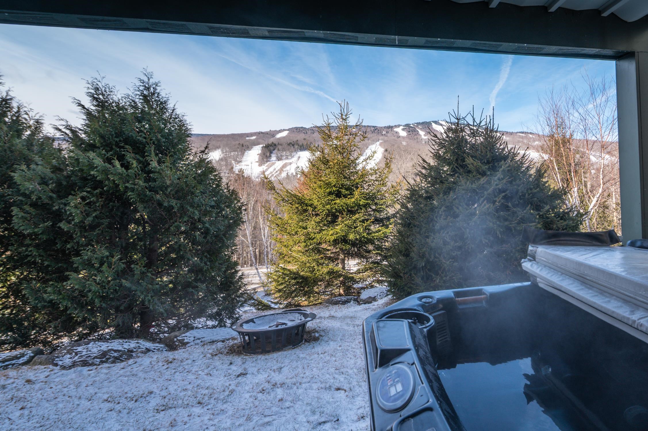 Once in a while, a property comes along that truly leaves you speechless — and this is one of those rare moments. This 5-bedroom, 4.5-bath Boulder Ridge townhome has been meticulously renovated with precision and style at every turn. This is not the Boulder Ridge you've known before, and it's being offered completely turn-key. This immaculate unit sits in an ideal location with unobstructed ski trail views and effortless mountain access, as well as direct sightlines to groomers, fireworks, and stunning sunsets beyond. Inside, a vaulted great room welcomes you with a floor-to-ceiling stone fireplace and large windows that flood the space with natural light. Newly paneled ceilings with exposed beams, white oak floors throughout, and a tiled mudroom entry from the covered front porch with ski locker set the tone for the craftsmanship found at every turn. The expanded chef's kitchen impresses with waterfall concrete counters, stainless appliances, and an oversized island, all open to a spacious dining area and rear deck perfectly positioned to take in the views. Upstairs, the primary suite features stunning ski trail views, custom closet systems, and a spa-like bath with a tiled shower and contemporary pedestal soaking tub. There is a guest bunk room with en suite bath, and a loft office overlooking the great room. The main floor also offers a guest bedroom en suite, and a half bath for ample guests. The finished walkout lower level adds tremendous flexibility, with a large media room, wet bar, a second lockable wine bar, laundry room, two additional bedrooms, a full bath, large owner closets, and walkout access to a hot tub overlooking equally impressive views. Low HOA fees, ample parking, and exterior maintenance included make this the ideal Vermont retreat — focused on enjoyment, not upkeep. The exterior work assessment has been paid in full, so the incoming aesthetic upgrades are yours to enjoy from day one, completely hassle-free.