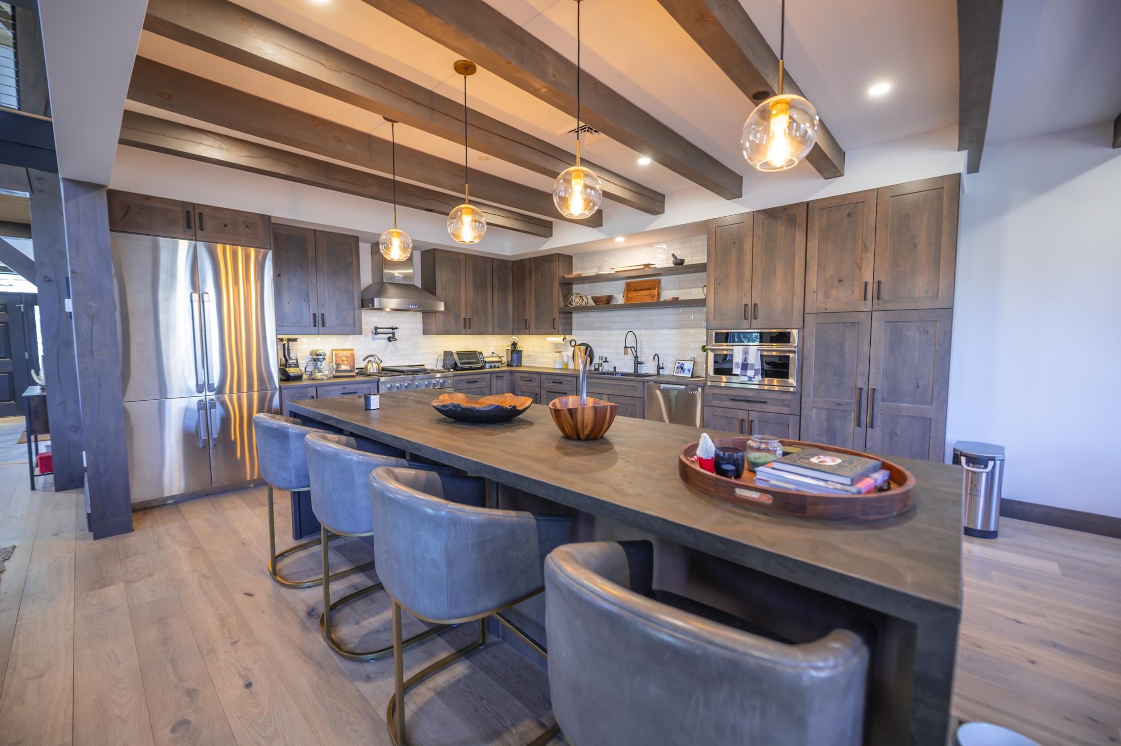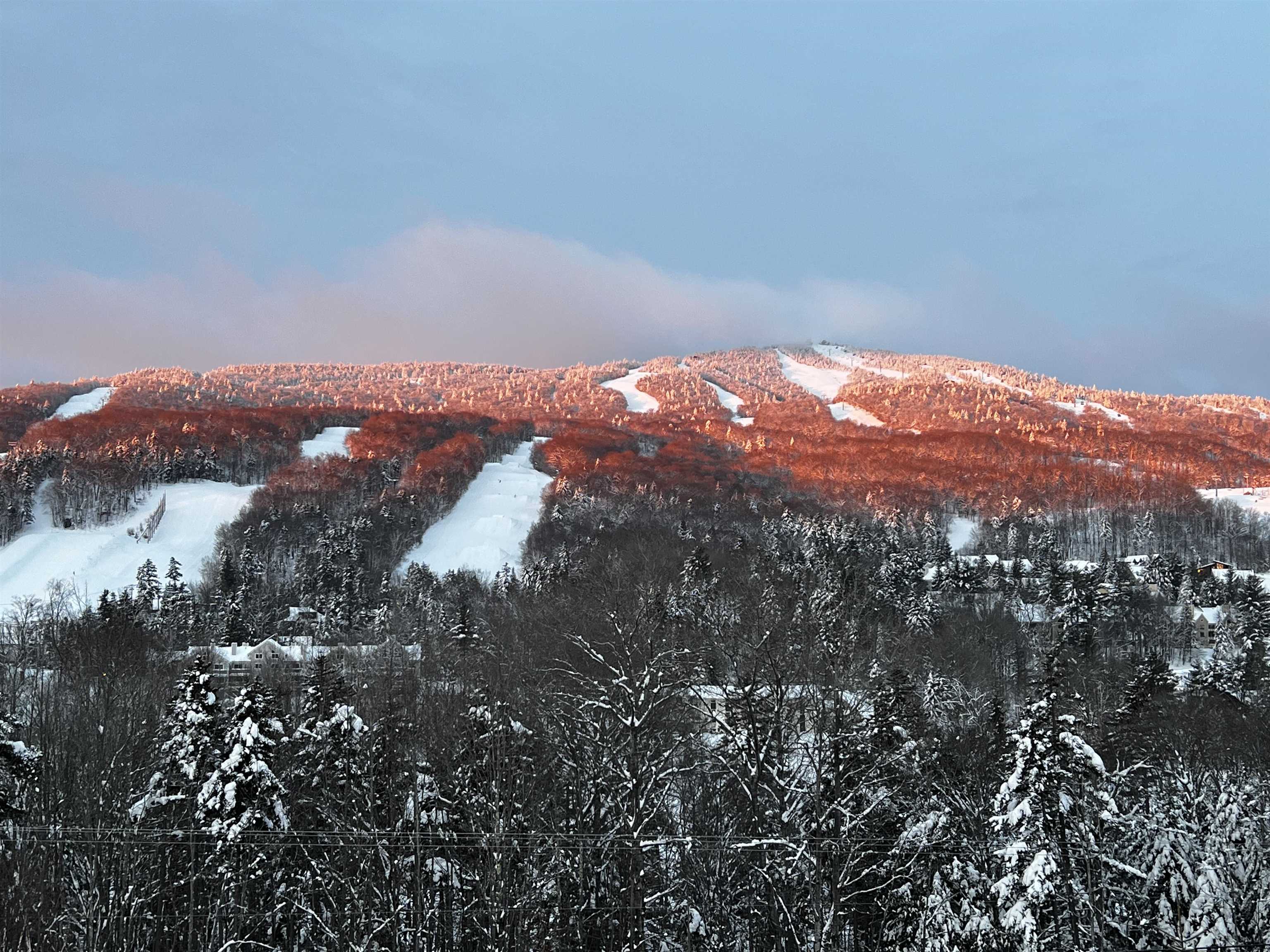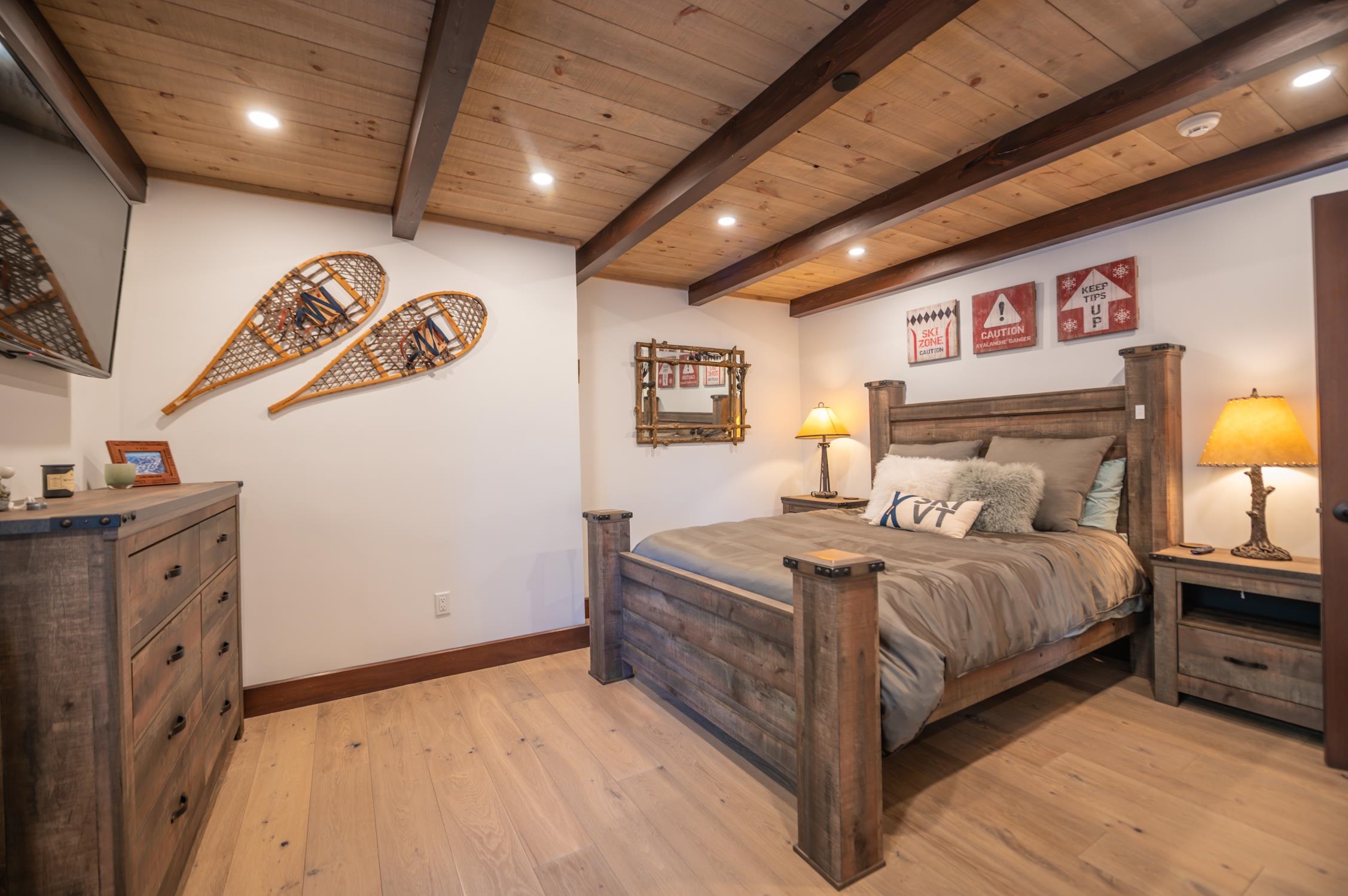 Once in a while, a property comes along that truly leaves you speechless — and this is one of those rare moments. This 5-bedroom, 4.5-bath Boulder Ridge townhome has been meticulously renovated with precision and style at every turn. This is not the Boulder Ridge you've known before, and it's being offered completely turn-key. This immaculate unit sits in an ideal location with unobstructed ski trail views and effortless mountain access, as well as direct sightlines to groomers, fireworks, and stunning sunsets beyond. Inside, a vaulted great room welcomes you with a floor-to-ceiling stone fireplace and large windows that flood the space with natural light. Newly paneled ceilings with exposed beams, white oak floors throughout, and a tiled mudroom entry from the covered front porch with ski locker set the tone for the craftsmanship found at every turn. The expanded chef's kitchen impresses with waterfall concrete counters, stainless appliances, and an oversized island, all open to a spacious dining area and rear deck perfectly positioned to take in the views. Upstairs, the primary suite features stunning ski trail views, custom closet systems, and a spa-like bath with a tiled shower and contemporary pedestal soaking tub. There is a guest bunk room with en suite bath, and a loft office overlooking the great room. The main floor also offers a guest bedroom en suite, and a half bath for ample guests. The finished walkout lower level adds tremendous flexibility, with a large media room, wet bar, a second lockable wine bar, laundry room, two additional bedrooms, a full bath, large owner closets, and walkout access to a hot tub overlooking equally impressive views. Low HOA fees, ample parking, and exterior maintenance included make this the ideal Vermont retreat — focused on enjoyment, not upkeep. The exterior work assessment has been paid in full, so the incoming aesthetic upgrades are yours to enjoy from day one, completely hassle-free.