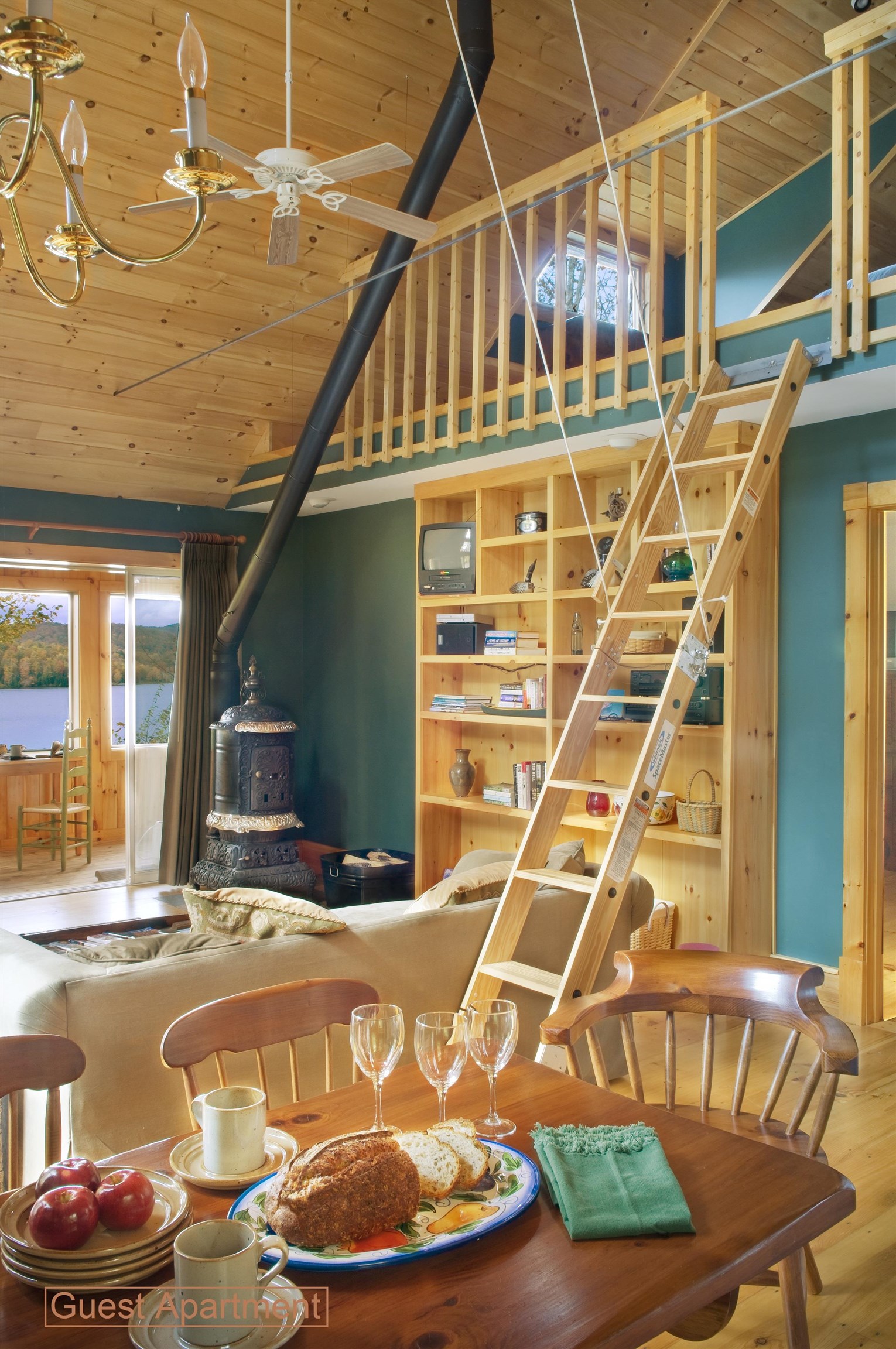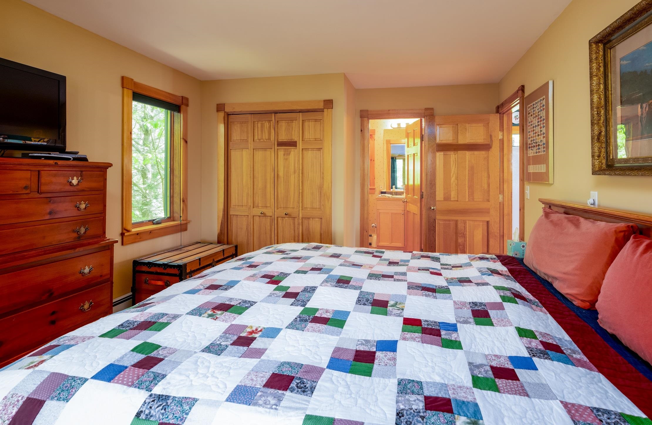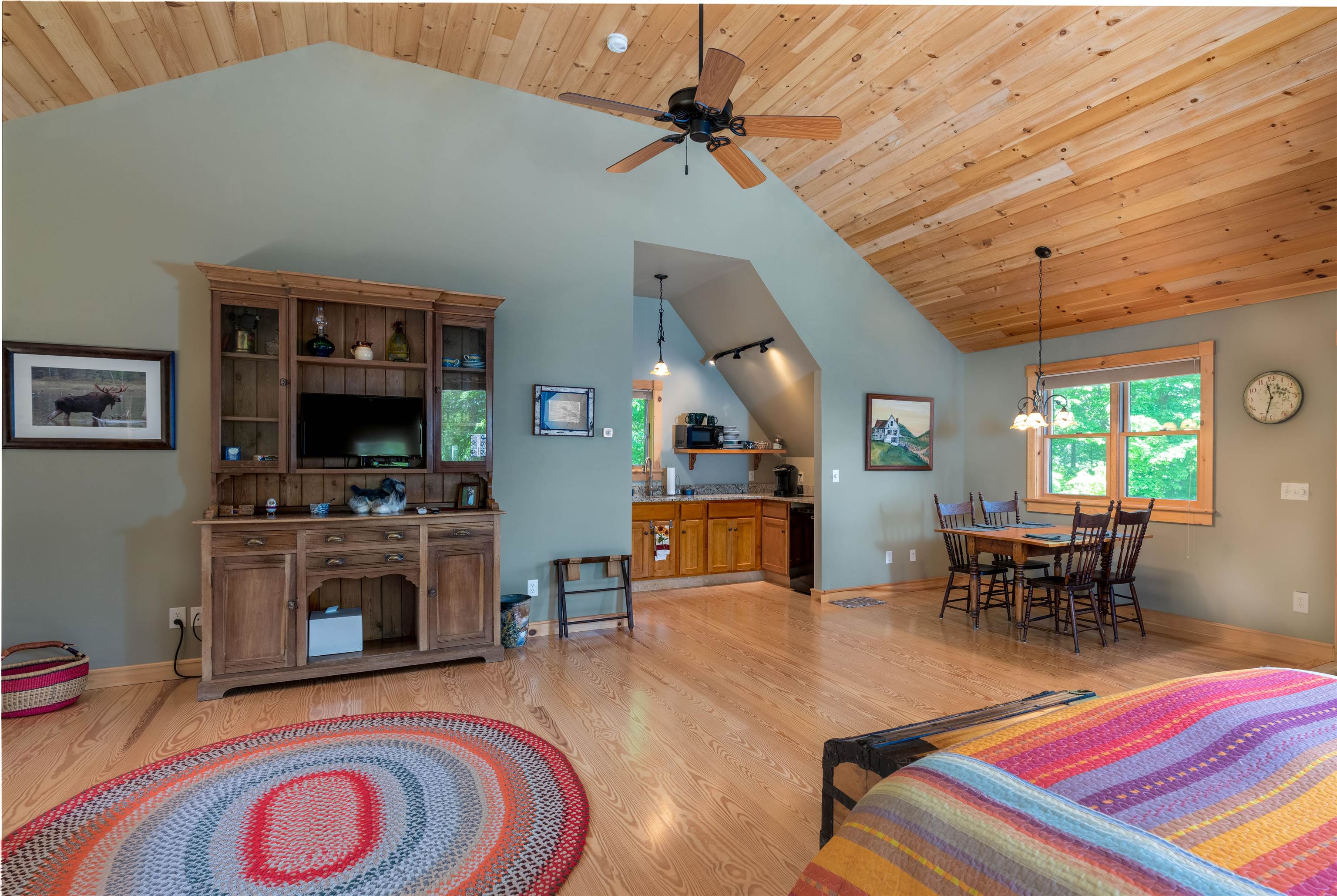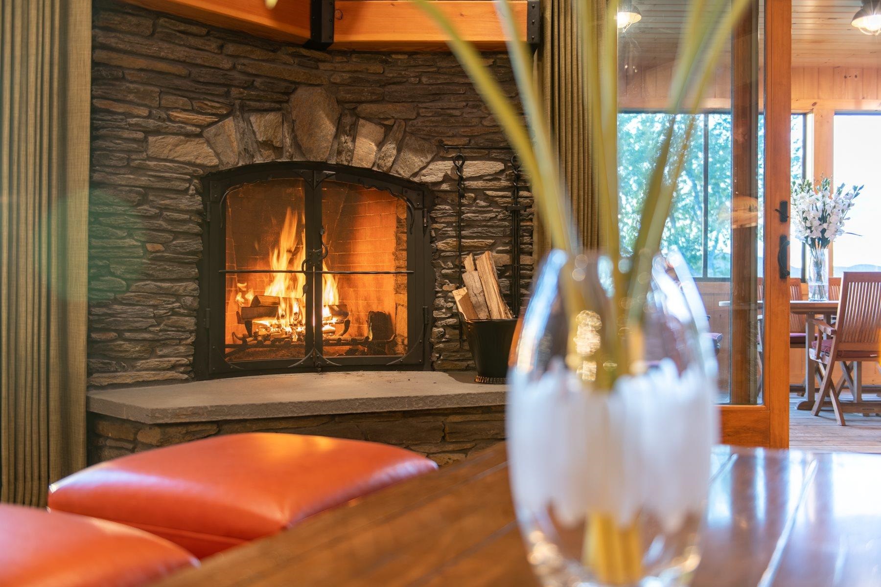 - Blinds, Cathedral Ceiling, Ceiling Fan, Dining Area, Gas Fireplace, Wood Fireplace, Furnished, Hot Tub, Kitchen Island, Kitchen/Dining, Primary BR w/ BA, Natural Light, Natural Woodwork, Skylight, Walk-in Closet, Window Treatment, 1st Floor Laundry
