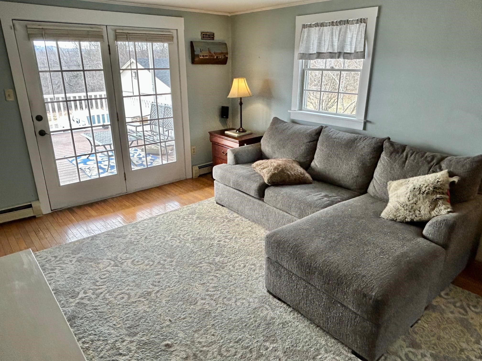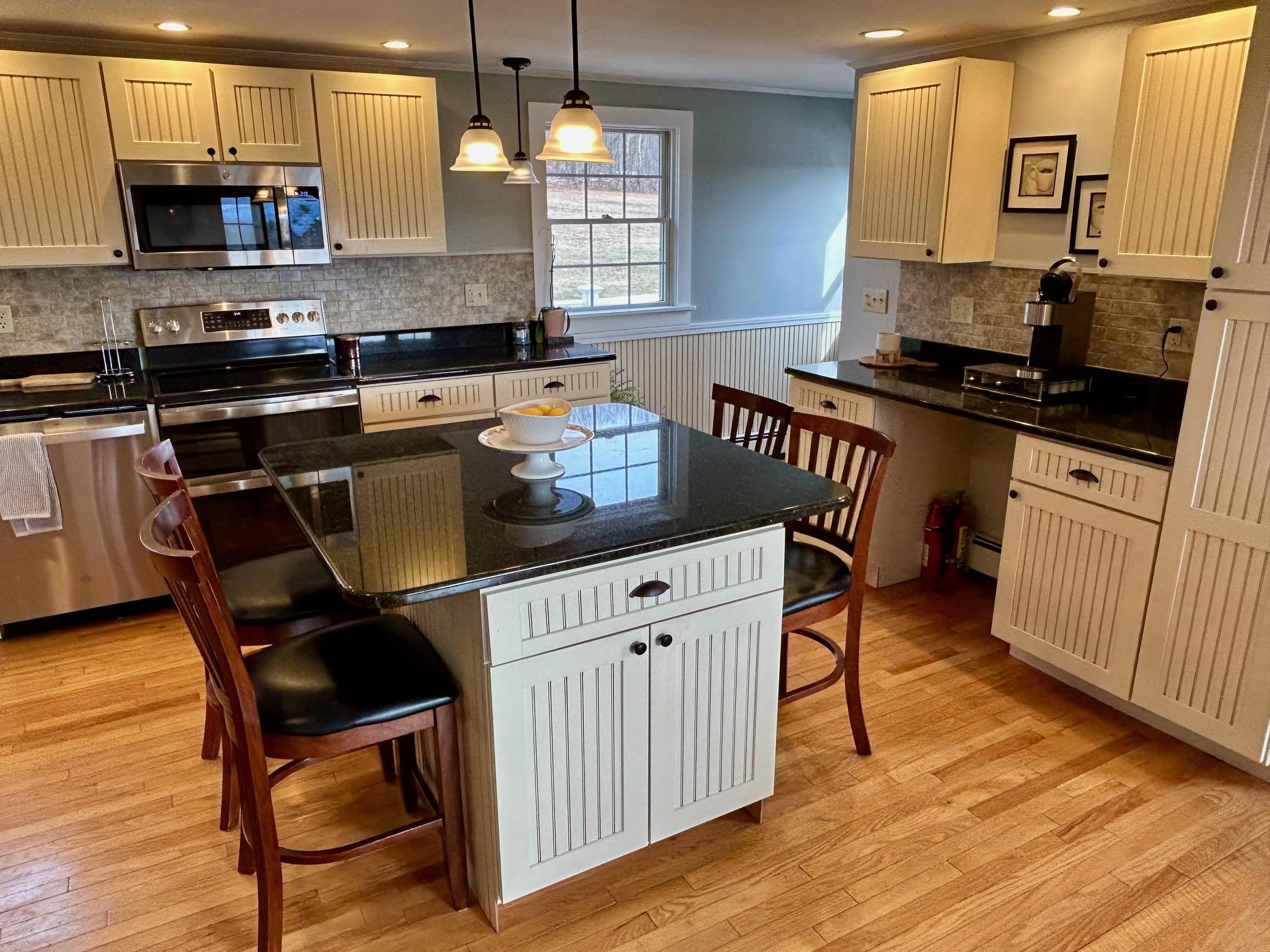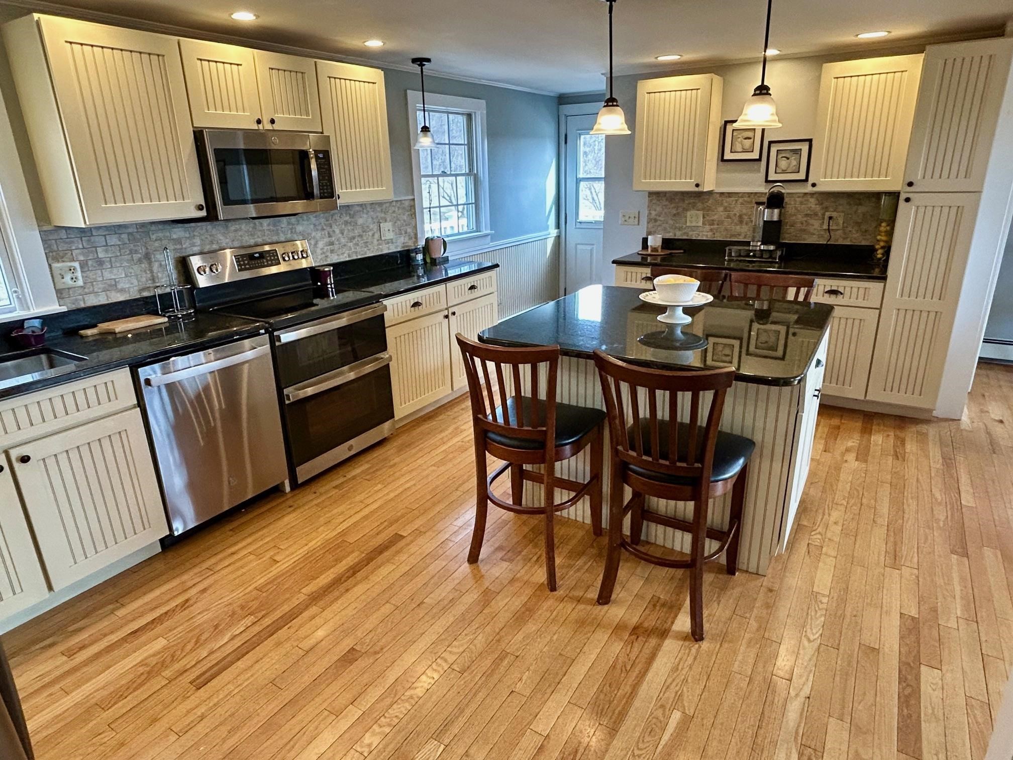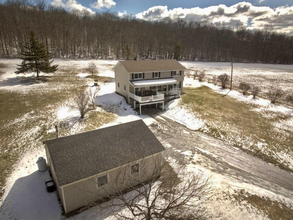 Positioned to capture prized west- and south-facing exposure, the property offers abundant natural light and long-range views toward Killington and the Green Mountains. The heart of the home is a renovated kitchen with shaker-style cabinetry, granite countertops, a dedicated coffee bar, and a large island with seating on both sides. The open dining area flows seamlessly to a grilling deck off the kitchen, extending the gathering space outdoors. The main level is designed for functionality, featuring hardwood flooring, multiple living areas, a propane fireplace, a full bath, and a dedicated office. Upstairs are three generously sized bedrooms, including a primary with double closets, a ¾ bath, and a flexible landing ideal for a workspace or reading nook. The finished walk-out lower level adds fun and functional bonus space with a media room, flexible exercise area, and laundry center. Outside, enjoy mature gardens, a detached two-car garage, and a partially covered front porch perfect for sunsets and entertaining. Set in a tranquil location just minutes to I-89, VAST trails, skiing, and downtown Randolph in the heart of Vermont, this move-in-ready home combines comfort, style, and convenience—ready to impress!