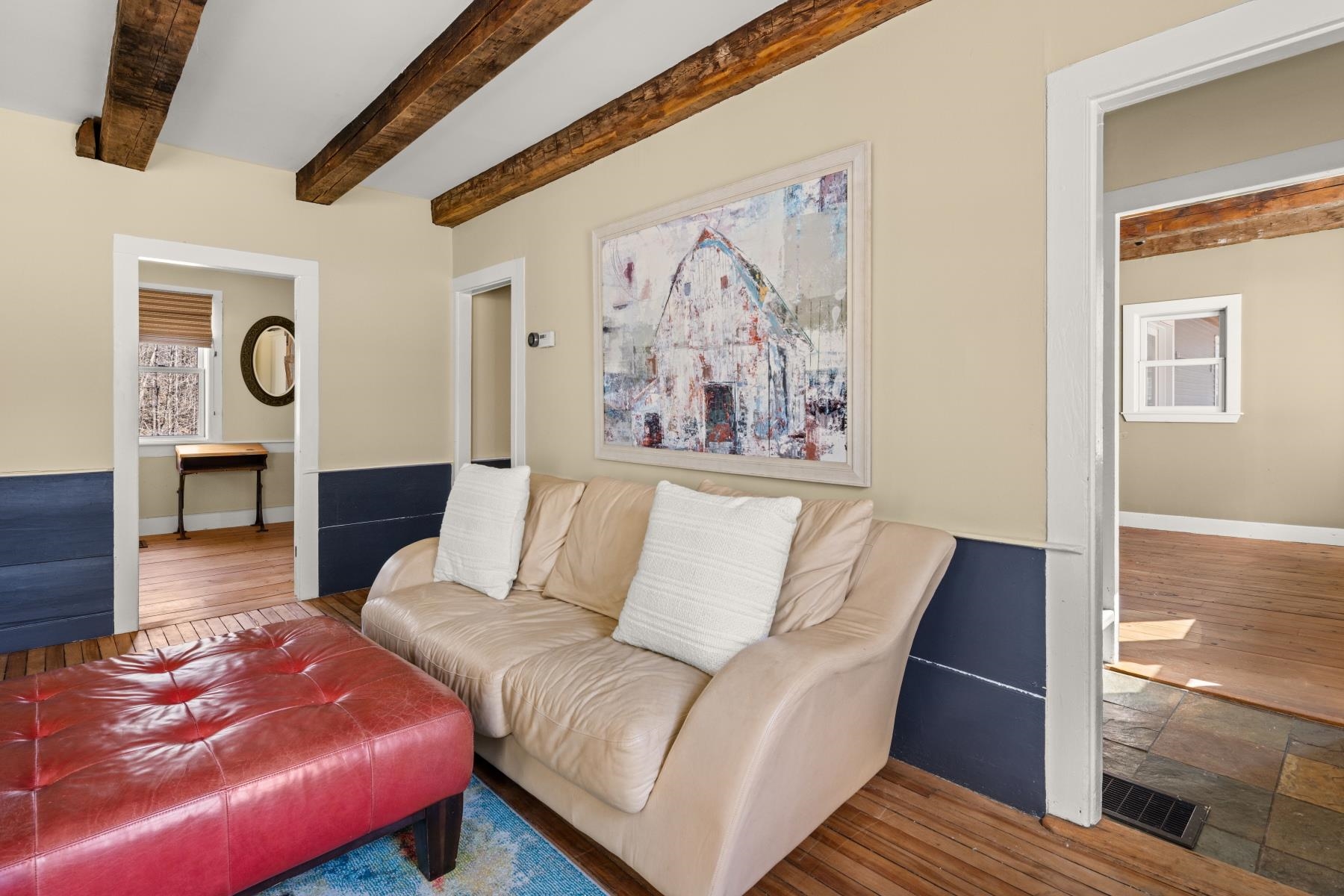 ONE MILE TO MOUNT ELLEN! This antique Cape, set on three acres, blends timeless Vermont character with thoughtful modern updates. The 4-bedroom, 2.5 bathroom home offers exceptional versatility as a primary residence, vacation retreat, or investment property in the heart of the Mad River Valley. Walk into the mudroom and find ample gear storage. Set off the entry, the inviting country kitchen features custom-crafted cabinetry, granite countertops, stainless steel appliances, and a welcoming sitting area centered around a classic farmhouse island with wine rack and beverage cooler. The home offers multiple comfortable living spaces, including a more formal living room with a gas fireplace, a relaxed family room ideal for casual gatherings and a dedicated dining area. A spacious screened-in porch provides a wonderful spot to unwind, while the sundeck features a hot tub overlooking the expansive backyard. Upstairs, the primary bedroom includes a beautifully appointed en-suite bath, while two additional guest bedrooms share a thoughtfully designed full bathroom. Find an additional sitting room, game room, and an office space on the upper level. The lower, walkout level provides excellent recreation space, perfect for a media room or ski tuning setup. Outside, enjoy manicured perennial gardens, a charming red barn, and potting shed. The property borders two streams and has nearby access to trails. The property is ideally located close to the Catamount Trail and Mad River Valley Path, and just minutes from Mad River Glen and Sugarbush ski areas with shuttle access nearby. A rare opportunity to enjoy year-round recreation and the outdoor-focused lifestyle of Vermont’s Mad River Valley. See this turn-key property with tremendous Vermont charm today!