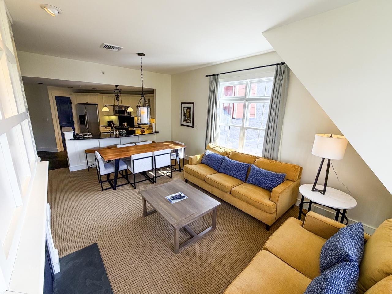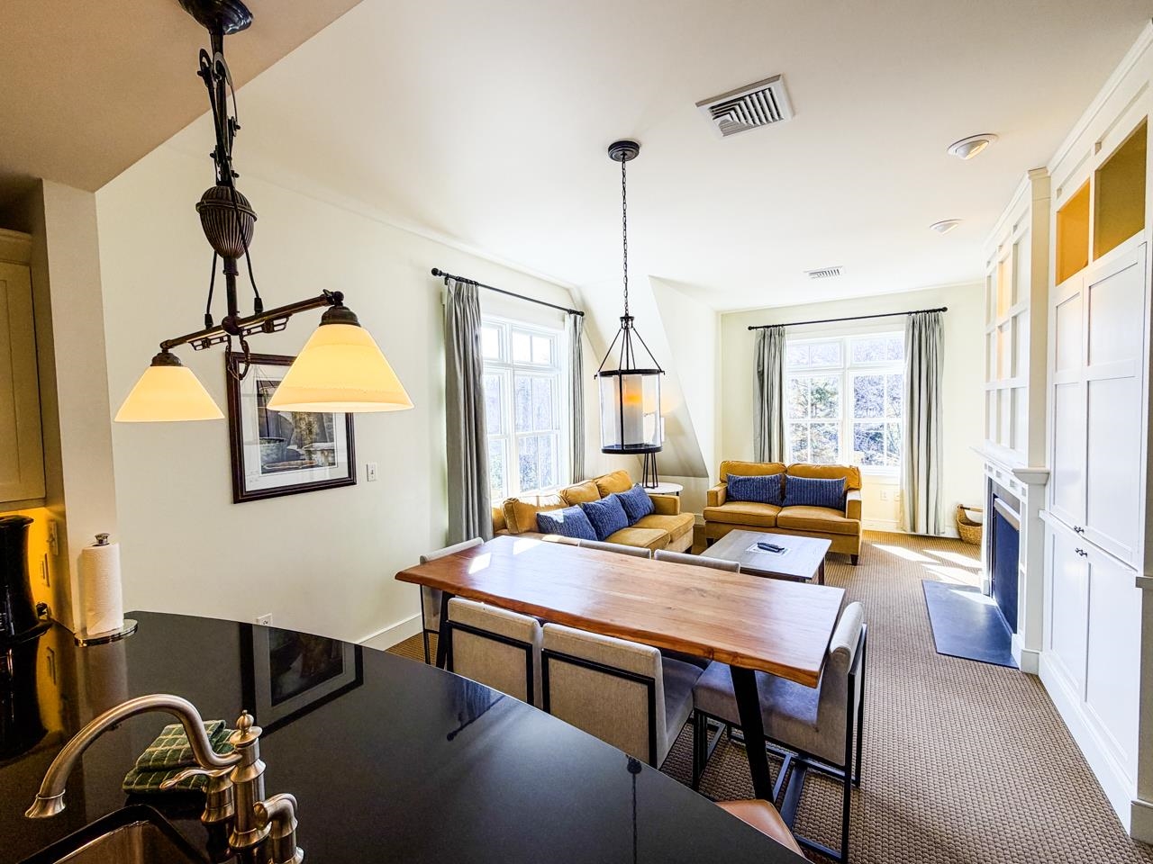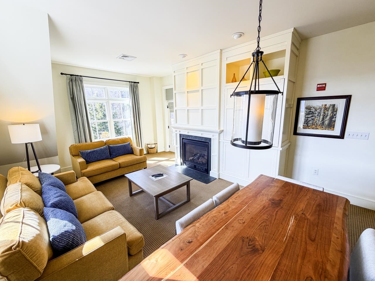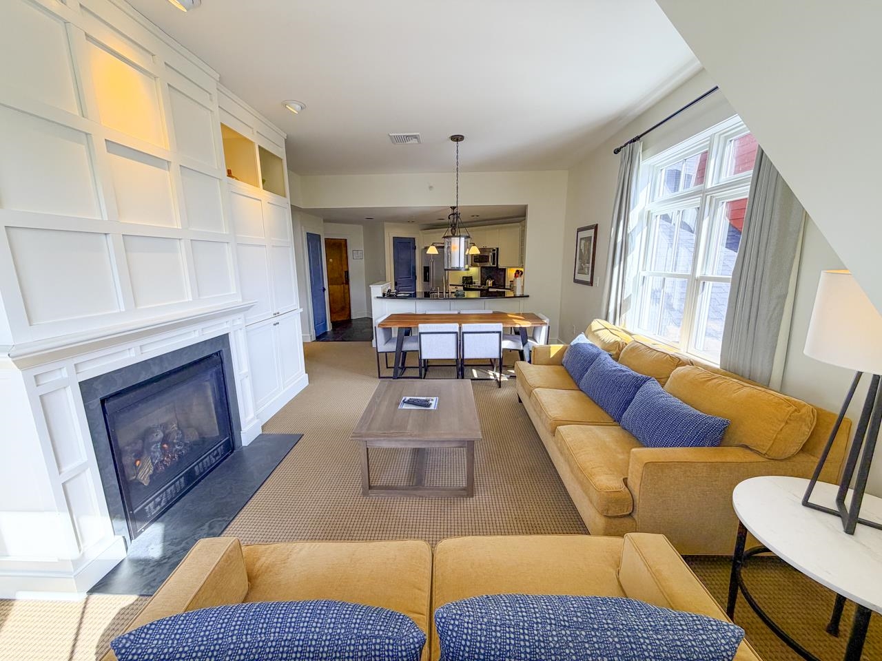 - Blinds, Dining Area, Draperies, Gas Fireplace, Furnished, Kitchen/Dining, Kitchen/Living, Primary BR w/ BA, Natural Light, Whirlpool Tub, Window Treatment