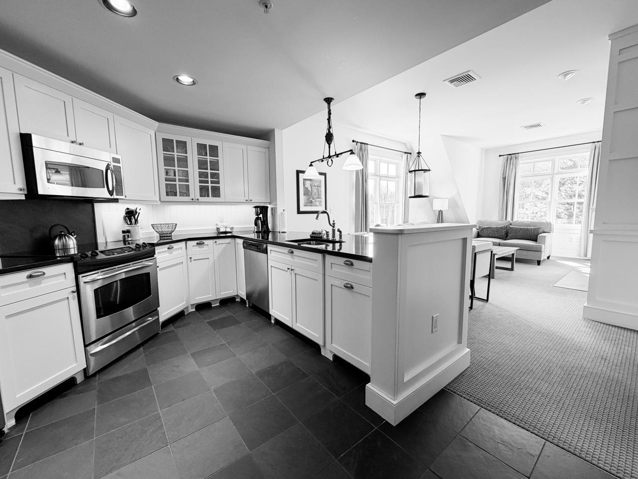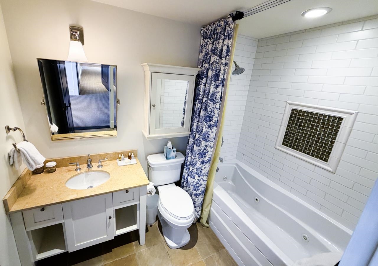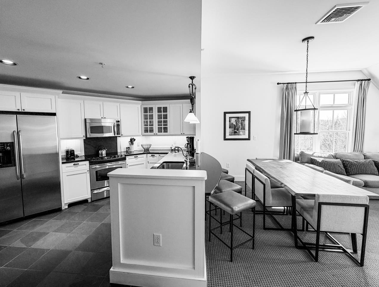 - Blinds, Dining Area, Draperies, Gas Fireplace, Furnished, Kitchen/Dining, Kitchen/Living, Primary BR w/ BA, Natural Light, Whirlpool Tub, Window Treatment