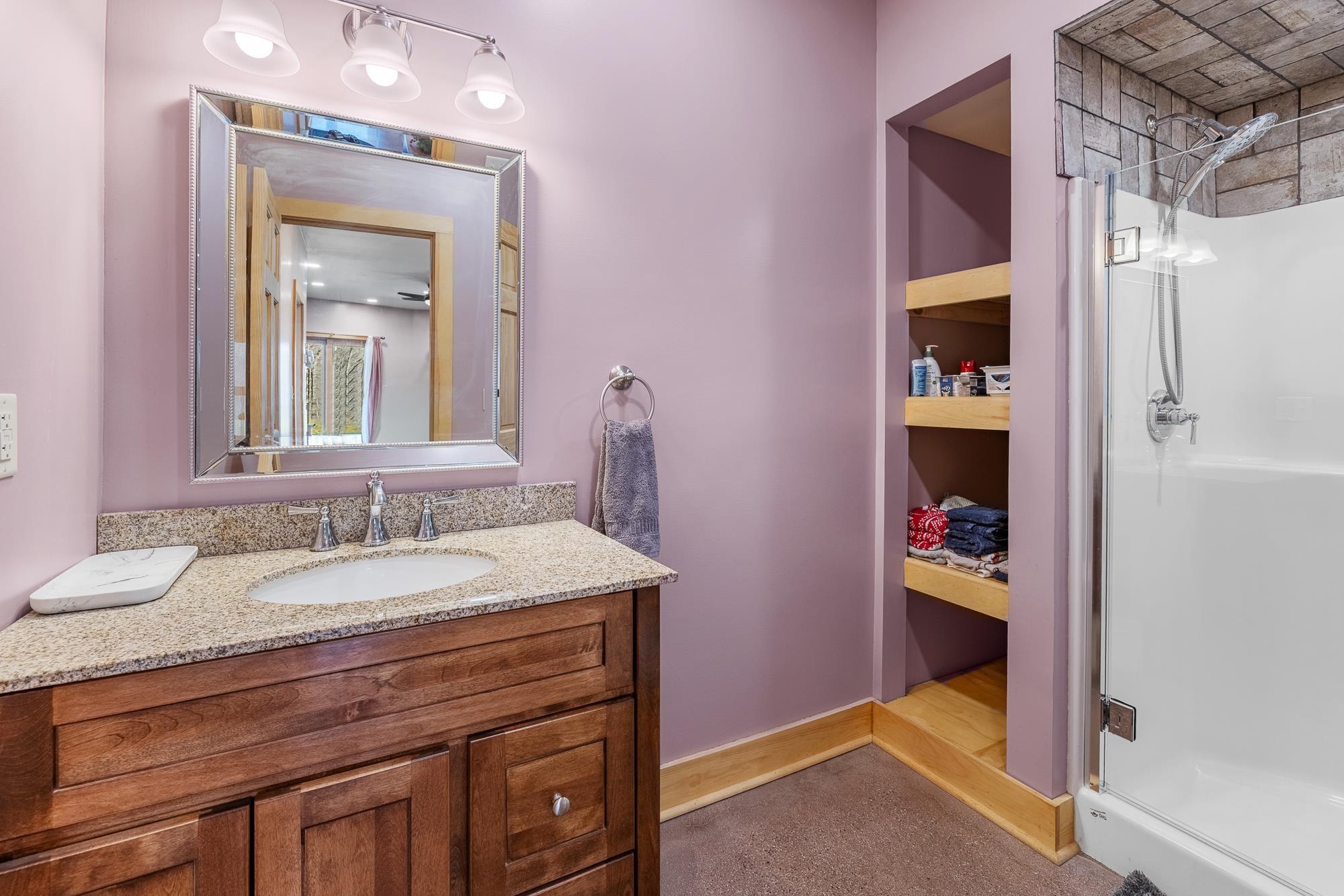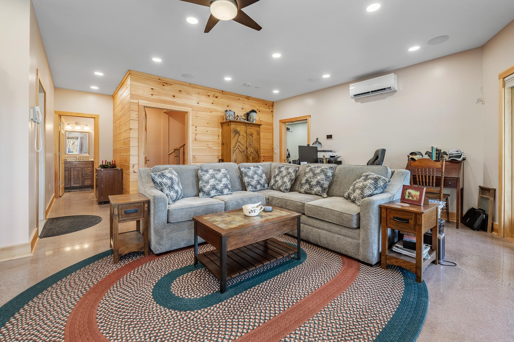 - Blinds, Cathedral Ceiling, Ceiling Fan, Dining Area, 1 Fireplace, Home Theater Wiring, Kitchen/Dining, Laundry Hook-ups, LED Lighting, Primary BR w/ BA, Natural Light, Natural Woodwork, Security, Soaking Tub, Indoor Storage, Surround Sound Wiring, Vaulted Ceiling, Walk-in Closet, Window Treatment, Wood Stove Insert, 1st Floor Laundry, Smart Thermostat