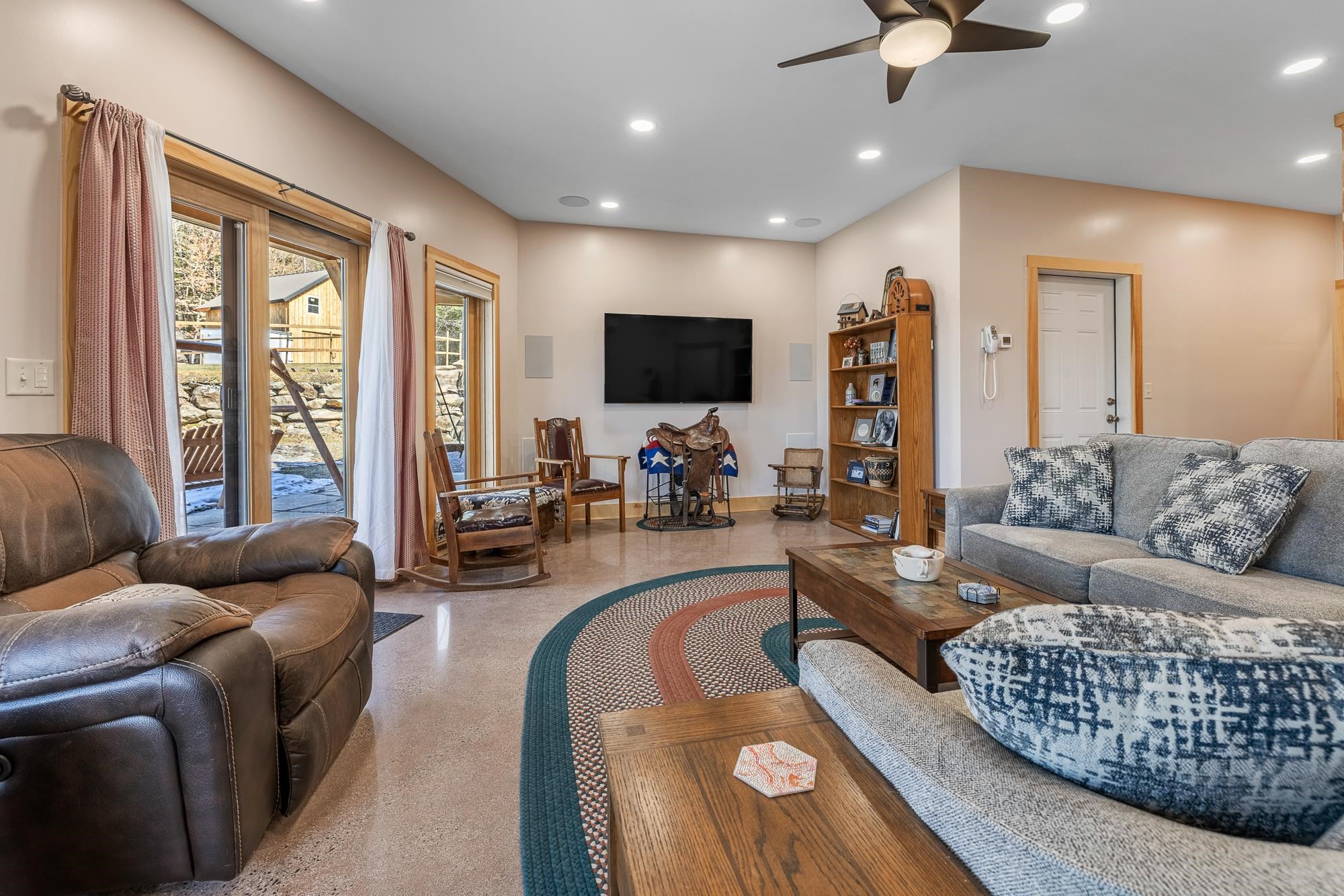 Set against sweeping Vermont hills and surrounded by extraordinary privacy, this custom smart home blends the warmth of a mountain retreat with the intelligence and convenience today’s buyers want. Soaring ceilings, walls of glass, wide-plank wood floors, a dramatic stone fireplace, and a chef’s kitchen create the look and feel of high-end new construction, while expansive decking, a hot tub, and panoramic views extend the living experience outdoors. Built for the technology-focused buyer, the home is fully wired with Cat9 and direct fiber to every room, with a RUSS whole-house interface and in-room monitors for integrated control of security, lighting, built-in speakers, and everyday comfort. Lutron lighting, LED lighting, removable candle lighting, picture lights, dimmable fans, Wi-Fi Monogram smart appliances, SmartHQ connectivity, app-controlled heating and cooling, radiant heat, a LifeBreath air system, unified cameras, and a fully wired security system make this a truly future-ready residence. The lower level adds flexible living with a media room featuring built-in speakers, extra laundry hookups, and space for recreation or guests. Outside, automated Jellyfish lighting, a switched waterfall, buried utilities, and a whole-house generator on its own propane tank elevate both beauty and peace of mind. The barn is wired and plumbed for future apartment potential, and the property also includes an additional permit for a three-bedroom septic system—offering rare flexibility, expansion potential, and lasting value.