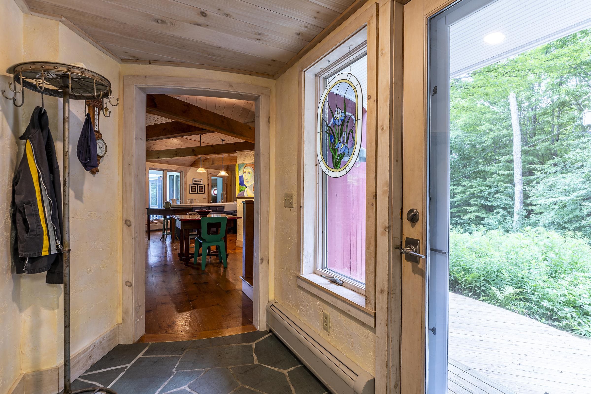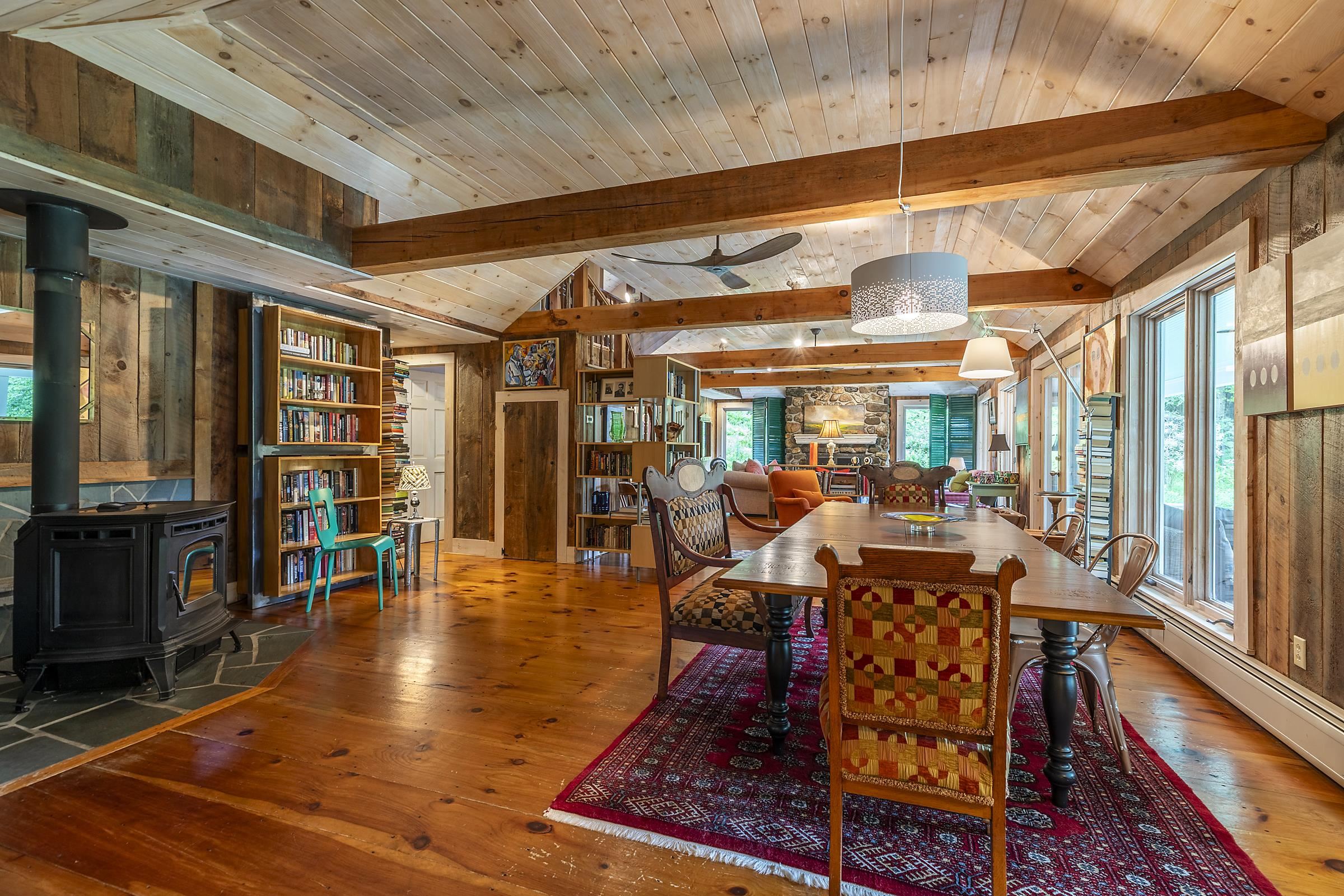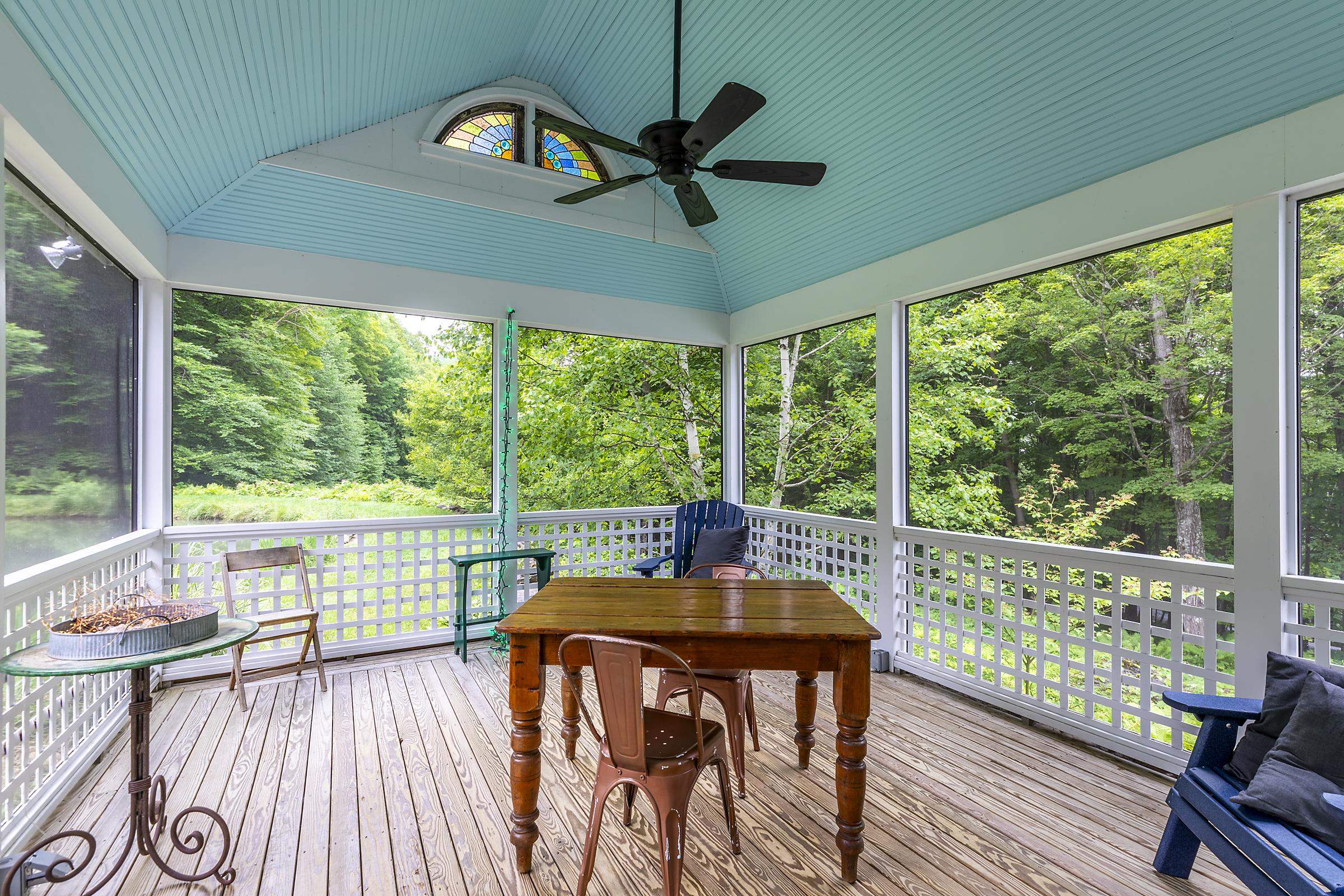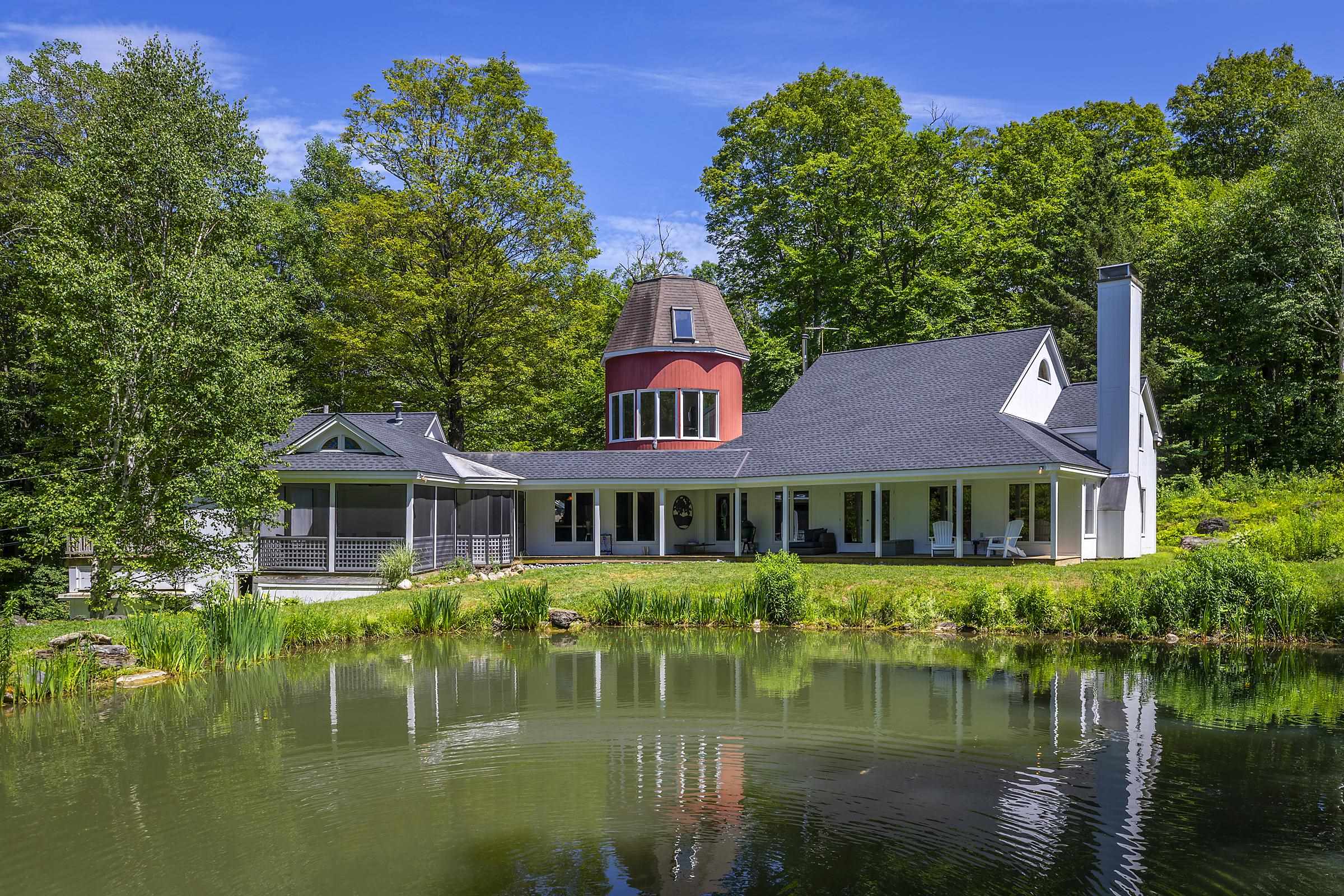 Take a drive up Nichols Hill Road to Fern Hill and head to the very top of the long bending driveway to find a serene, picturesque artist’s retreat 3 minutes from historic Dorset Village. Refreshingly private, quiet and secluded, drenched in natural light. With broad mountain vistas of Mother Myrick and Merck Forest, the top of the property backs gently into a beautiful private forest. The entire property has been carefully curated to encourage wildlife, a rewilding effort in place for 9 years, toxin and poison free. The large, pristine, spring fed swimming pond is the year round home to approximately 50+ healthy colorful Koi and overlooks a soft meadow bordered by old growth forest habitat, much to the delight of birds, butterflies, dragonflies, bees and abundant wildlife. The house is large, eclectic and rustic with a lodge feeling. A simple open concept design with lots of room and a farmhouse kitchen. Abundant windows throughout invite in and embrace the changing light and glistening view all day long. Distressed wide-plank floors, repurposed barn wood walls and beams, natural wood tray ceilings, curving wooden bookshelves and a curving staircase that leads to a half moon studio filled with natural light and sweeping views. Off the farmhouse kitchen find the very substantial screen porch and long sitting porch overlooking the gorgeous, vibrant, spring fed pond which reflects the changing light and soft scenery all day long. Natural beauty and peace, completely private and yet so close to everything.