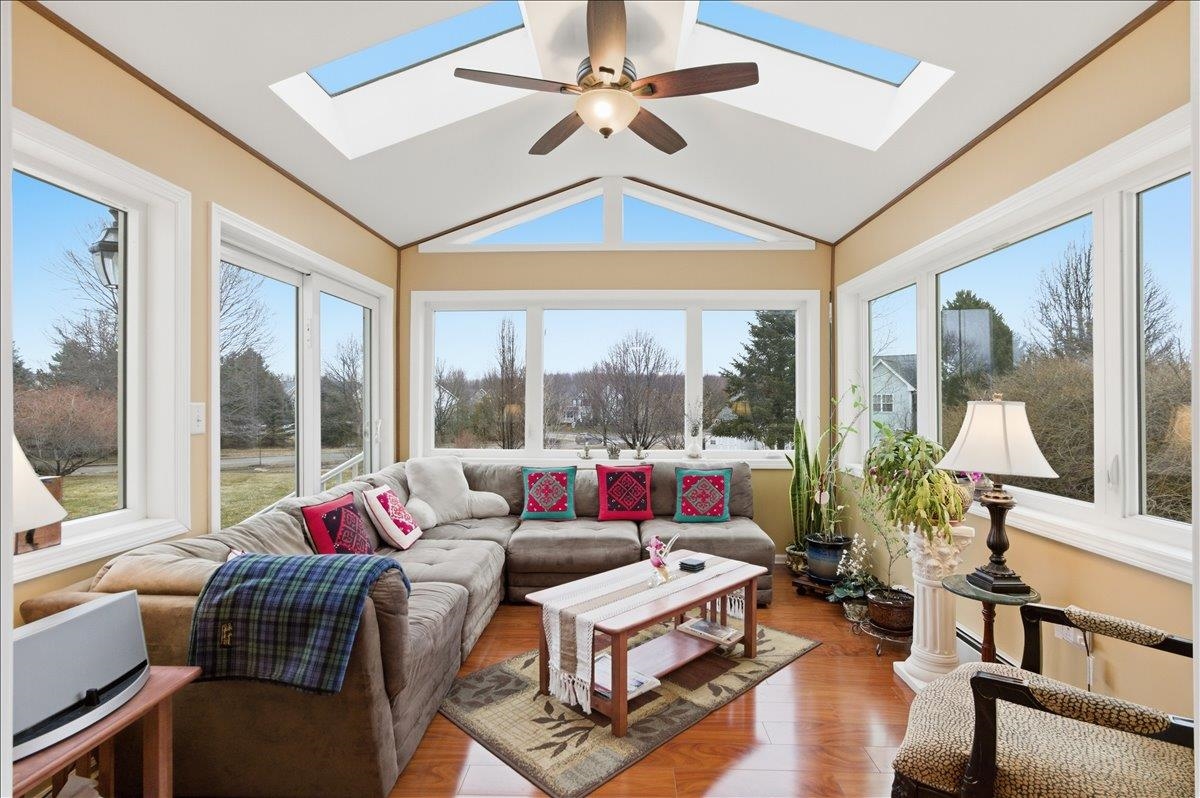 This meticulously maintained 4 bedroom home, built in 1998, offers plenty of living space on a generous 0.46-acre lot. The layout features a spacious primary suite with his and her closets and a private full bath, along with 2.5 bathrooms, including a convenient first floor half bath. The renovated kitchen is a true centerpiece, showcasing stainless steel appliances, a large extended island, and a generous pantry perfect for both everyday living and entertaining. Hardwood floors run throughout the home, complemented by upgraded recessed lighting and a cozy gas fireplace with a custom built-in TV feature in the living room. A standout feature is the all-season heated, east facing sunroom, offering year round enjoyment and natural light. The finished basement adds flexible bonus space, while a large fourth bedroom and additional enhancements like bedroom ceiling fans, new windows throughout most of the home, and a mini-split AC/heat system add comfort and efficiency. Exterior highlights include a front porch with Trex decking, a widened and freshly paved driveway in 2024, a backyard shed, and an attached 2-car insulated garage with a new insulated door. A new roof installed in 2024 provides added peace of mind. This home blends thoughtful upgrades, space, and functionality in a beautifully cared-for setting.