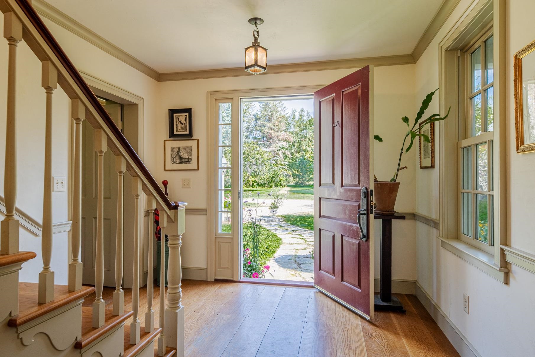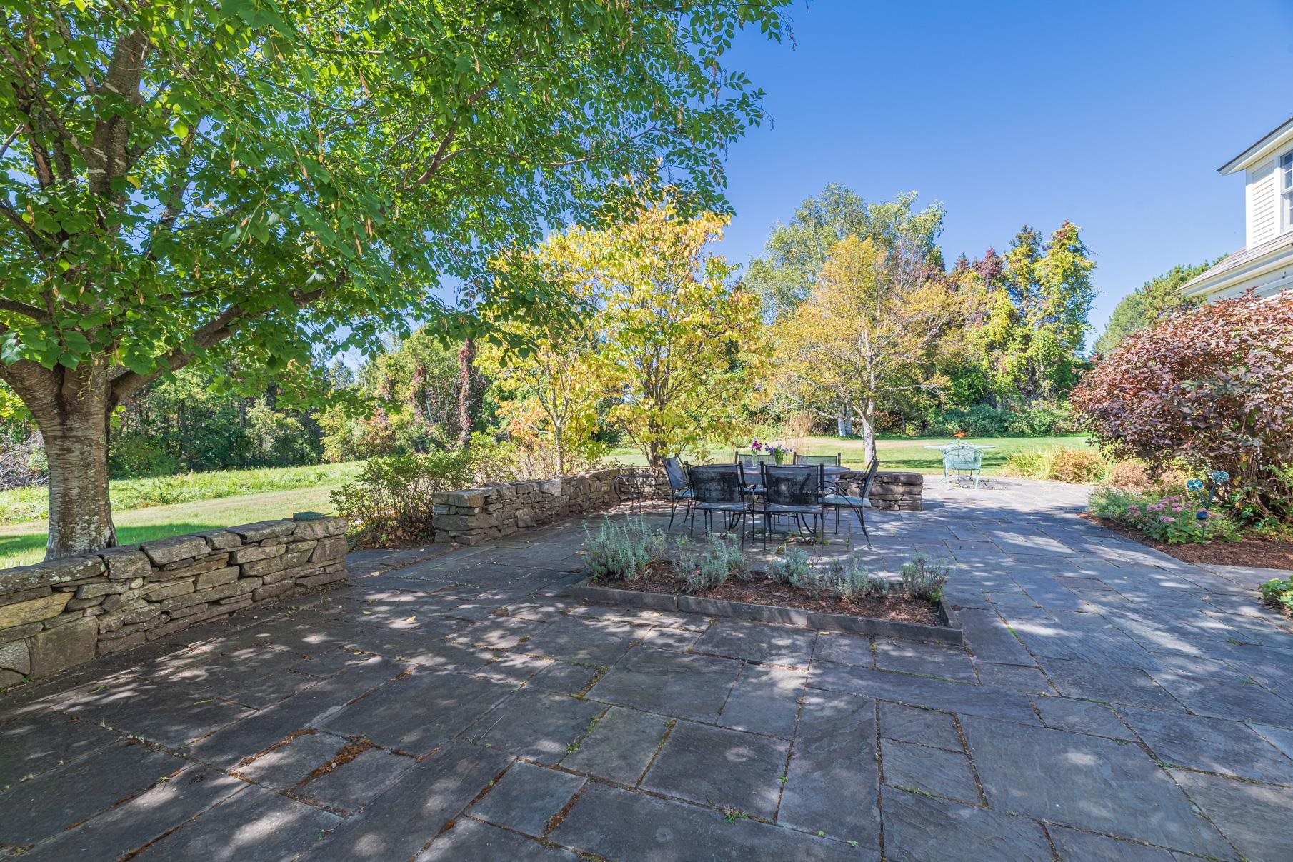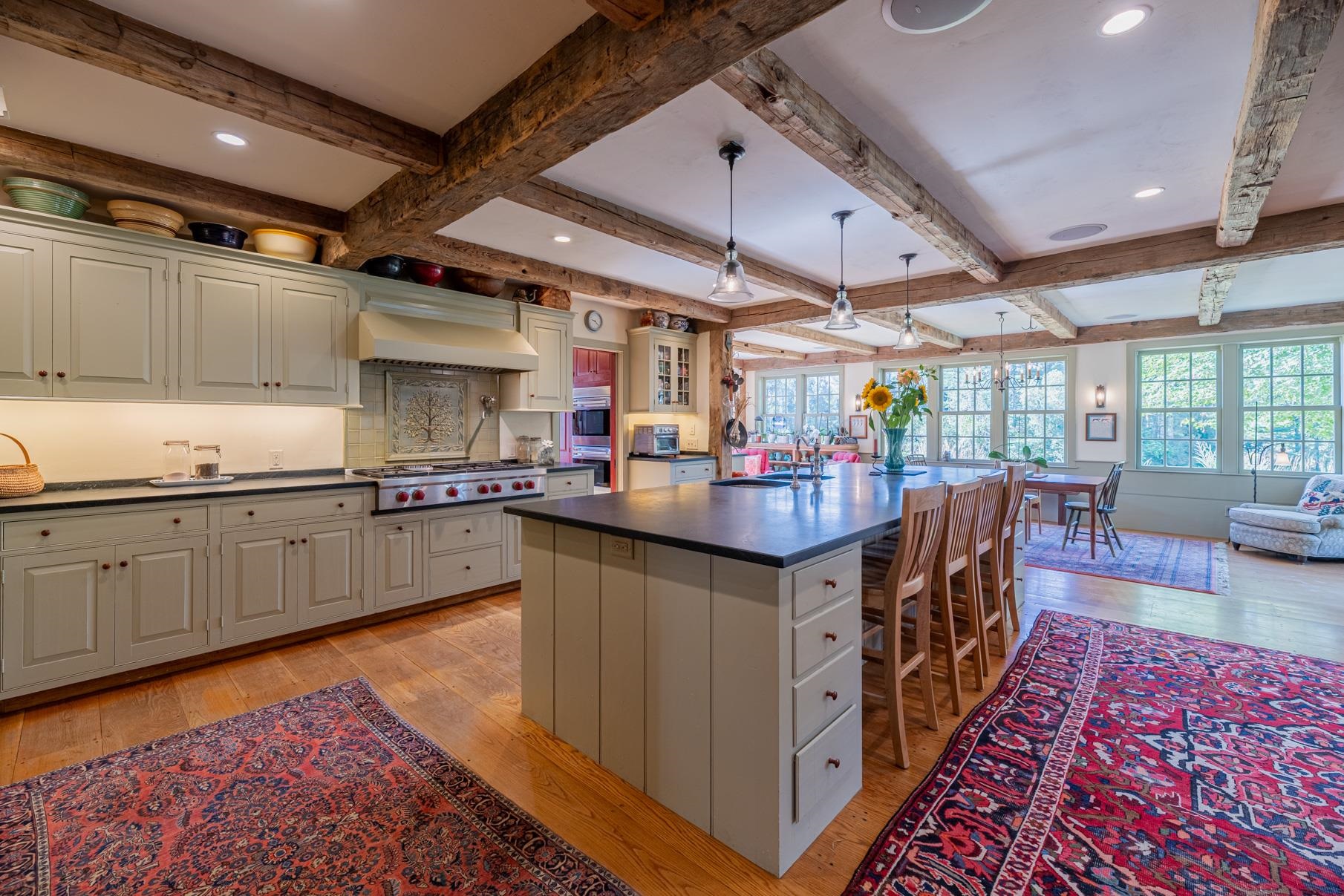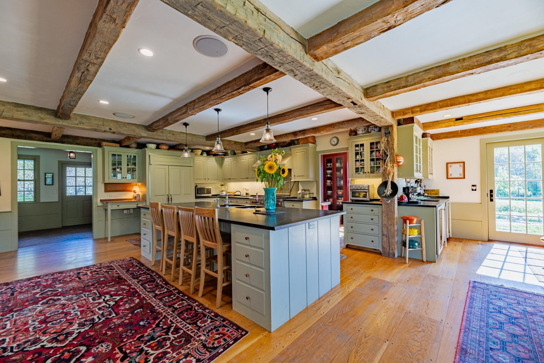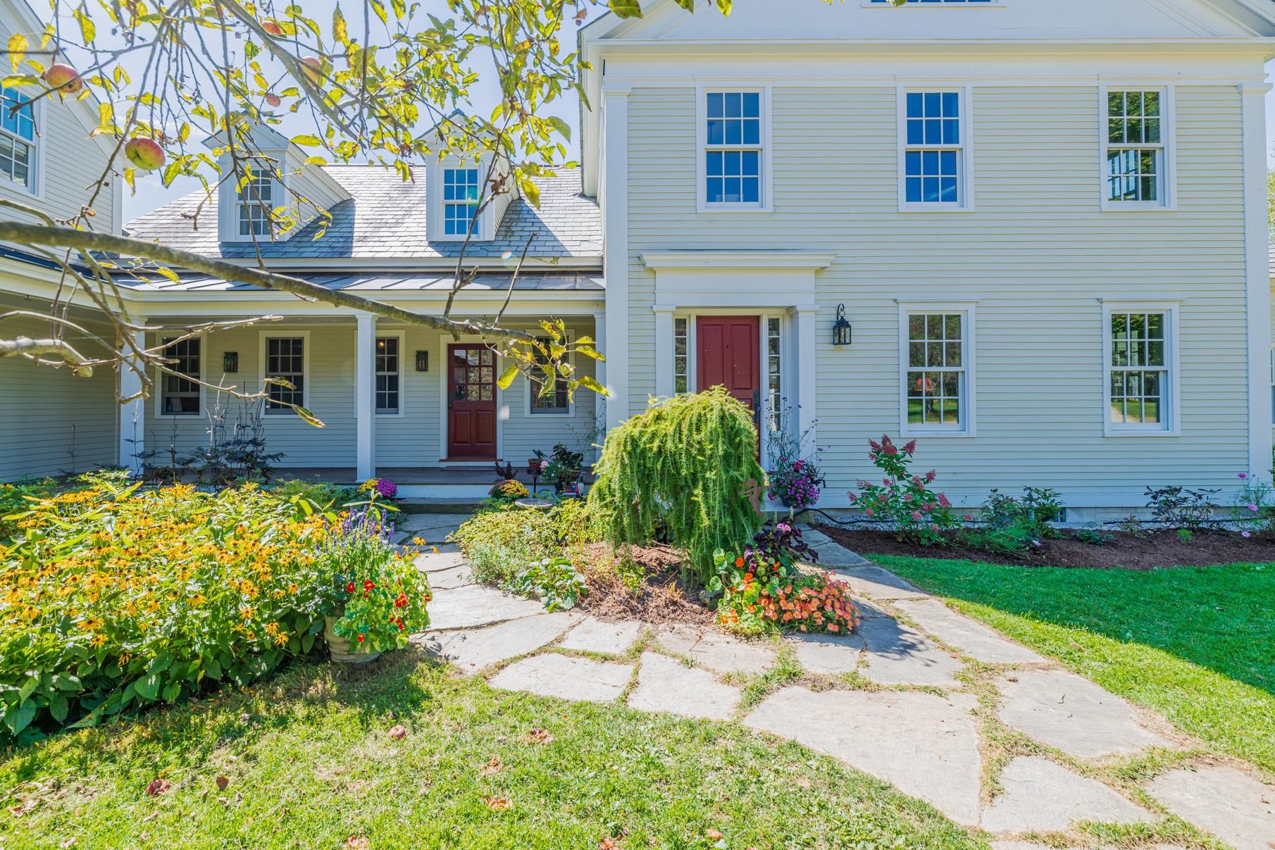 Located in the desirable Green Peak Orchard, this exceptional custom Greek Revival residence is set on 9.9 private acres surrounded by mature landscaping, stone walls, and terraces. Thoughtfully designed with timeless craftsmanship, the home features wide-plank floors, hand-plastered walls and ceilings, custom moldings, historic reproduction lighting, and finely crafted wainscoting and cabinetry. Slate and copper roofs, along with Vermont marble and soapstone, enhance the home’s distinctive character. A welcoming brick-floored mudroom opens to the heart of the home—an expansive, sun-filled chef’s kitchen with butler’s pantry, dining area, and bar, all with direct access to a charming kitchen garden for fresh herbs and seasonal blooms. The adjoining keeping room with fireplace flows seamlessly into a rustic family/sunroom highlighted by a striking Vermont fieldstone fireplace. French doors from both spaces open to a gracious slate terrace, creating ideal indoor-outdoor living. A book-lined library offers a quiet retreat, while a first-floor bedroom with en suite bath provides comfort and flexibility for guests. Upstairs, the primary suite features a spacious spa-like bath. Three additional bedrooms and two full baths offer ample accommodations. Radiant heat throughout ensures year-round comfort. The grounds are equally impressive, with curated landscaping, stonework, outdoor shower, and hot tub for relaxing under the stars. Completing the property is a two-story attached party barn/workshop, an attached two-car garage with loft storage and attached garden shed. A rare offering combining classic New England elegance with modern comfort—must be seen to be fully appreciated. All measurements approximate.