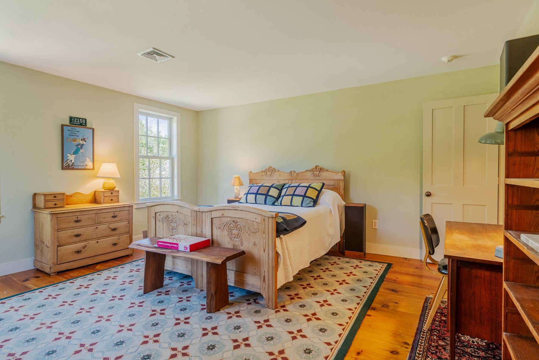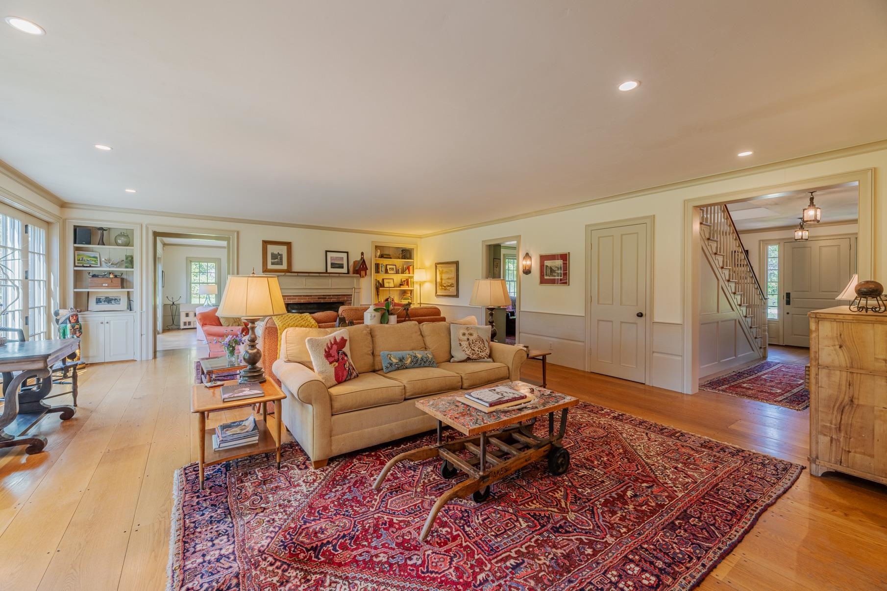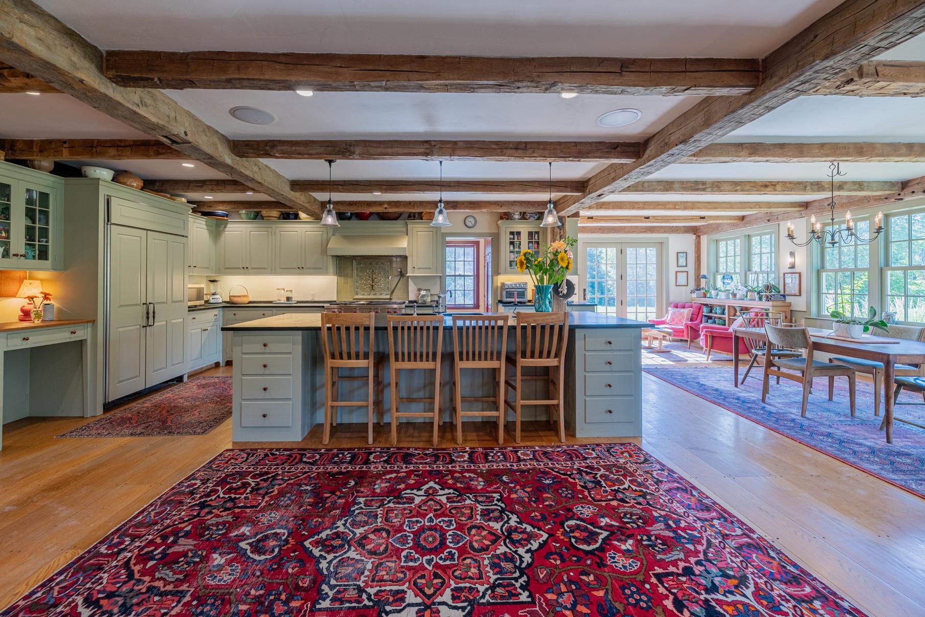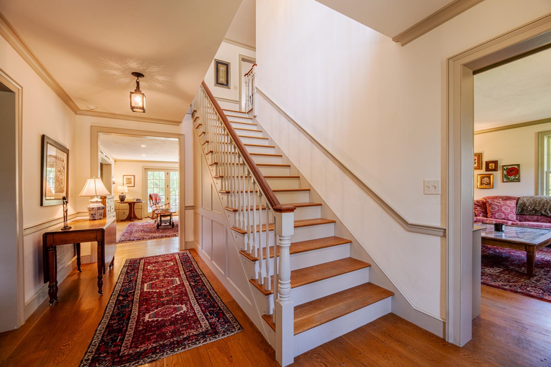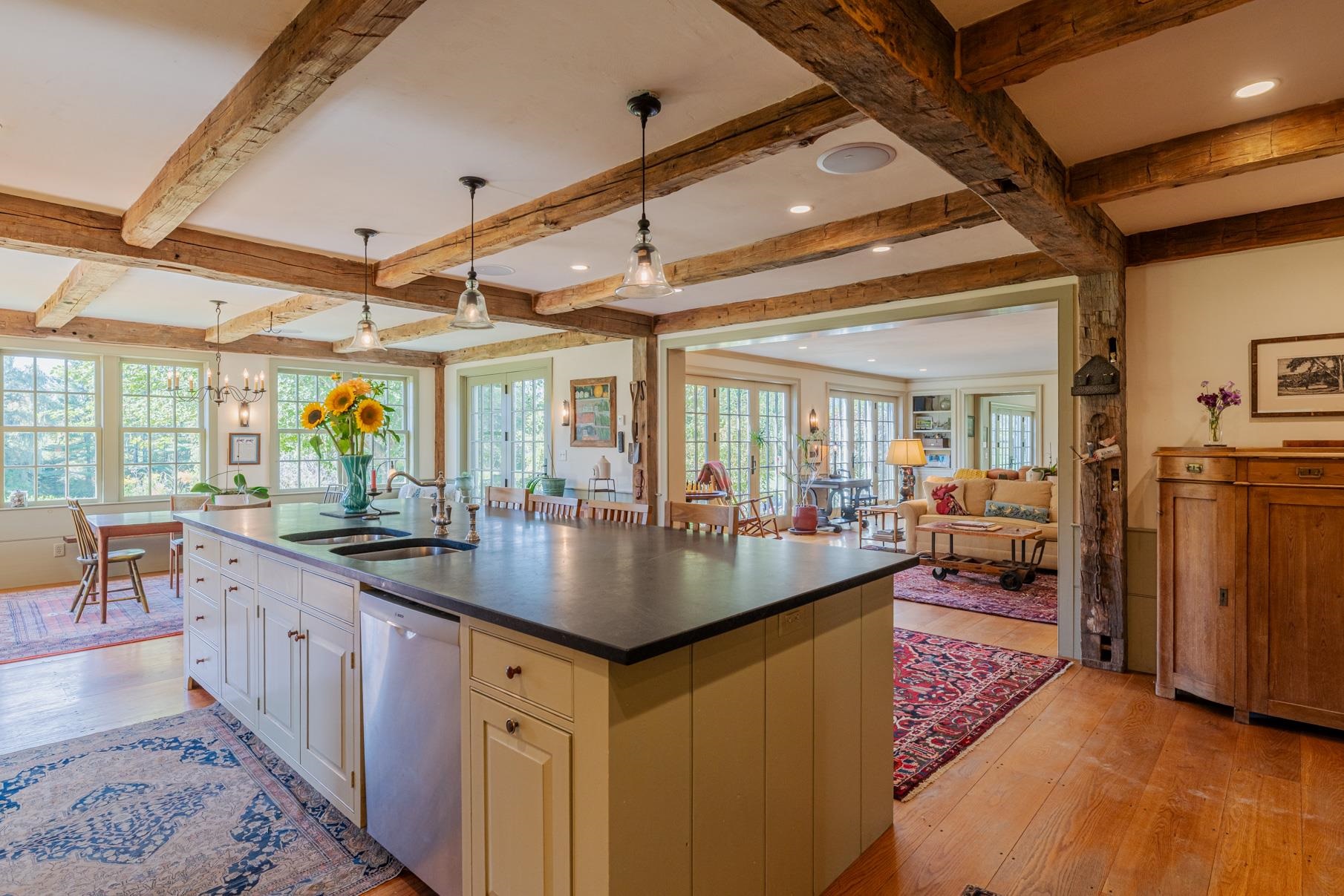 Located in the desirable Green Peak Orchard, this exceptional custom Greek Revival residence is set on 9.9 private acres surrounded by mature landscaping, stone walls, and terraces. Thoughtfully designed with timeless craftsmanship, the home features wide-plank floors, hand-plastered walls and ceilings, custom moldings, historic reproduction lighting, and finely crafted wainscoting and cabinetry. Slate and copper roofs, along with Vermont marble and soapstone, enhance the home’s distinctive character. A welcoming brick-floored mudroom opens to the heart of the home—an expansive, sun-filled chef’s kitchen with butler’s pantry, dining area, and bar, all with direct access to a charming kitchen garden for fresh herbs and seasonal blooms. The adjoining keeping room with fireplace flows seamlessly into a rustic family/sunroom highlighted by a striking Vermont fieldstone fireplace. French doors from both spaces open to a gracious slate terrace, creating ideal indoor-outdoor living. A book-lined library offers a quiet retreat, while a first-floor bedroom with en suite bath provides comfort and flexibility for guests. Upstairs, the primary suite features a spacious spa-like bath. Three additional bedrooms and two full baths offer ample accommodations. Radiant heat throughout ensures year-round comfort. The grounds are equally impressive, with curated landscaping, stonework, outdoor shower, and hot tub for relaxing under the stars. Completing the property is a two-story attached party barn/workshop, an attached two-car garage with loft storage and attached garden shed. A rare offering combining classic New England elegance with modern comfort—must be seen to be fully appreciated. All measurements approximate.