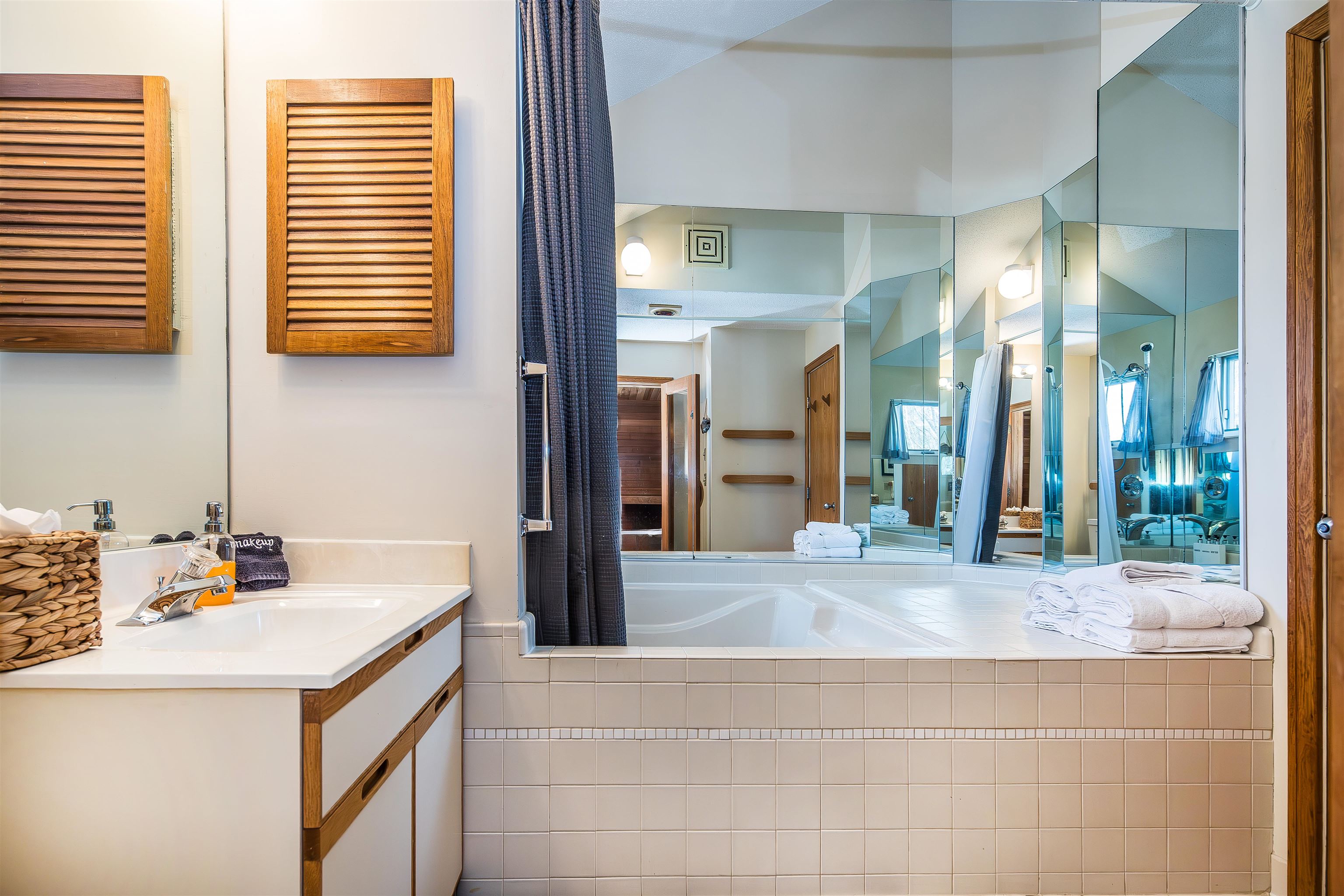 - Blinds, Cathedral Ceiling, Ceiling Fan, Dining Area, Draperies, Fireplace Screens/Equip, Wood Fireplace, 1 Fireplace, Furnished, Hearth, Kitchen/Dining, Primary BR w/ BA, Natural Light, Natural Woodwork, Sauna, Skylight, Soaking Tub, Indoor Storage, Vaulted Ceiling, Window Treatment, Programmable Thermostat, Smart Thermostat