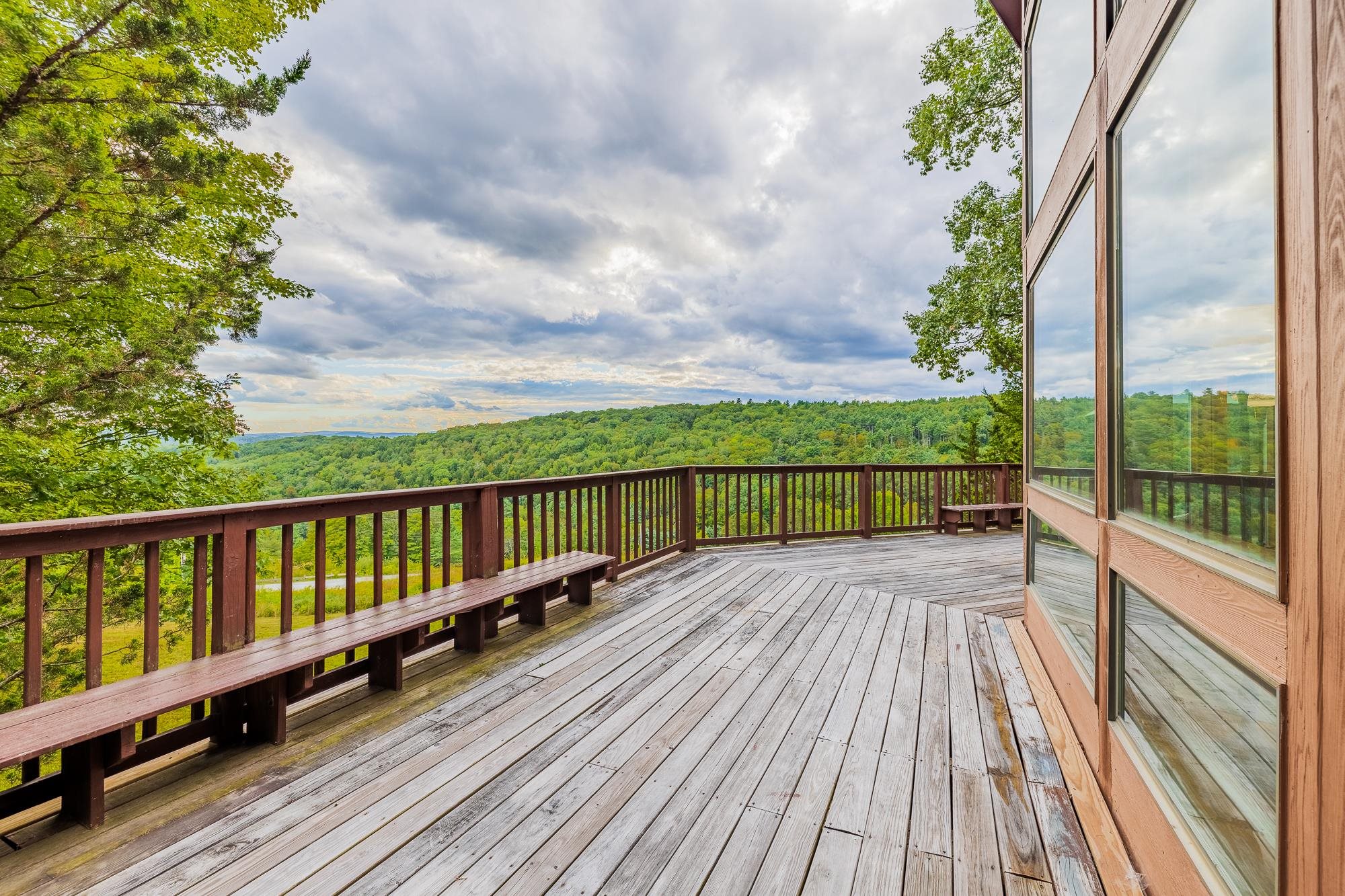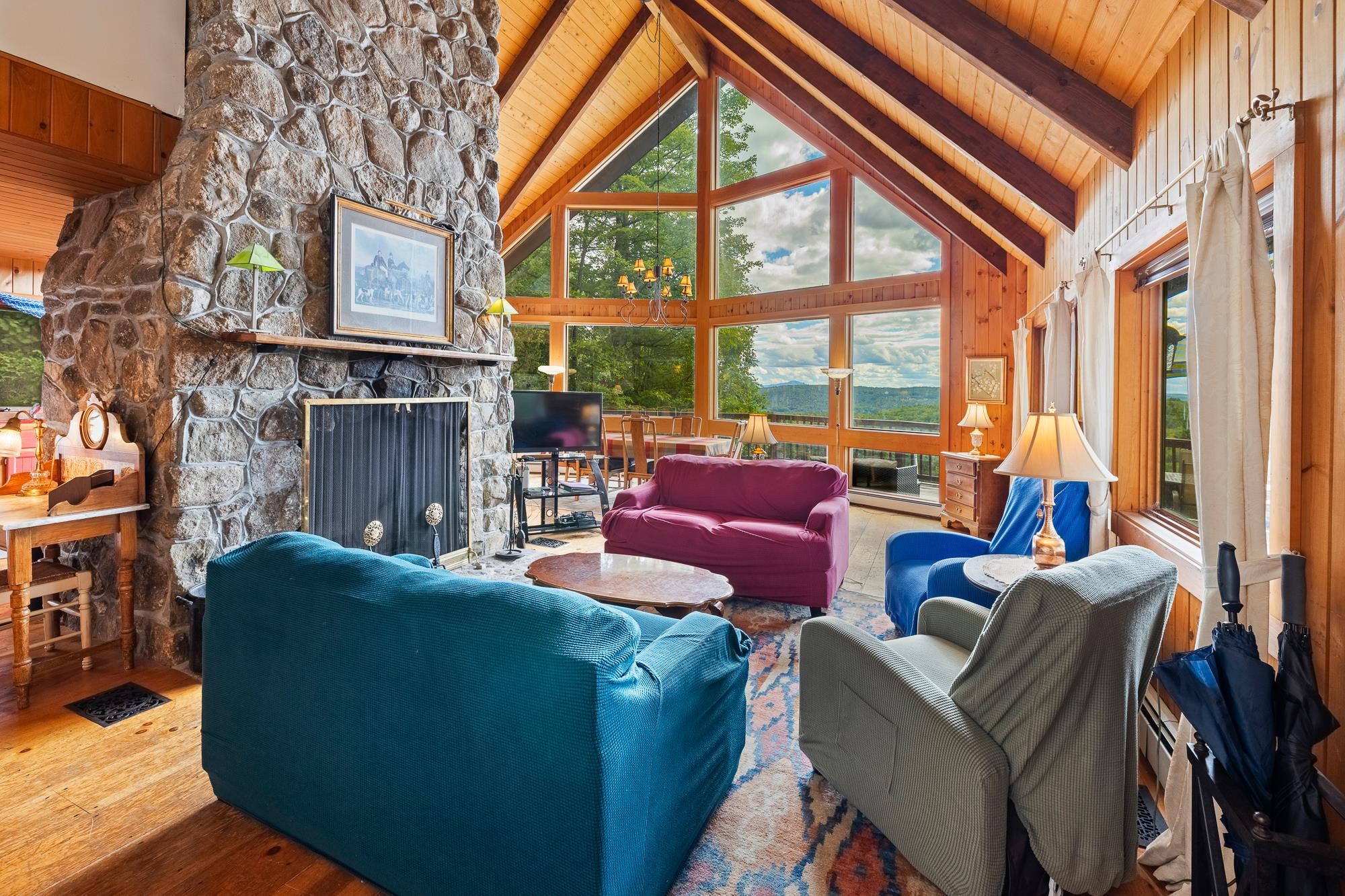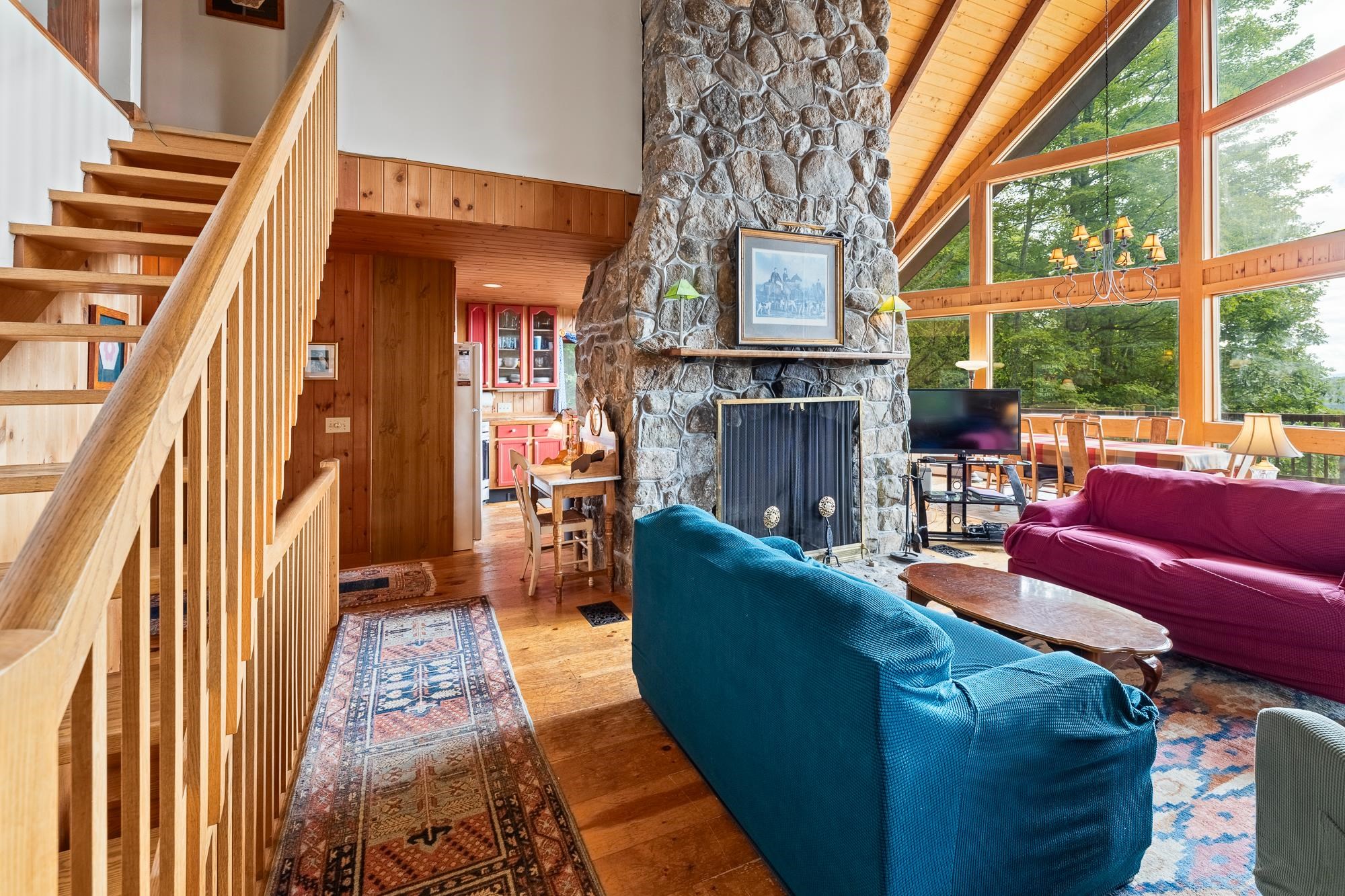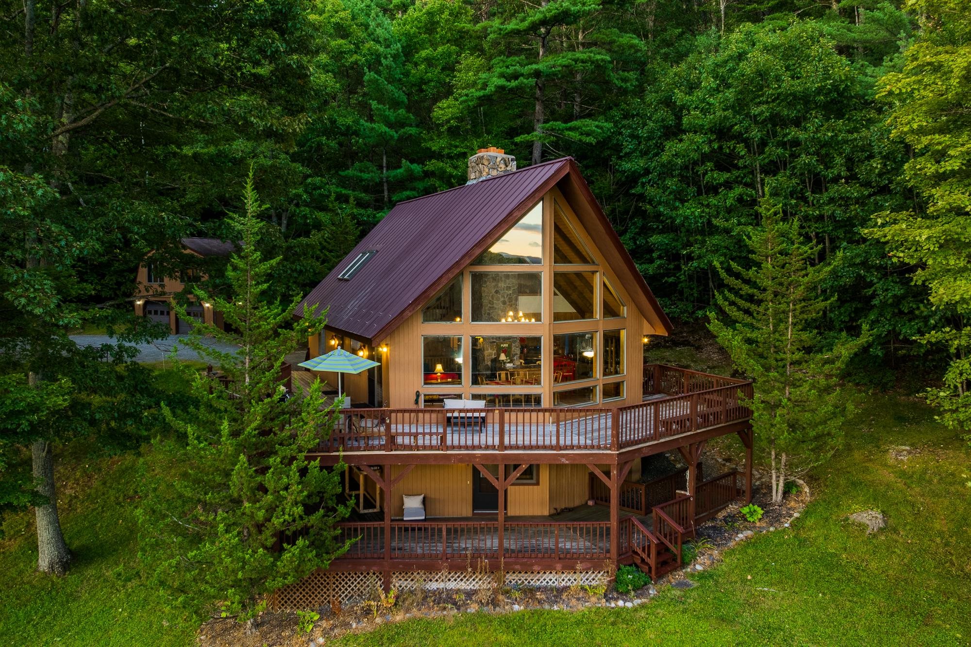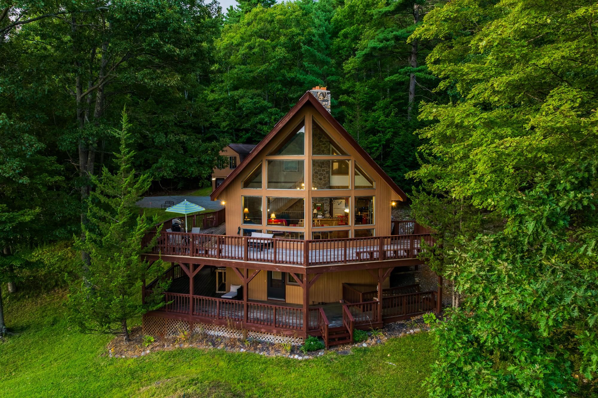 Set high on a south-facing hillside in Hartford, Vermont—just fifteen minutes from Dartmouth College and downtown Hanover, yet a world away—132 Loveland Hill Road is a striking contemporary defined by its dramatic A-frame glass curtain wall. Floor-to-ceiling glazing fills the cathedral-ceilinged living space with natural light and frames long views across the surrounding woodland, with the peak of Mount Ascutney rising above the trees. The main level centers on an expansive 27' x 27' living and dining area where a full wall of glass brings the outdoors in, while a wood-burning fireplace and hearth create a natural focal point for gathering. Two additional bedrooms and a full bath are also located on this level. Upstairs, the primary suite offers a generously proportioned retreat with a walk-in closet and full bath. On the lower level, a nearly 30-foot finished family room opens directly to grade and includes its own full bath, providing flexible space for recreation, guests, or work from home needs. A self-contained 533-square-foot apartment above the garage—complete with bedroom, bath, living room, and kitchen—adds versatility for guest accommodations, rental income, or a private office. Extensive wraparound decking surrounds the living space, creating multiple places to enjoy the natural setting. Sited on 10.1 private wooded acres and accessed via a shared driveway, the 2, 663-square-foot home offers dramatic architecture, abundant natural light, and an exceptional Upper Valley location with the opportunity to make it your own.