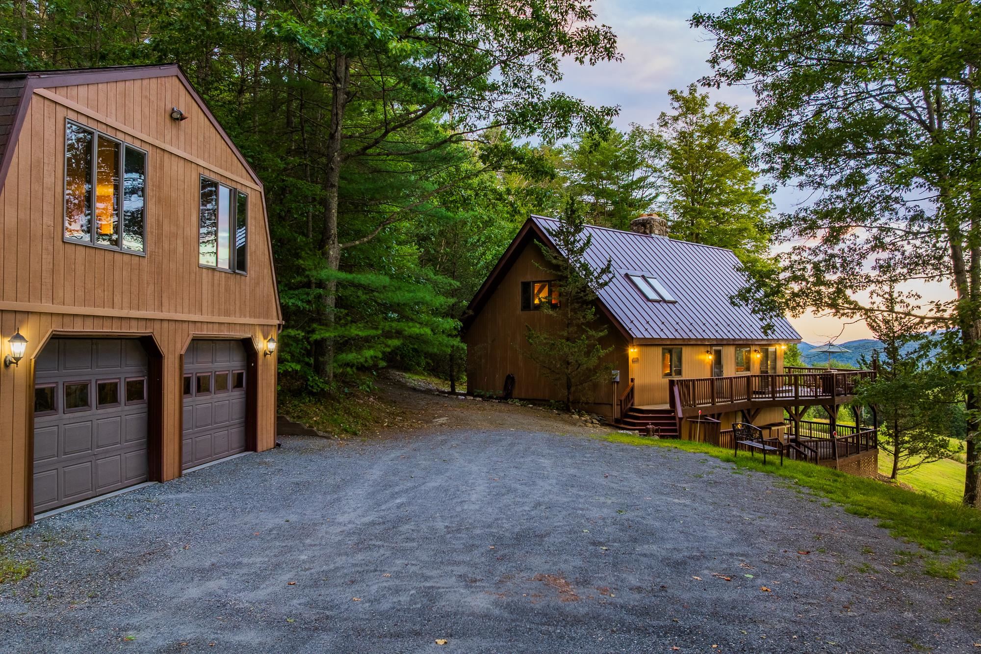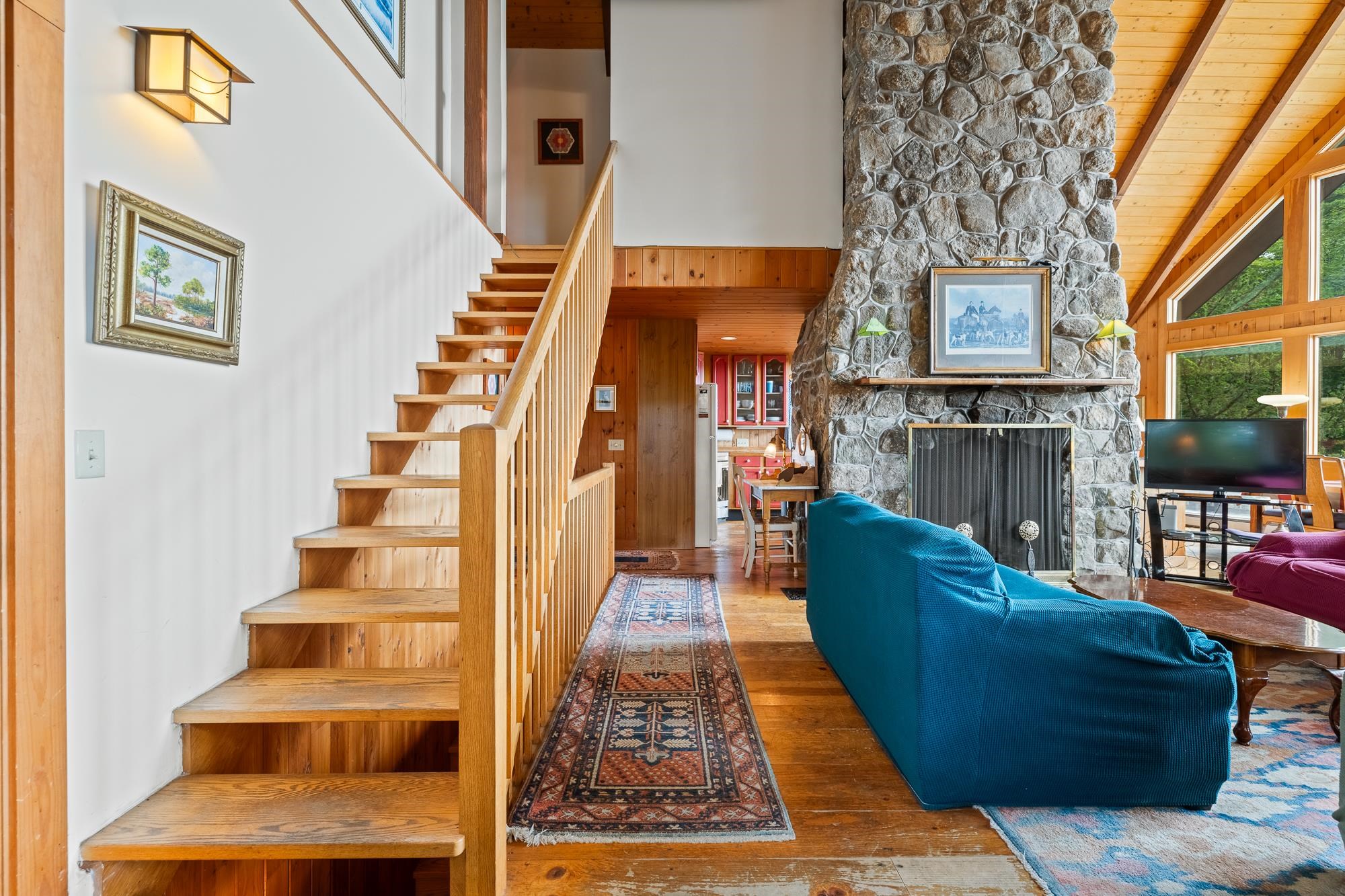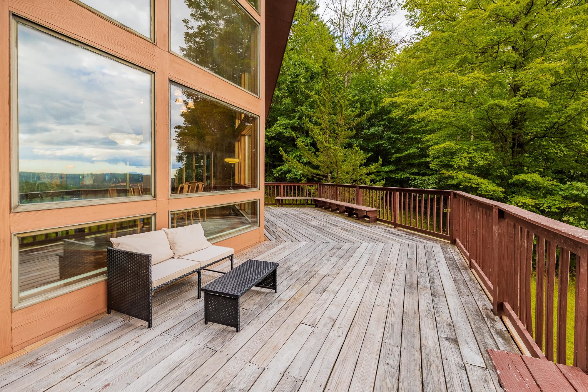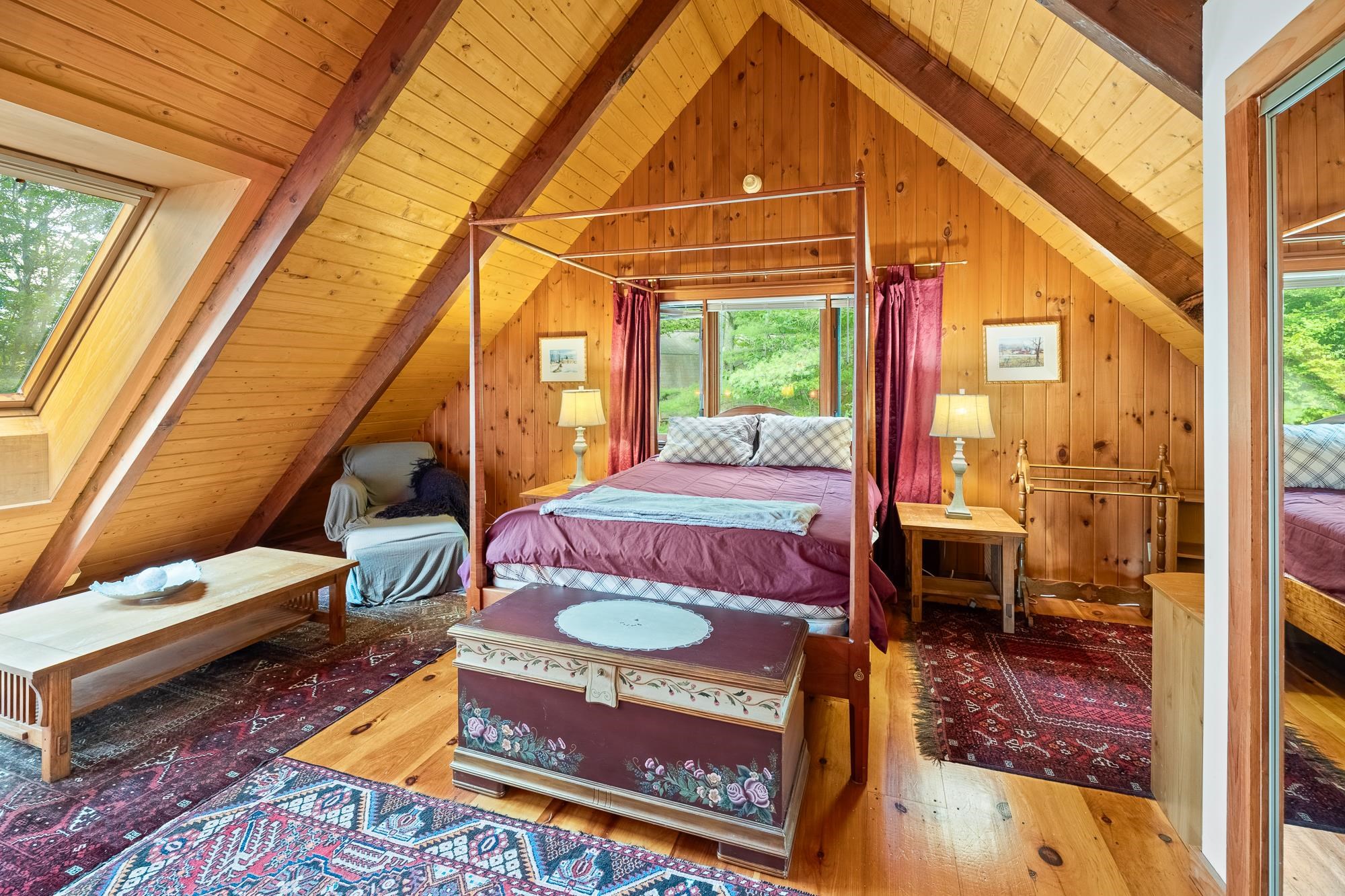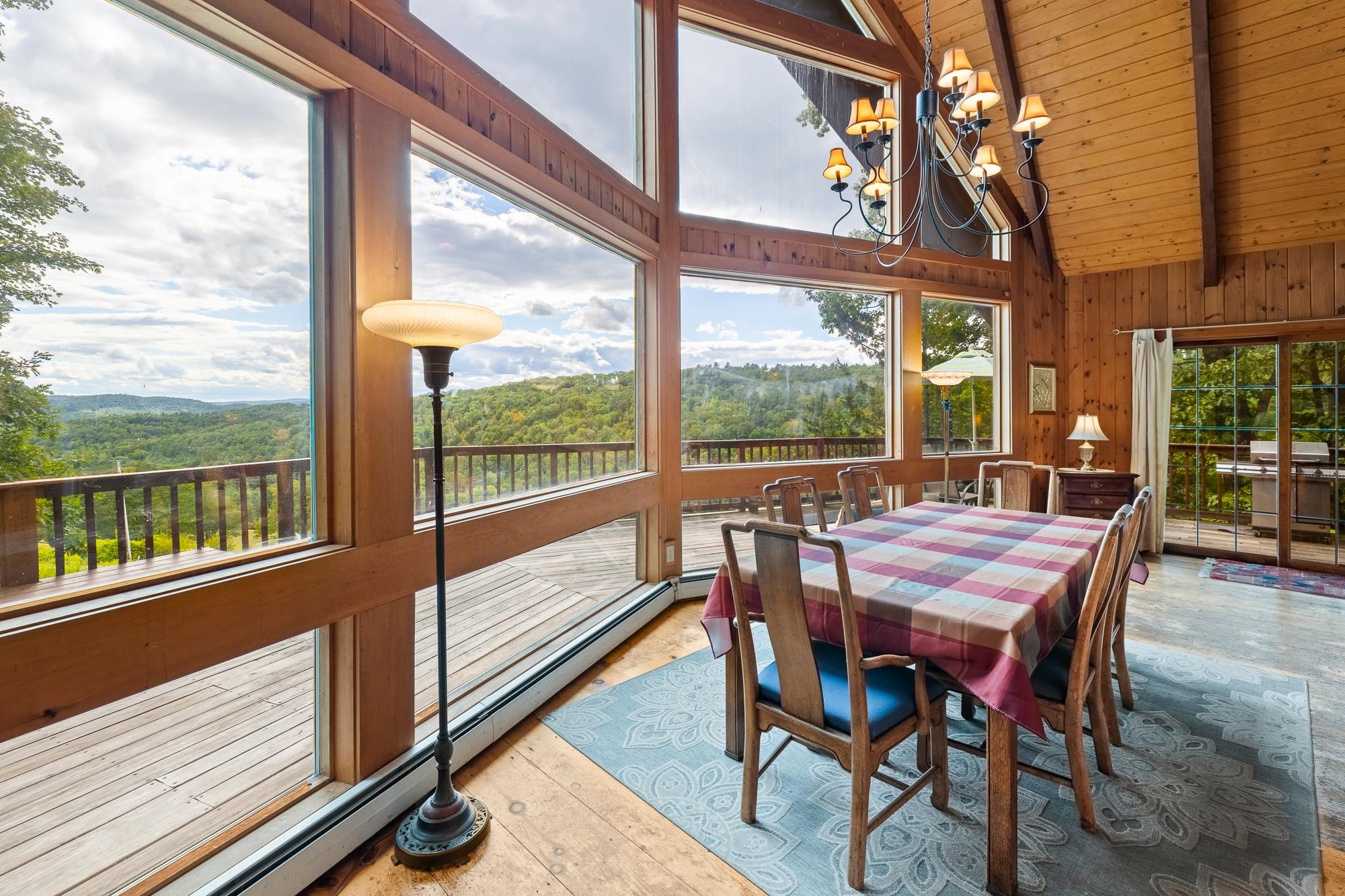 Set high on a south-facing hillside in Hartford, Vermont—just fifteen minutes from Dartmouth College and downtown Hanover, yet a world away—132 Loveland Hill Road is a striking contemporary defined by its dramatic A-frame glass curtain wall. Floor-to-ceiling glazing fills the cathedral-ceilinged living space with natural light and frames long views across the surrounding woodland, with the peak of Mount Ascutney rising above the trees. The main level centers on an expansive 27' x 27' living and dining area where a full wall of glass brings the outdoors in, while a wood-burning fireplace and hearth create a natural focal point for gathering. Two additional bedrooms and a full bath are also located on this level. Upstairs, the primary suite offers a generously proportioned retreat with a walk-in closet and full bath. On the lower level, a nearly 30-foot finished family room opens directly to grade and includes its own full bath, providing flexible space for recreation, guests, or work from home needs. A self-contained 533-square-foot apartment above the garage—complete with bedroom, bath, living room, and kitchen—adds versatility for guest accommodations, rental income, or a private office. Extensive wraparound decking surrounds the living space, creating multiple places to enjoy the natural setting. Sited on 10.1 private wooded acres and accessed via a shared driveway, the 2, 663-square-foot home offers dramatic architecture, abundant natural light, and an exceptional Upper Valley location with the opportunity to make it your own.