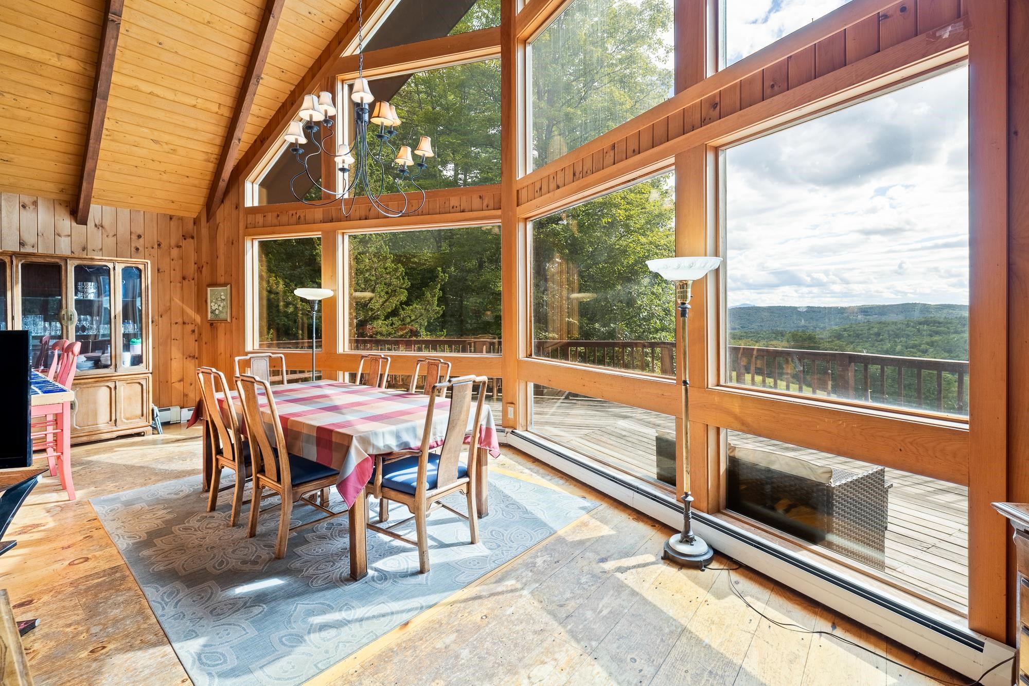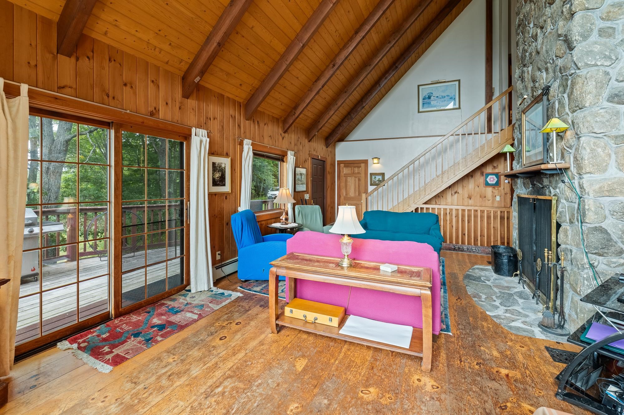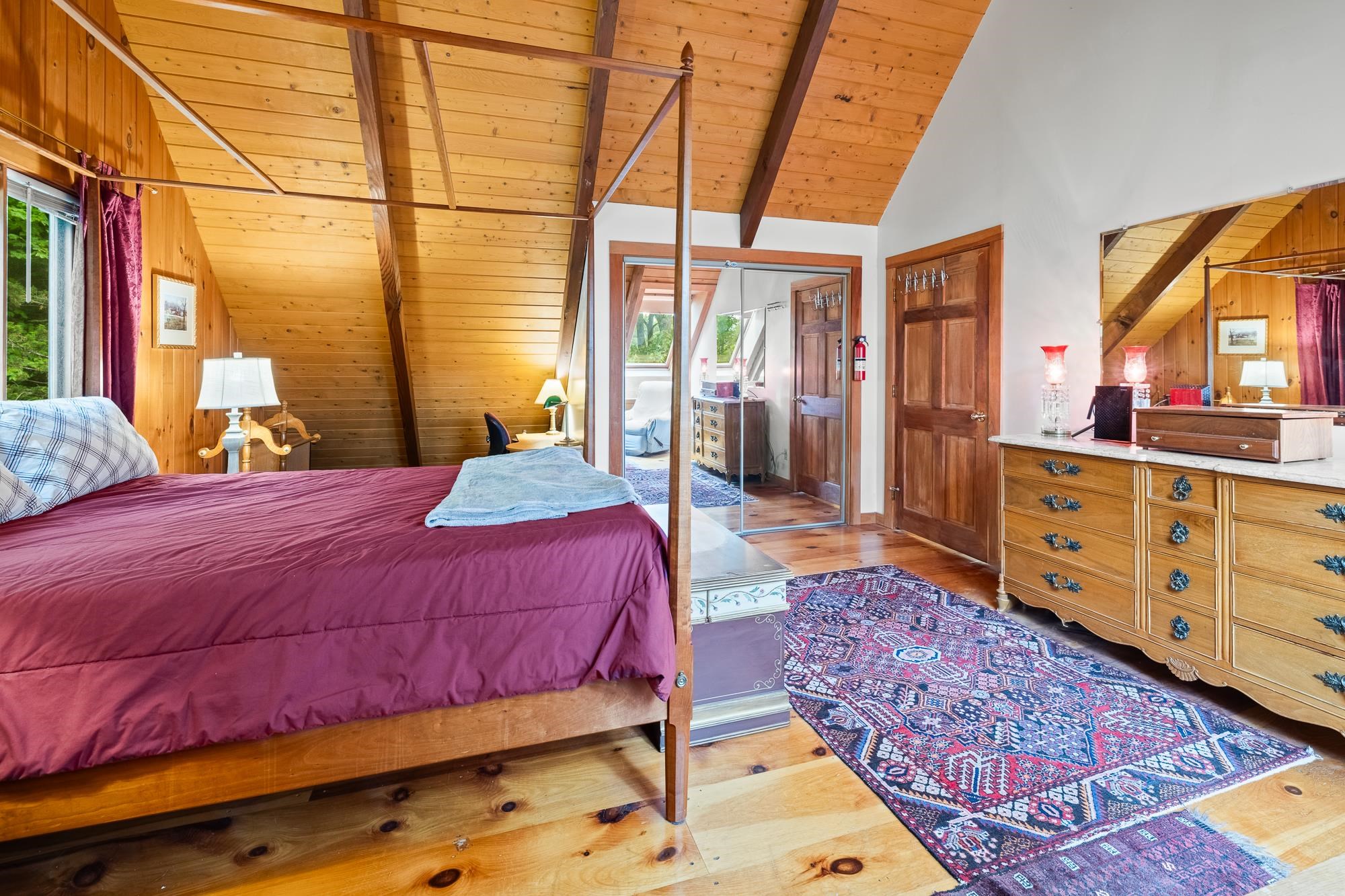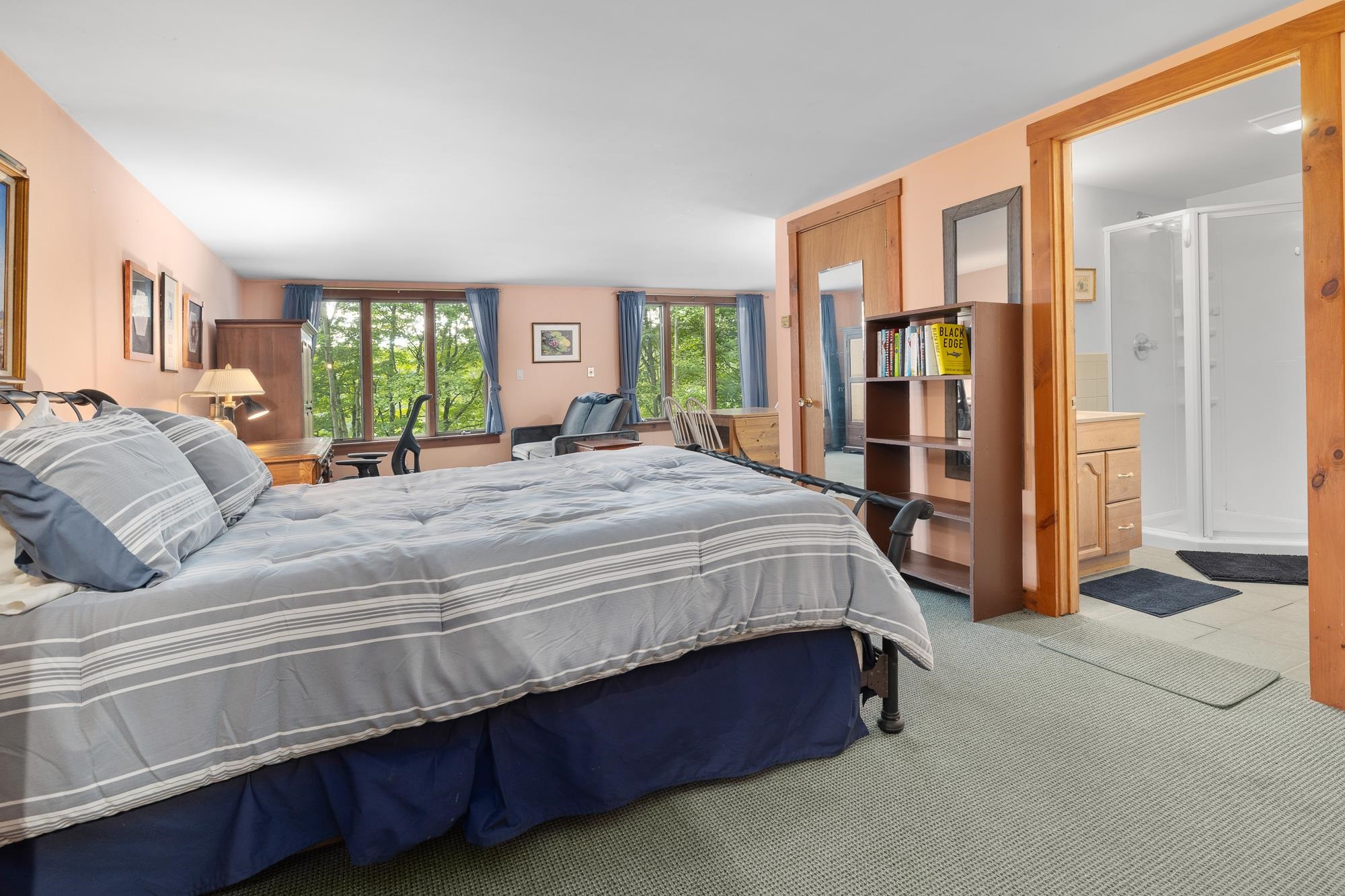 Set high on a south-facing hillside in Hartford, Vermont—just fifteen minutes from Dartmouth College and downtown Hanover, yet a world away—132 Loveland Hill Road is a striking contemporary defined by its dramatic A-frame glass curtain wall. Floor-to-ceiling glazing fills the cathedral-ceilinged living space with natural light and frames long views across the surrounding woodland, with the peak of Mount Ascutney rising above the trees. The main level centers on an expansive 27' x 27' living and dining area where a full wall of glass brings the outdoors in, while a wood-burning fireplace and hearth create a natural focal point for gathering. Two additional bedrooms and a full bath are also located on this level. Upstairs, the primary suite offers a generously proportioned retreat with a walk-in closet and full bath. On the lower level, a nearly 30-foot finished family room opens directly to grade and includes its own full bath, providing flexible space for recreation, guests, or work from home needs. A self-contained 533-square-foot apartment above the garage—complete with bedroom, bath, living room, and kitchen—adds versatility for guest accommodations, rental income, or a private office. Extensive wraparound decking surrounds the living space, creating multiple places to enjoy the natural setting. Sited on 10.1 private wooded acres and accessed via a shared driveway, the 2, 663-square-foot home offers dramatic architecture, abundant natural light, and an exceptional Upper Valley location with the opportunity to make it your own.