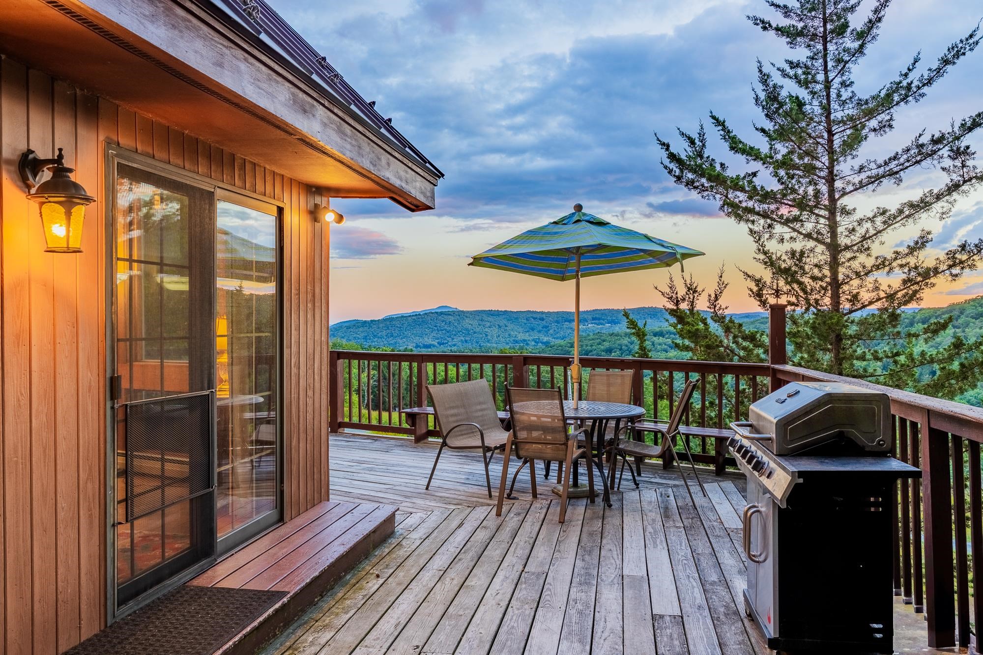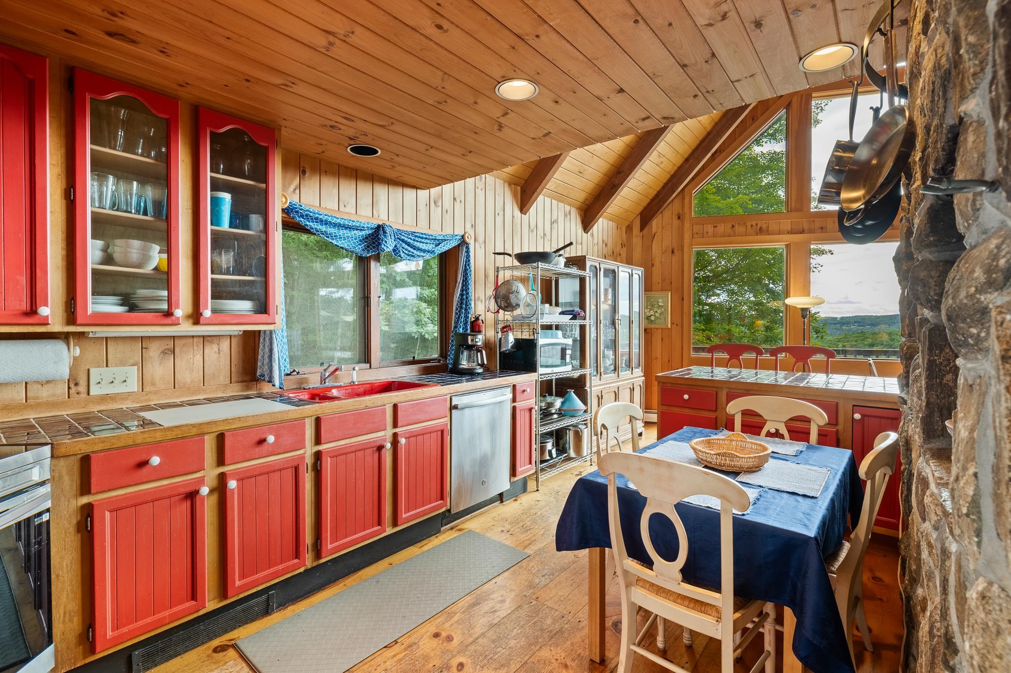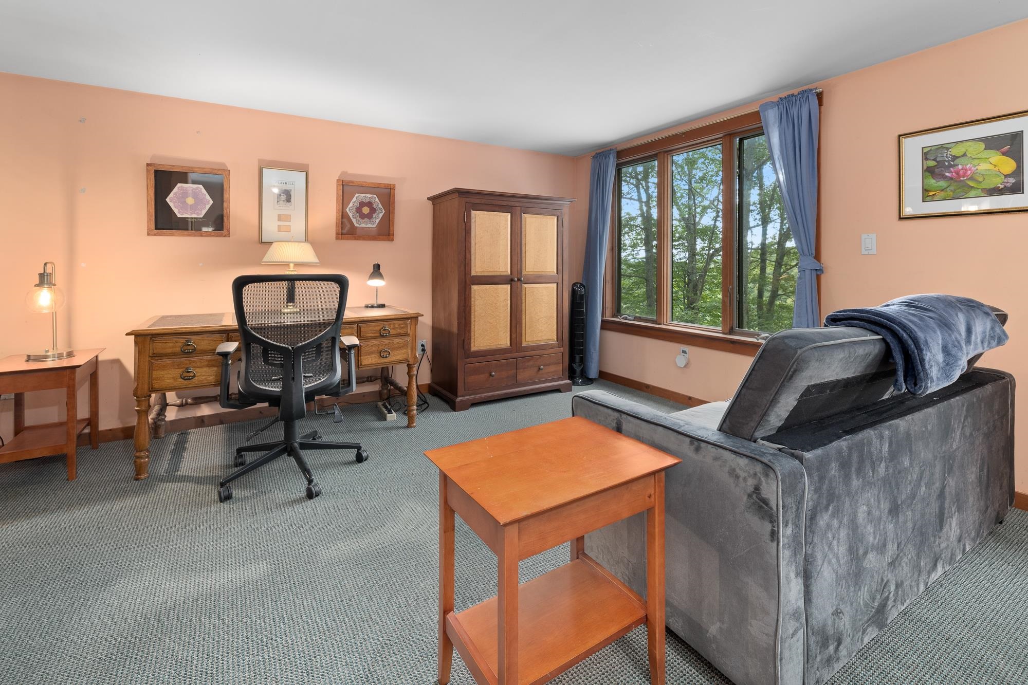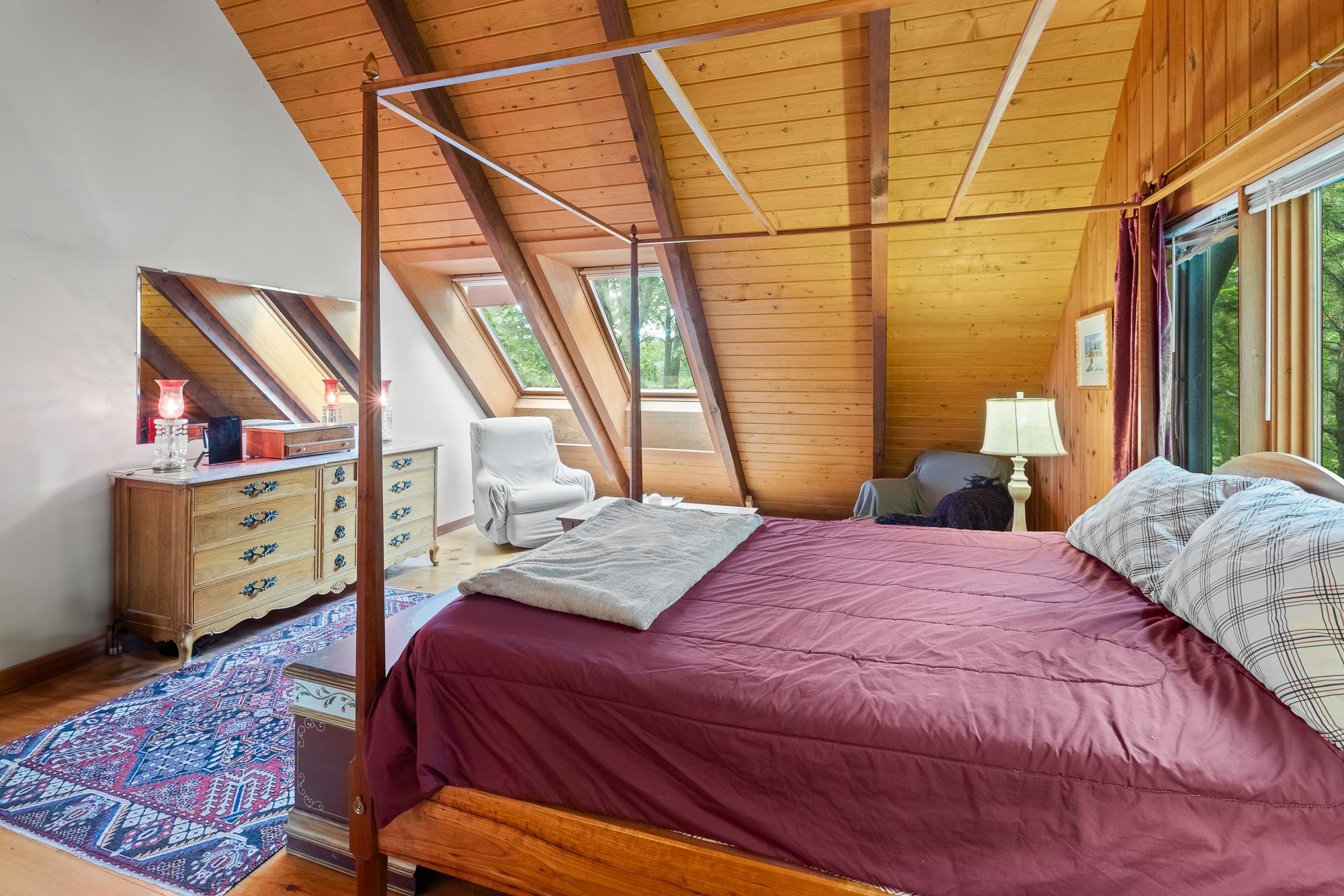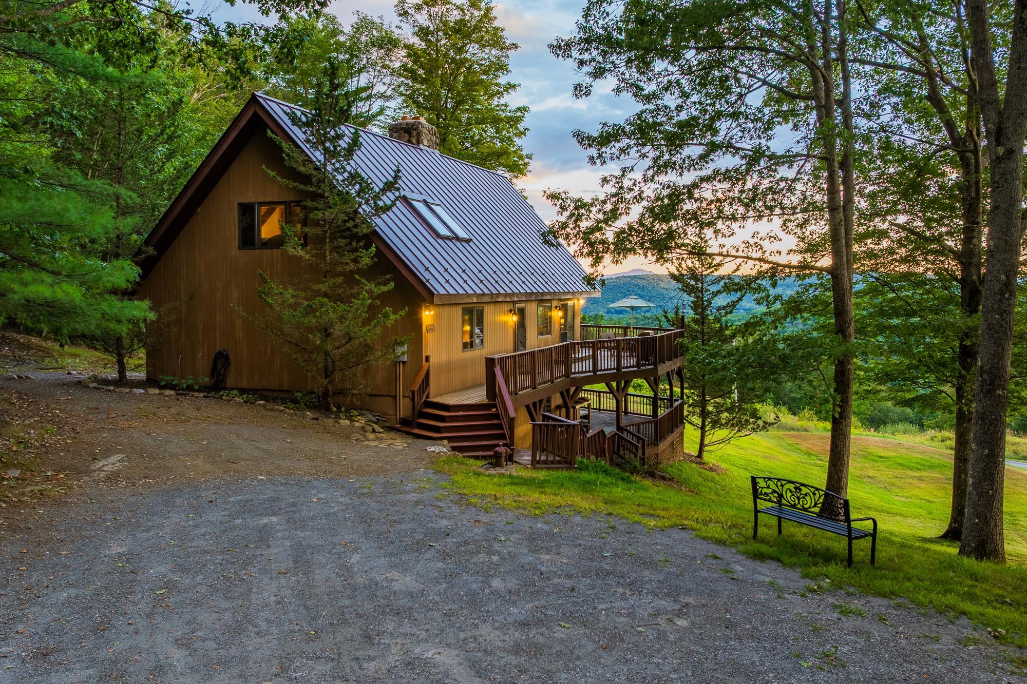 Set high on a south-facing hillside in Hartford, Vermont—just fifteen minutes from Dartmouth College and downtown Hanover, yet a world away—132 Loveland Hill Road is a striking contemporary defined by its dramatic A-frame glass curtain wall. Floor-to-ceiling glazing fills the cathedral-ceilinged living space with natural light and frames long views across the surrounding woodland, with the peak of Mount Ascutney rising above the trees. The main level centers on an expansive 27' x 27' living and dining area where a full wall of glass brings the outdoors in, while a wood-burning fireplace and hearth create a natural focal point for gathering. Two additional bedrooms and a full bath are also located on this level. Upstairs, the primary suite offers a generously proportioned retreat with a walk-in closet and full bath. On the lower level, a nearly 30-foot finished family room opens directly to grade and includes its own full bath, providing flexible space for recreation, guests, or work from home needs. A self-contained 533-square-foot apartment above the garage—complete with bedroom, bath, living room, and kitchen—adds versatility for guest accommodations, rental income, or a private office. Extensive wraparound decking surrounds the living space, creating multiple places to enjoy the natural setting. Sited on 10.1 private wooded acres and accessed via a shared driveway, the 2, 663-square-foot home offers dramatic architecture, abundant natural light, and an exceptional Upper Valley location with the opportunity to make it your own.