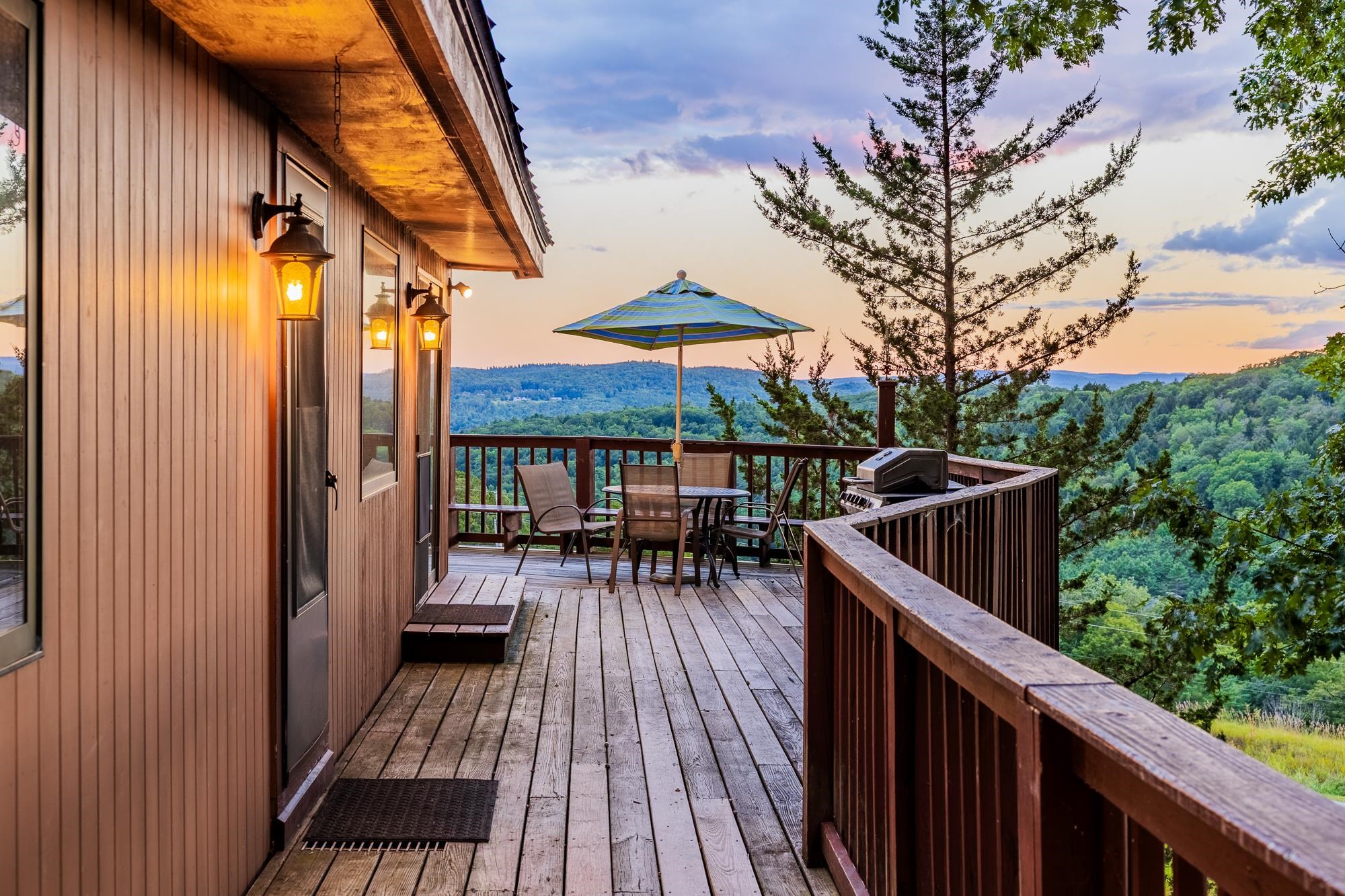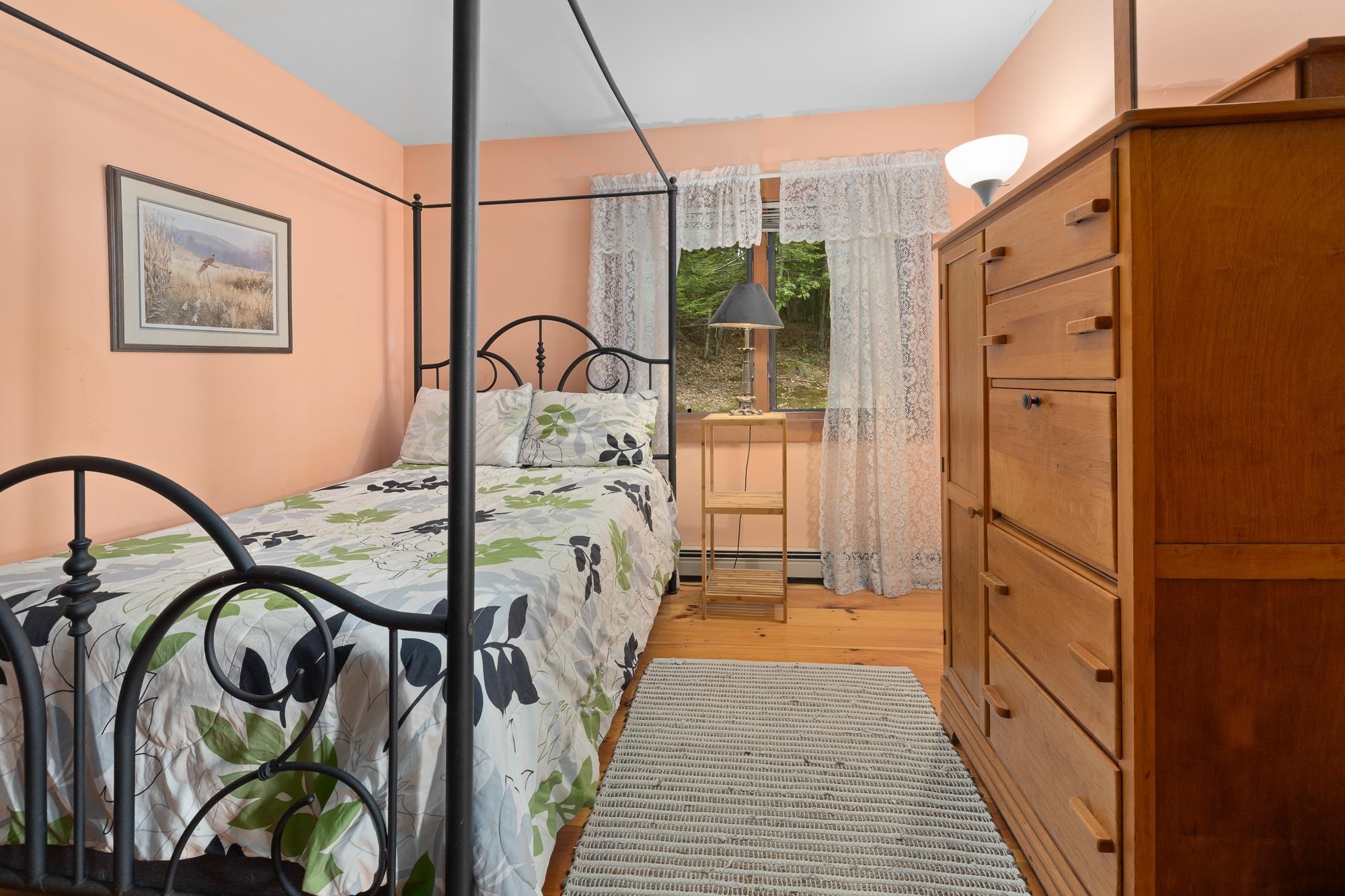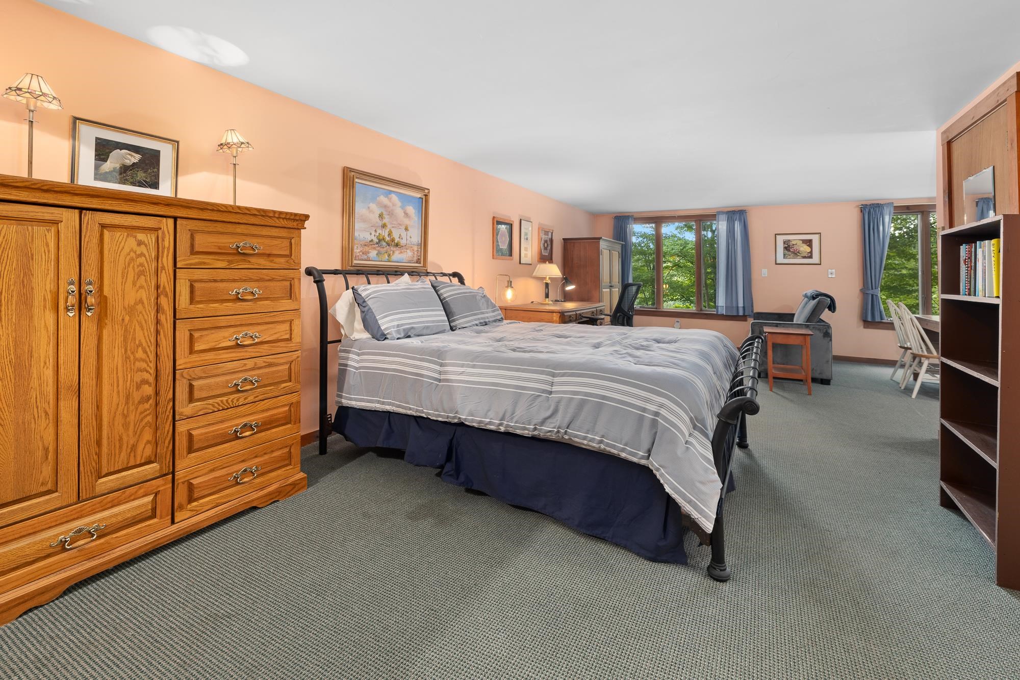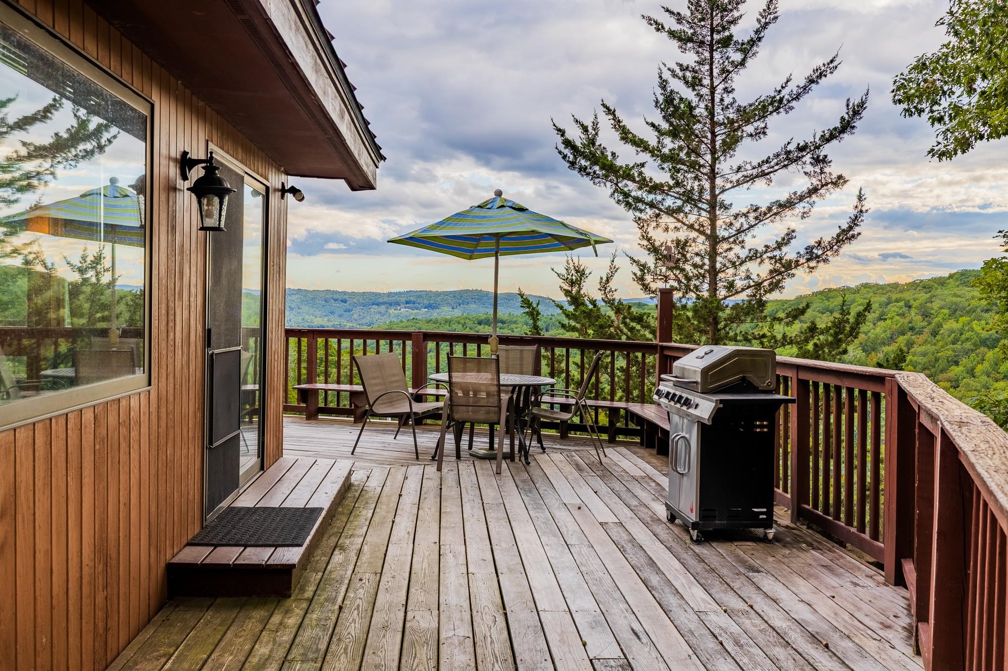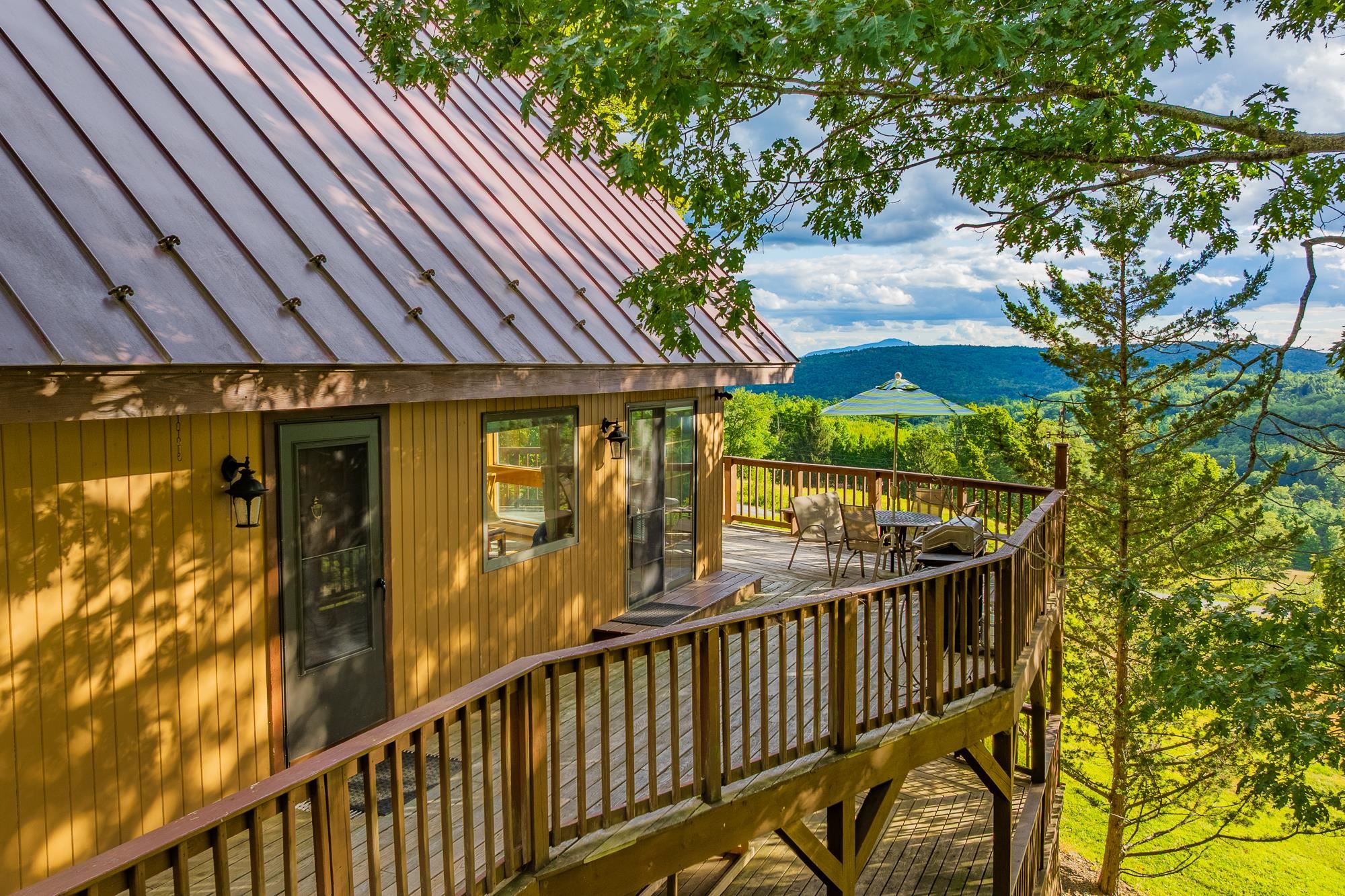 Set high on a south-facing hillside in Hartford, Vermont—just fifteen minutes from Dartmouth College and downtown Hanover, yet a world away—132 Loveland Hill Road is a striking contemporary defined by its dramatic A-frame glass curtain wall. Floor-to-ceiling glazing fills the cathedral-ceilinged living space with natural light and frames long views across the surrounding woodland, with the peak of Mount Ascutney rising above the trees. The main level centers on an expansive 27' x 27' living and dining area where a full wall of glass brings the outdoors in, while a wood-burning fireplace and hearth create a natural focal point for gathering. Two additional bedrooms and a full bath are also located on this level. Upstairs, the primary suite offers a generously proportioned retreat with a walk-in closet and full bath. On the lower level, a nearly 30-foot finished family room opens directly to grade and includes its own full bath, providing flexible space for recreation, guests, or work from home needs. A self-contained 533-square-foot apartment above the garage—complete with bedroom, bath, living room, and kitchen—adds versatility for guest accommodations, rental income, or a private office. Extensive wraparound decking surrounds the living space, creating multiple places to enjoy the natural setting. Sited on 10.1 private wooded acres and accessed via a shared driveway, the 2, 663-square-foot home offers dramatic architecture, abundant natural light, and an exceptional Upper Valley location with the opportunity to make it your own.