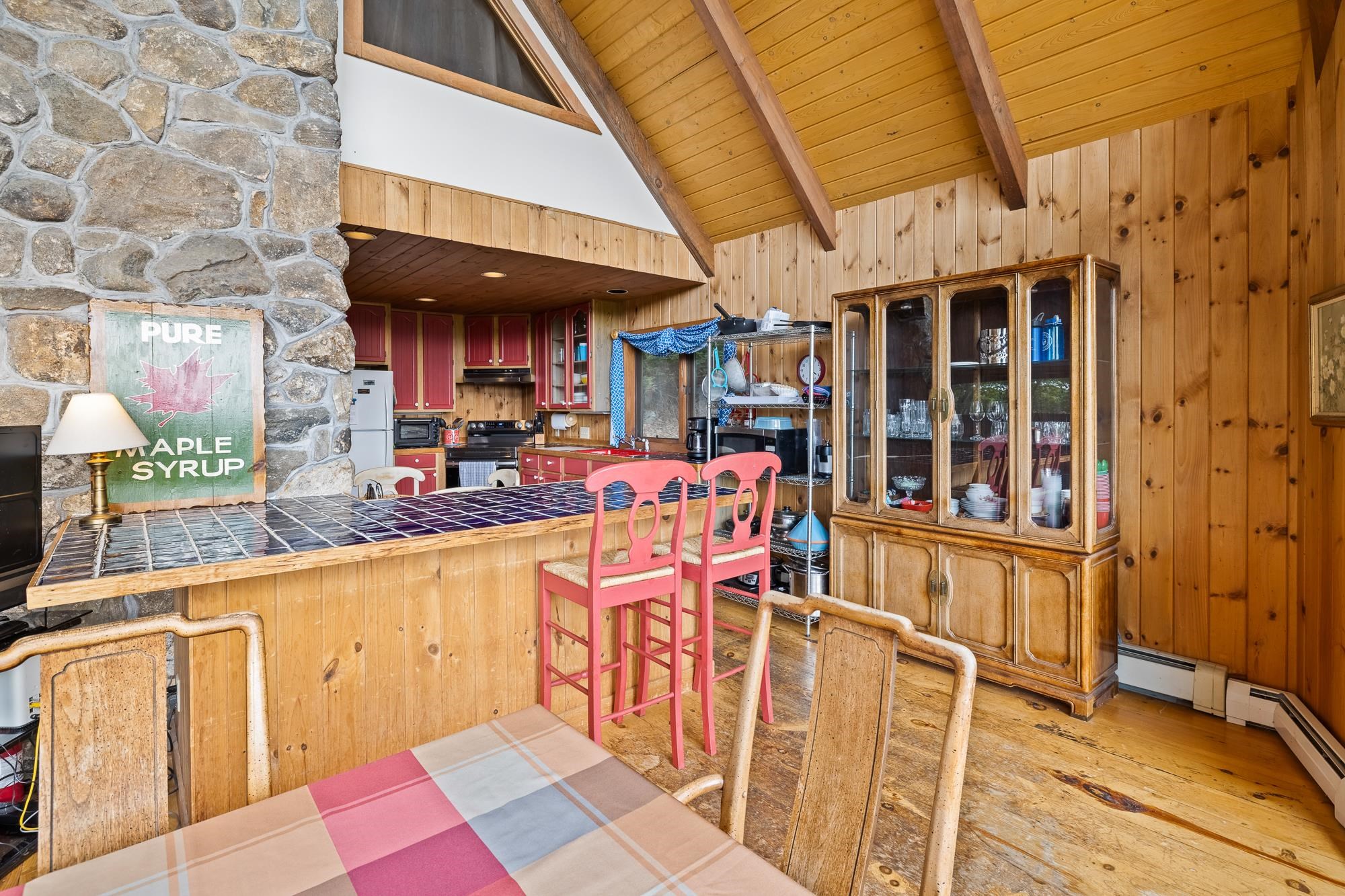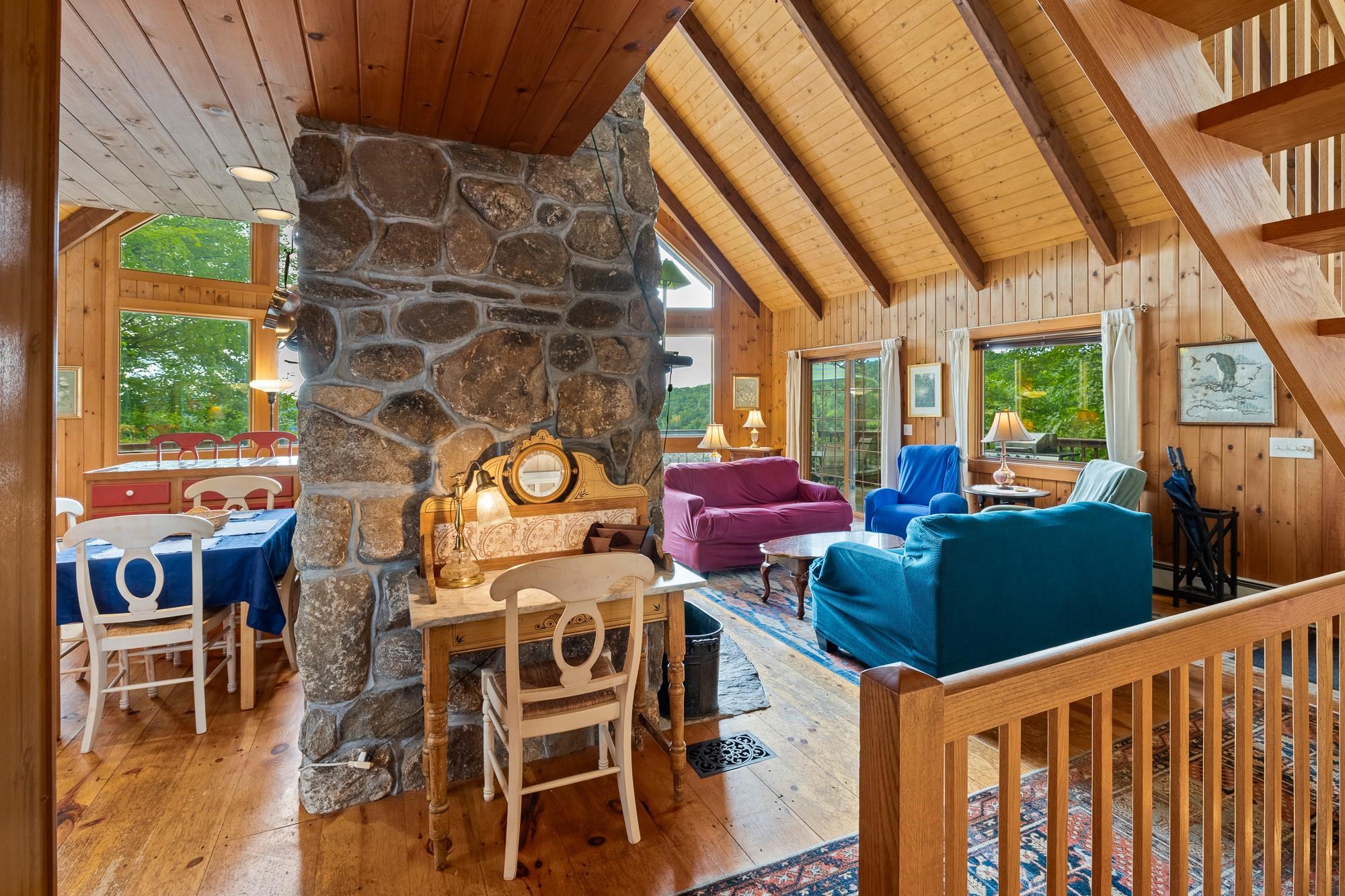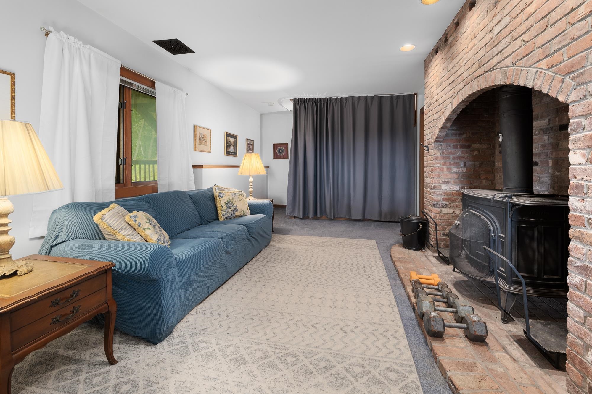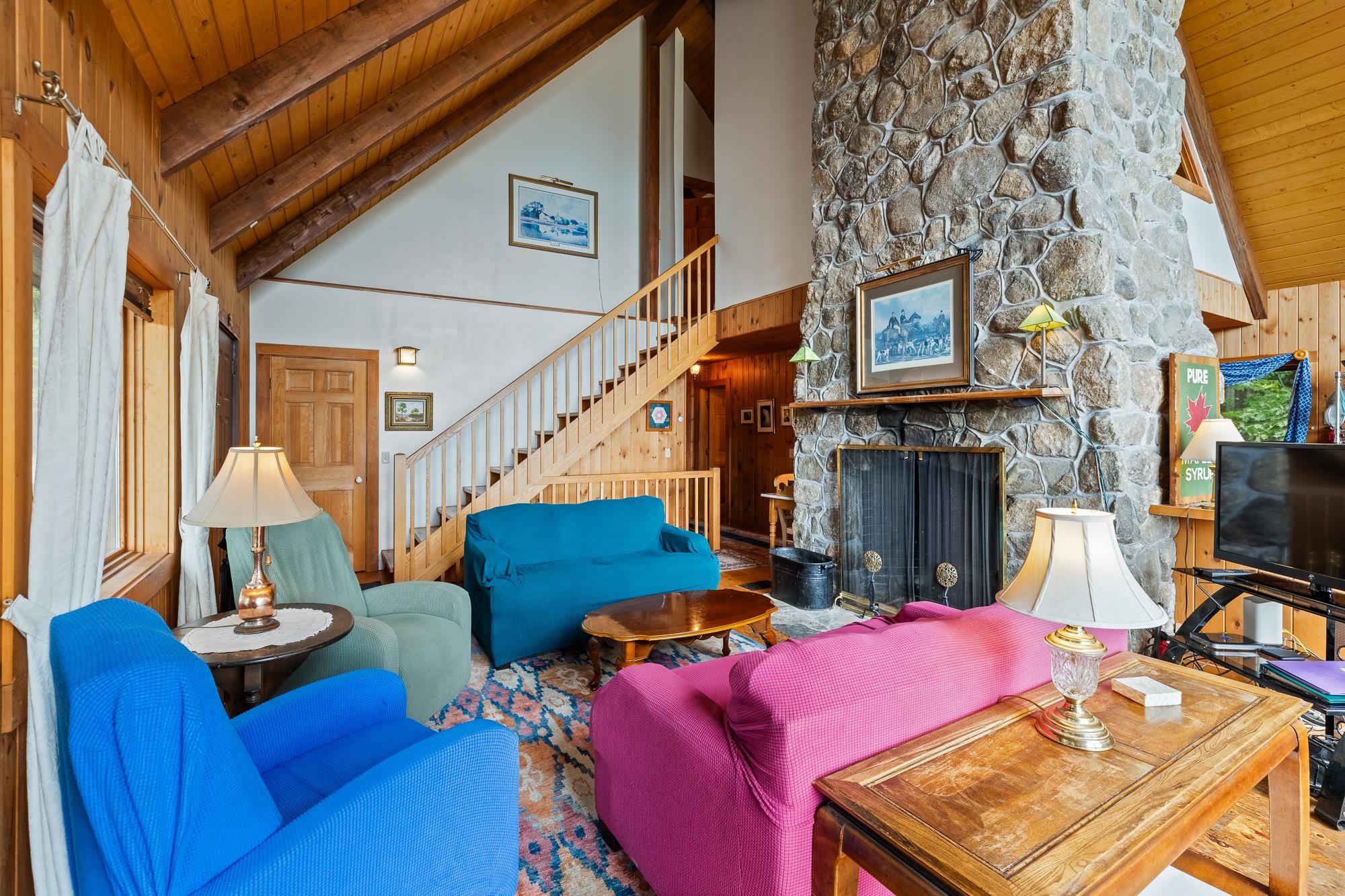 - Cathedral Ceiling, Dining Area, Wood Fireplace, 1 Fireplace, Living/Dining, Natural Light, Basement Laundry