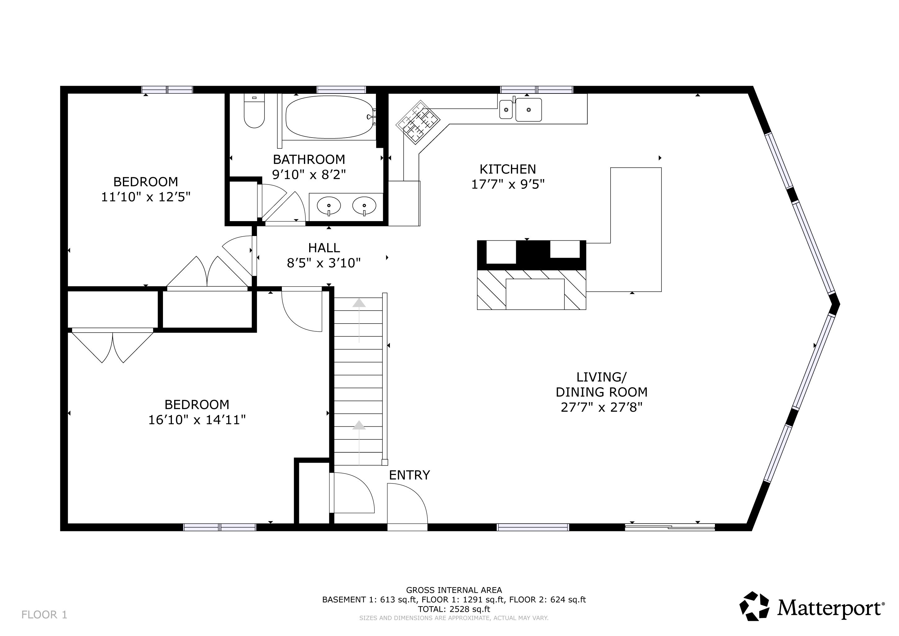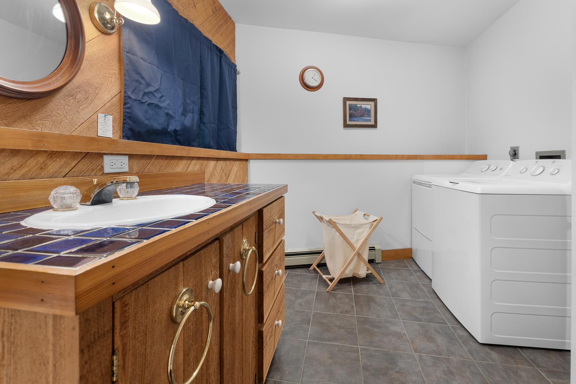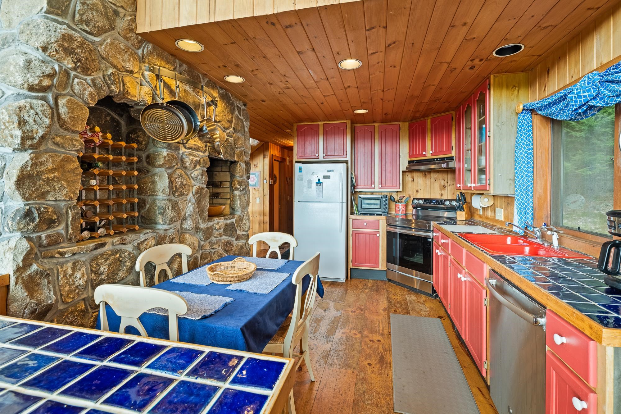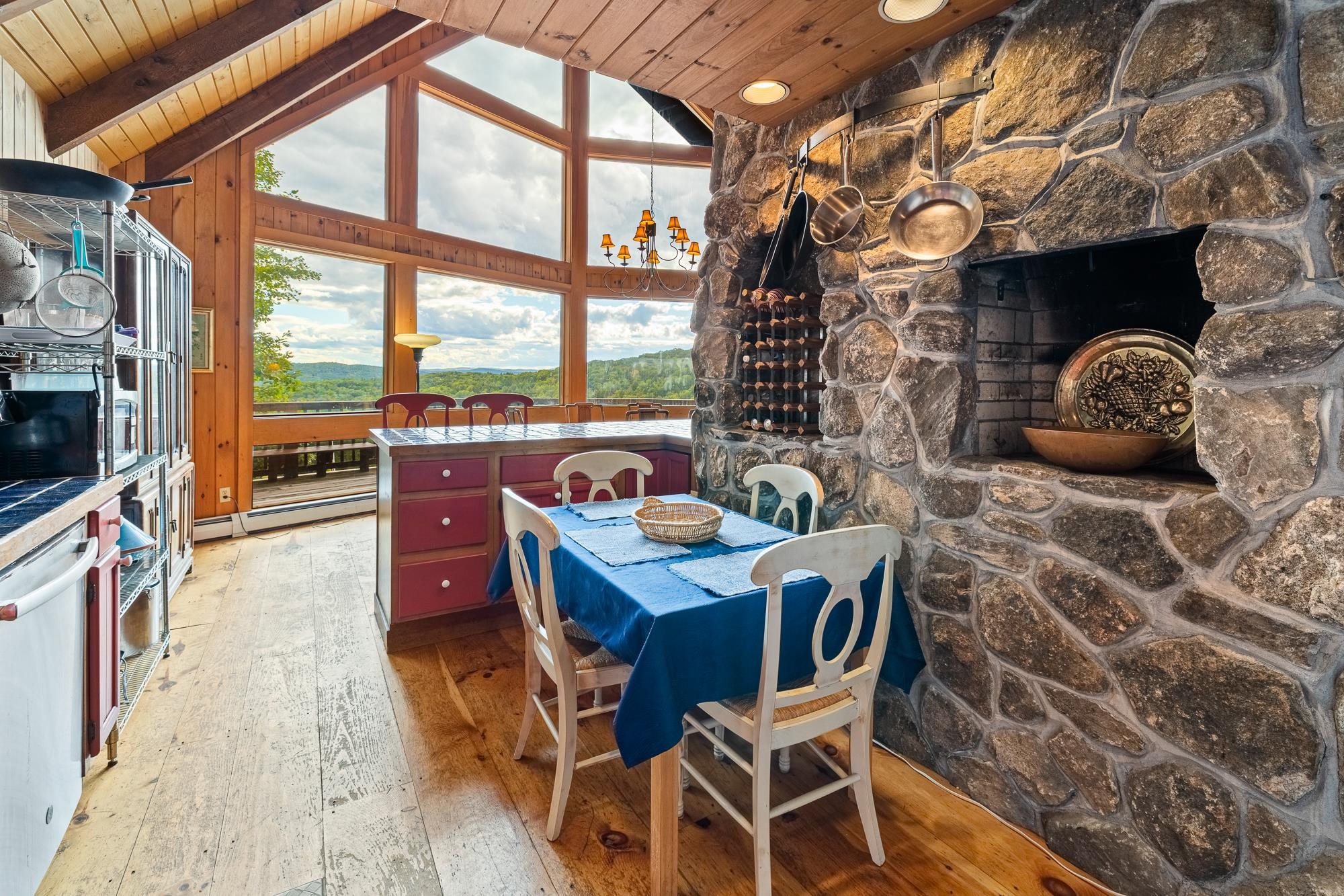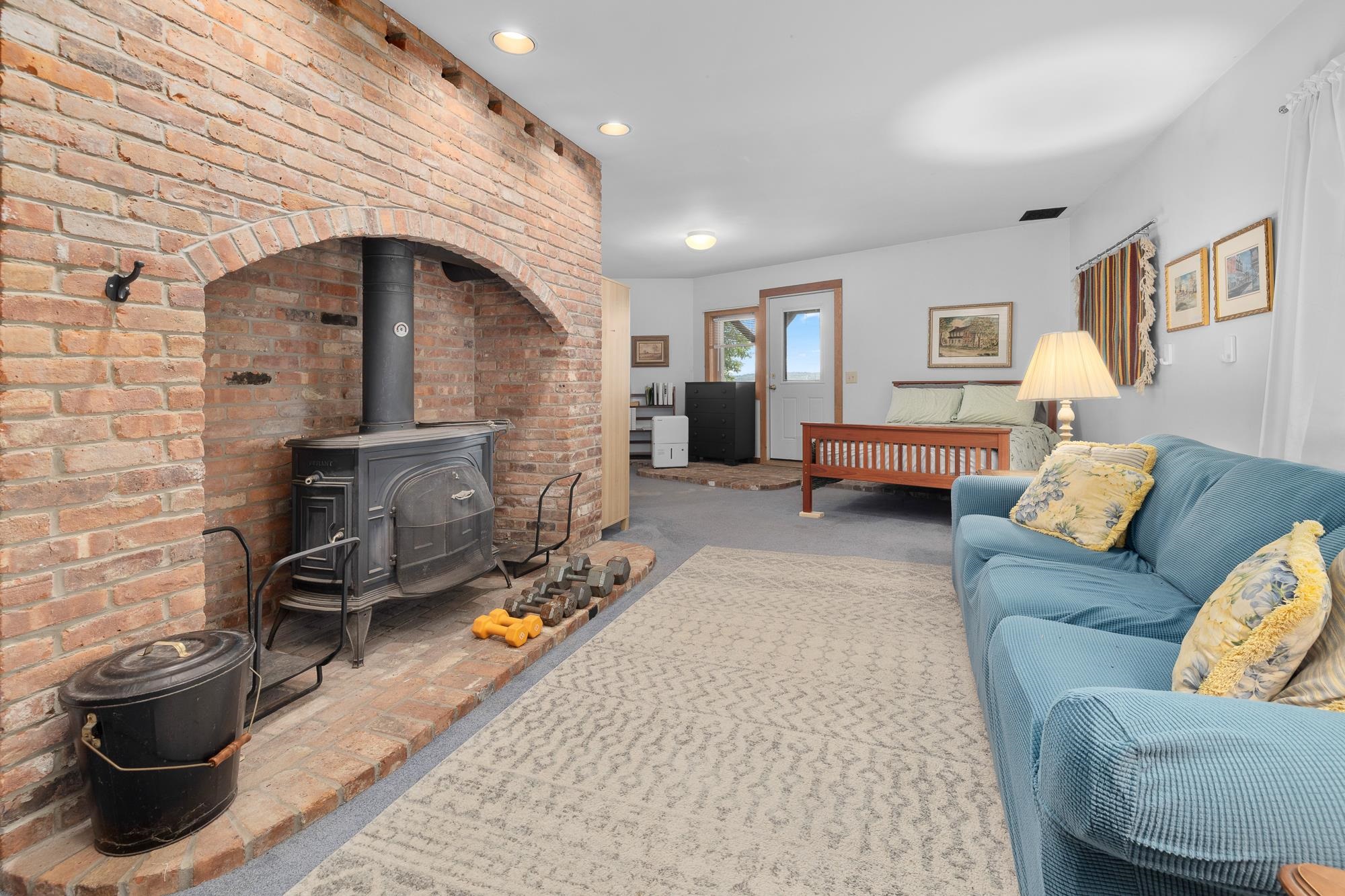 - Cathedral Ceiling, Dining Area, Wood Fireplace, 1 Fireplace, Living/Dining, Natural Light, Basement Laundry