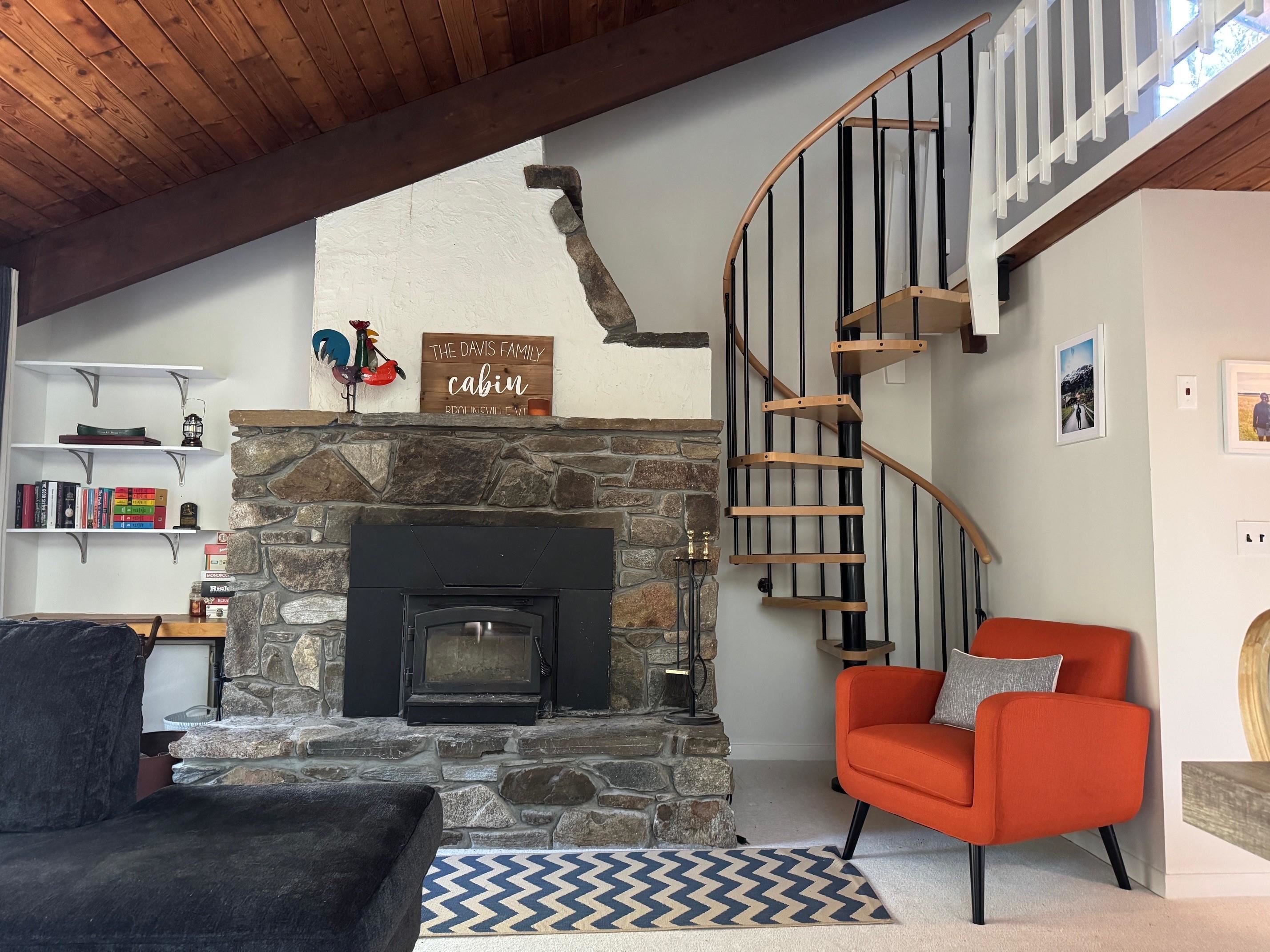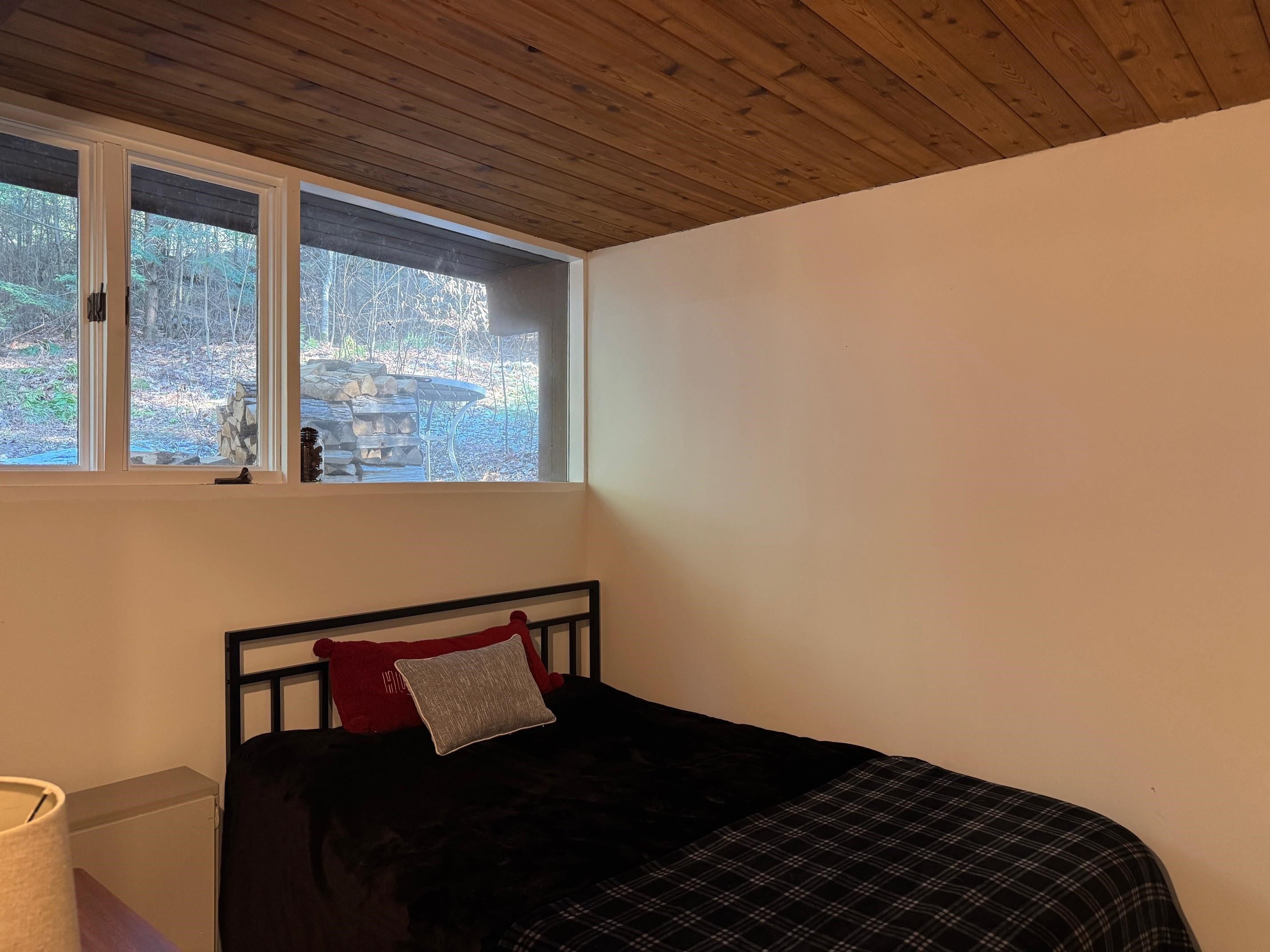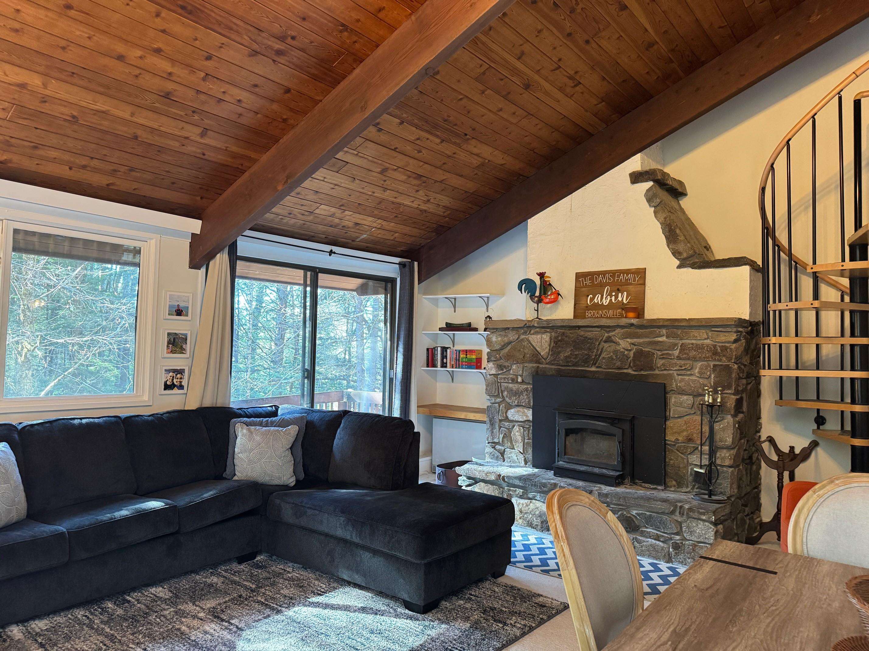Privately sited at the end of a quiet dead end road on beautiful Mt. Ascutney, this cozy 2 BR, 2 BA Chalet style home is an ideal-low maintenance vacation home, or an efficient starter. LR/DR with cathedral ceiling anchored by a sweeping fieldstone fireplace, with woodstove insert; and a spiral staircase leading to a loft-perfect for your home office. Kitchen with built ins, and updated appliances. A 3/4 BA further completes the main level. Two bedrooms, full bath and laundry on walk out lower level. Miles of trails for hiking and biking just outside your door, and a short stroll to the year round recreation and festivities at Ascutney Outdoors. This sweet Chalet is a great opportunity! Most furnishings available, with a few exceptions. Off peak electric radiators provide heat. Subject to standard ROFR.