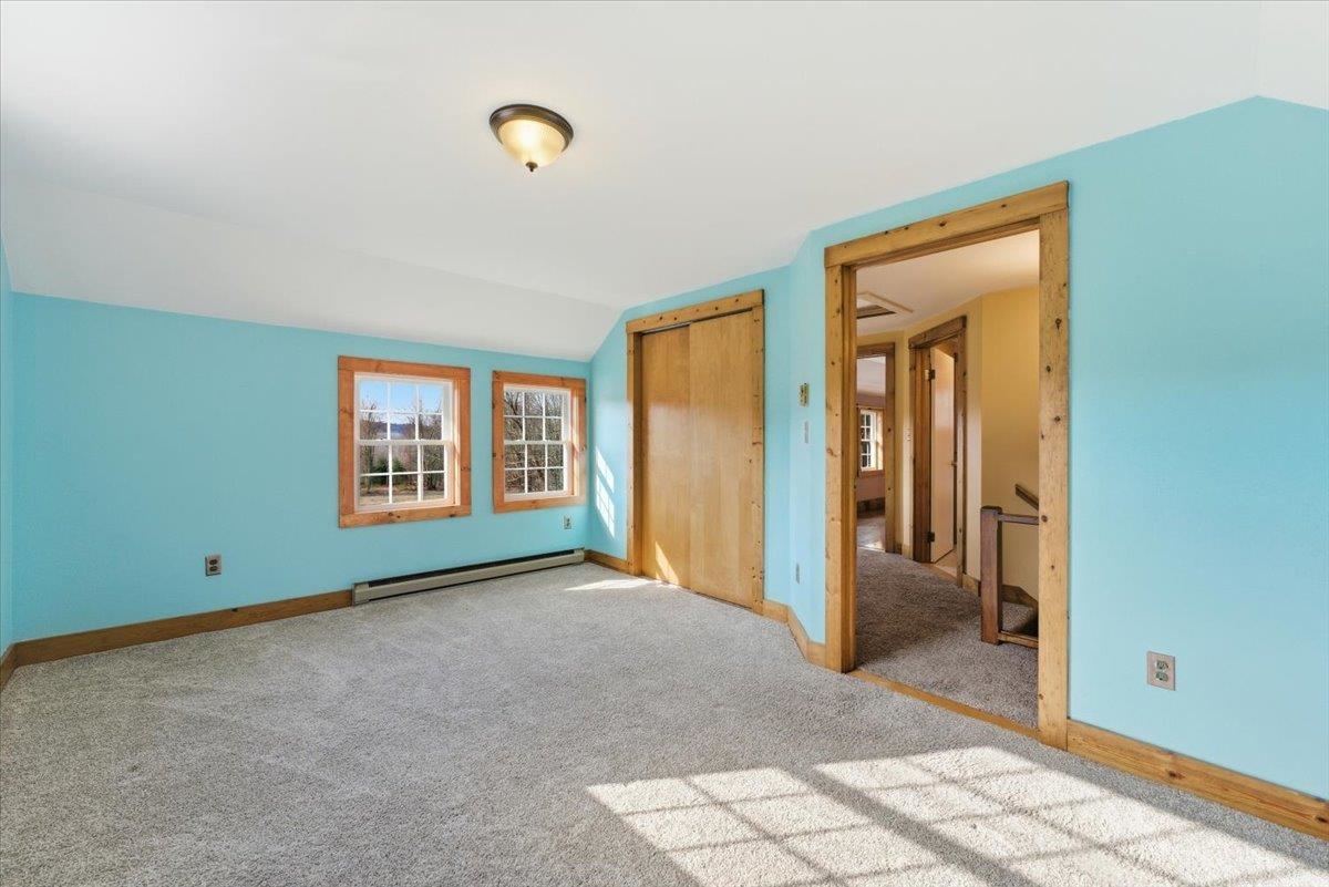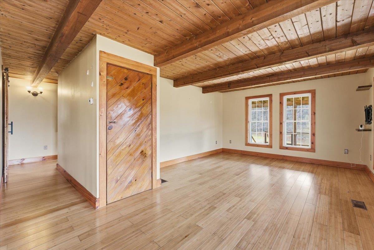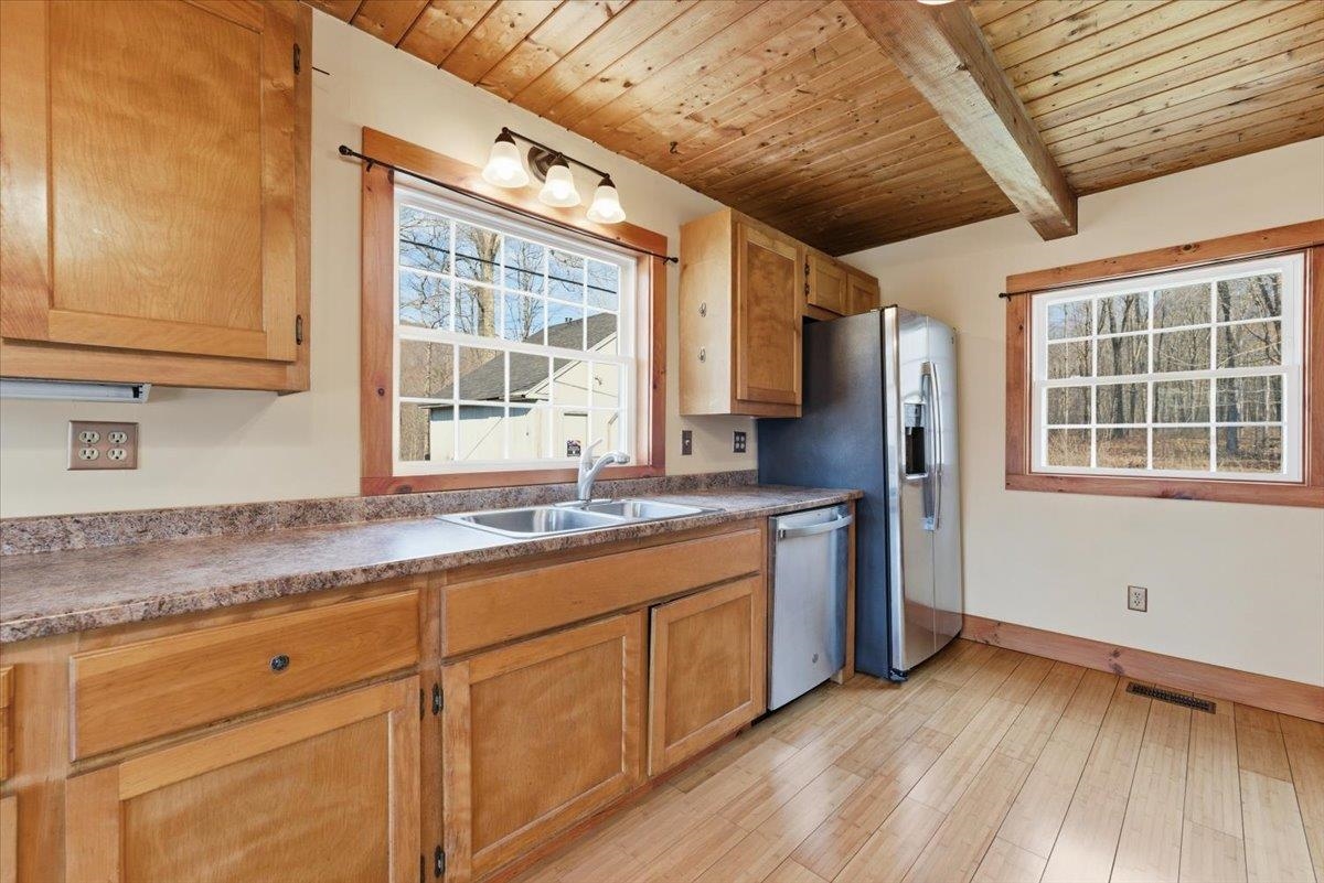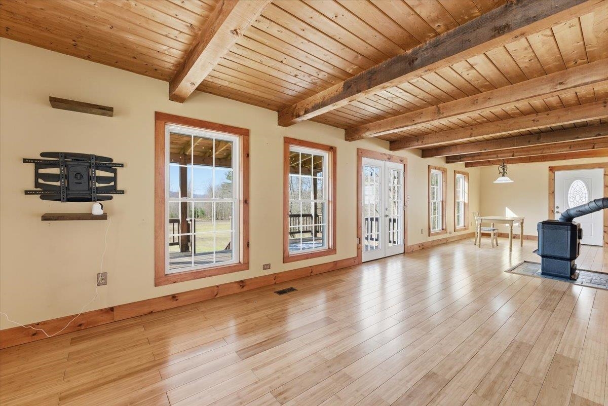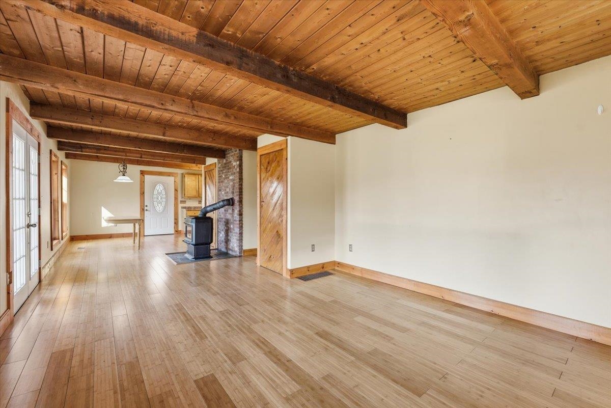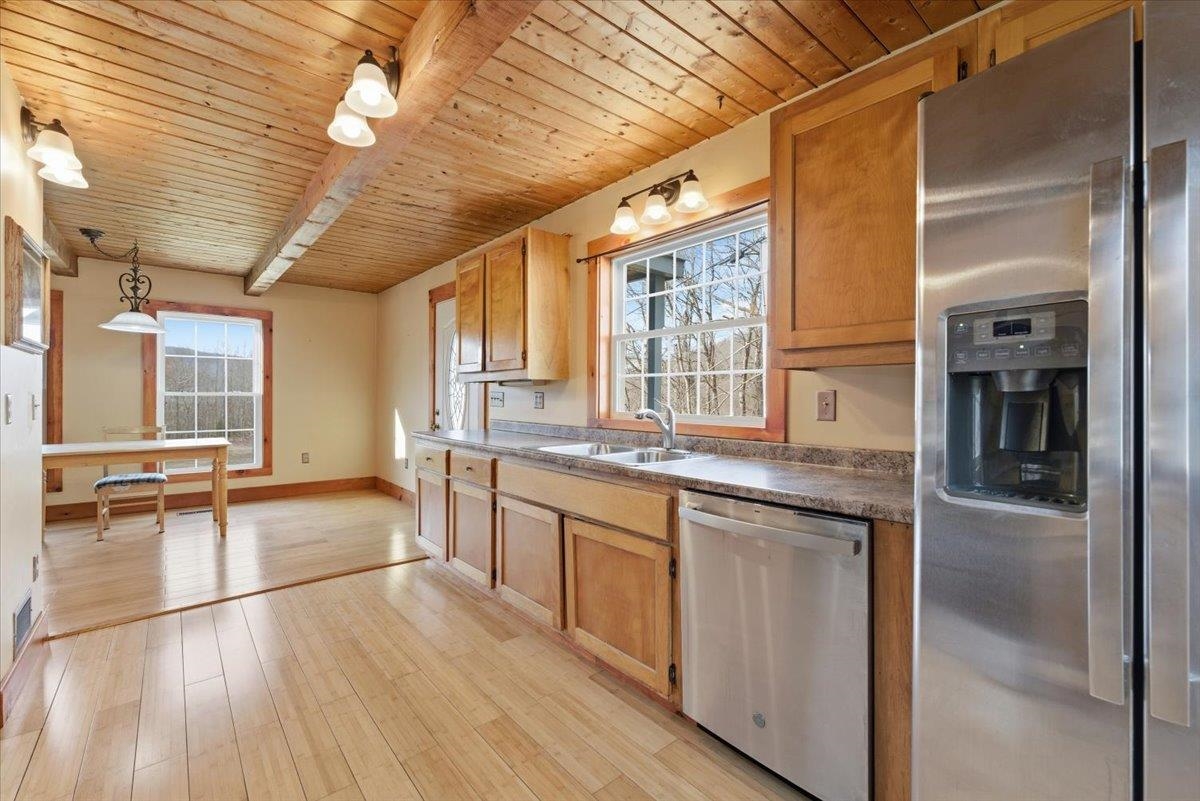 Magnificent setting on 4 scenic acres in rural Shaftsbury, this classic 1979 Saltbox offers the perfect blend of Vermont charm, functional space, and meaningful updates. Surrounded by rolling landscape and mountain views, the vibe is peaceful and inviting—ideal for those seeking privacy without sacrificing convenience. Inside, the home features a warm and welcoming layout highlighted by natural wood ceilings, exposed beams, and large windows to capture the views from every angle. The spacious main living area flows easily to the kitchen and dining space, while a wood stove adds both ambiance and supplemental heat. A first-floor bedroom and full bath provide flexible living options, with two additional bedrooms and a second bath upstairs. Recent improvements add significant value and peace of mind, including a standing seam metal roof, vinyl siding, windows, and a covered deck that expands your living space outdoors. The kitchen has been refreshed with updated appliances and countertops, with bamboo hardwood flooring running throughout the main floor. The oil tank and furnace were installed new in 2021. Recent system updates include replaced well pumps (drilled and shallow wells), a serviced central A/C system, and an updated radon mitigation fan—enhancing efficiency, reliability, and everyday comfort. Deck railings are a work in progress; materials are on site and seller will complete prior to closing. The oversized two-car garage features a brand new roof and a full second floor, offering exceptional versatility for a workshop, storage, or future finished space. Bordered by woods to the west for afternoon shade and an unobstructed eastern mountain view to soak up every sunrise, this property is as special outside as it is inside. Whether you're looking for a full-time residence or a Vermont retreat, this property delivers space, setting, and substance in a truly special location.