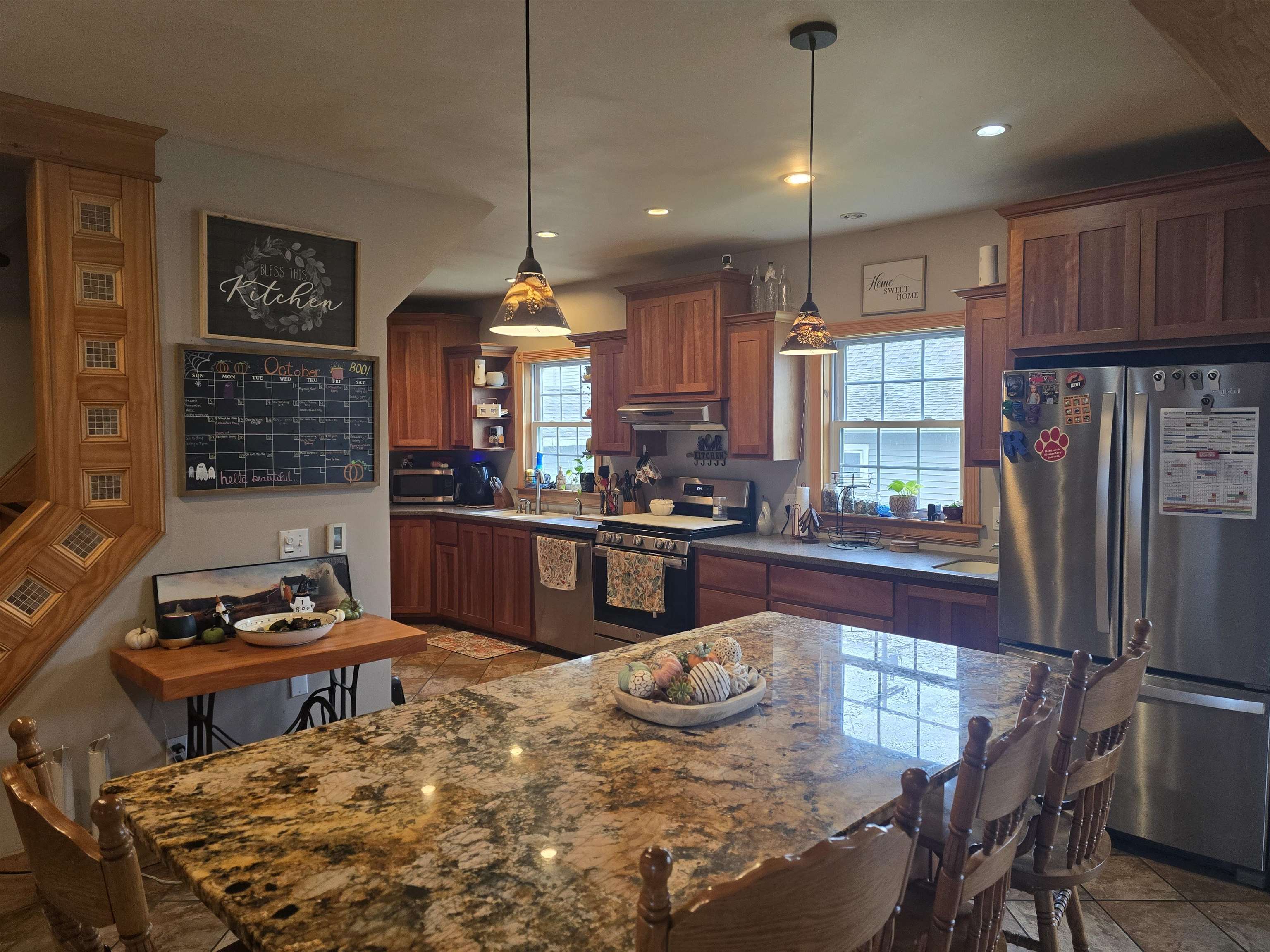 Hardwick, VT — This spacious and beautifully maintained home offers 6 bedrooms and 1.25 baths, all within walking distance to downtown amenities. The kitchen is a standout, featuring finely crafted cherry cabinetry, Corian countertops, and a stunning African granite–finished island, perfect for cooking and gathering. Numerous updates have been completed, including a newer roof, furnace, and exterior paint, along with Efficiency Vermont–supported spray foam insulation in the basement, providing year-round comfort and energy savings. A one car garage (approximately 365 sq. ft.) is currently used as a workshop, offering flexible space for hobbies, storage, or future garage use. This home blends classic charm with modern efficiency in a convenient village location.