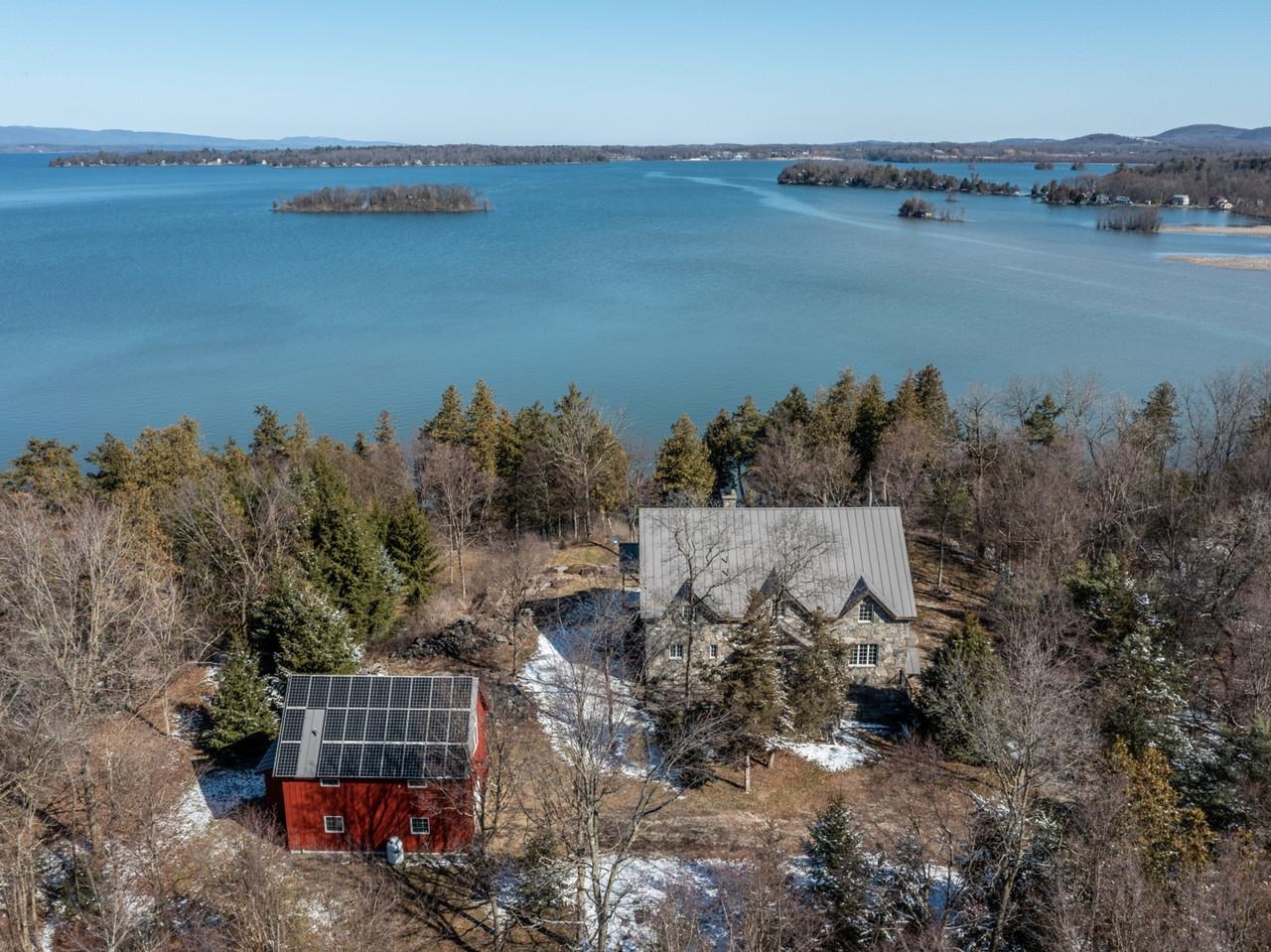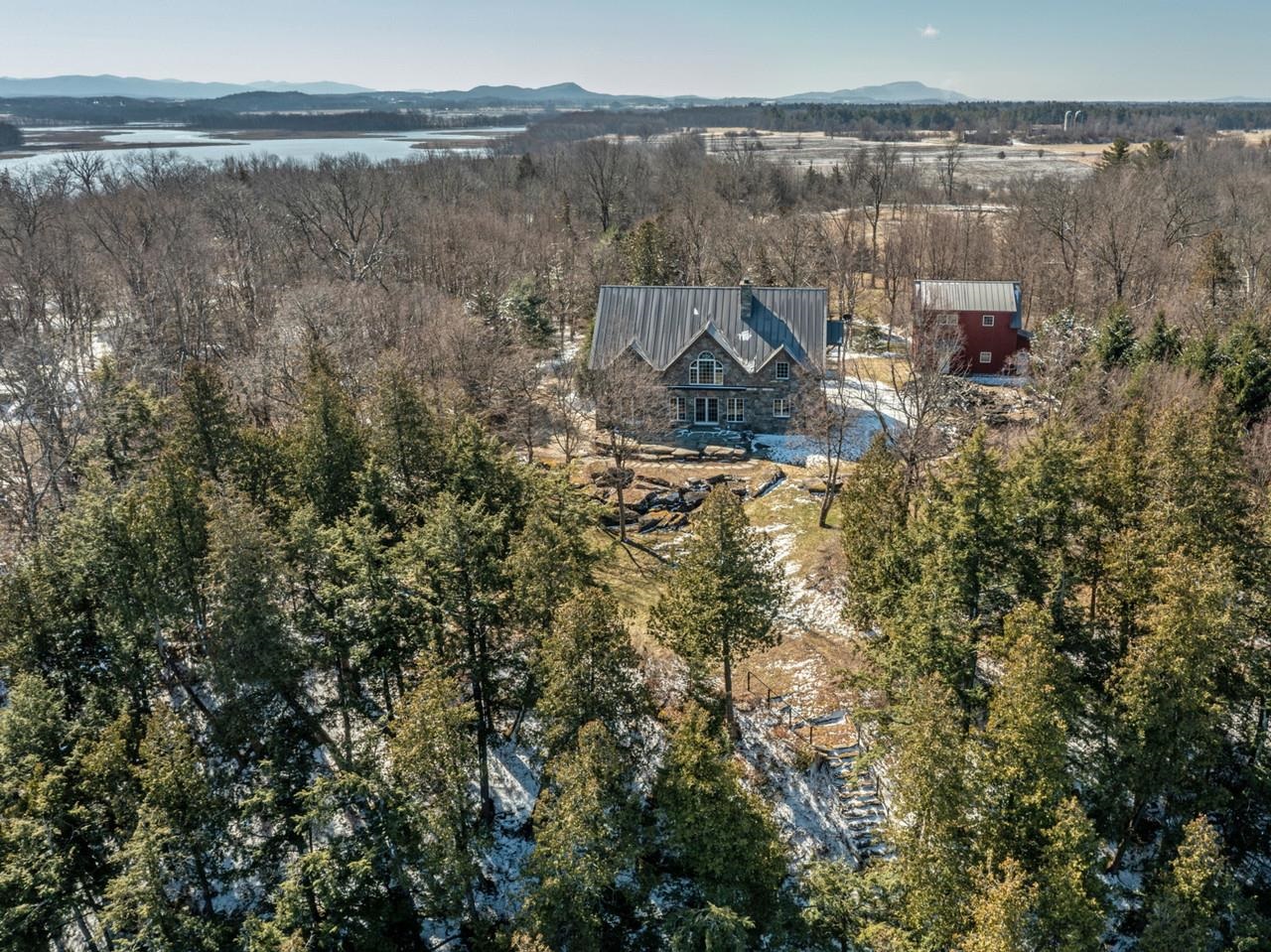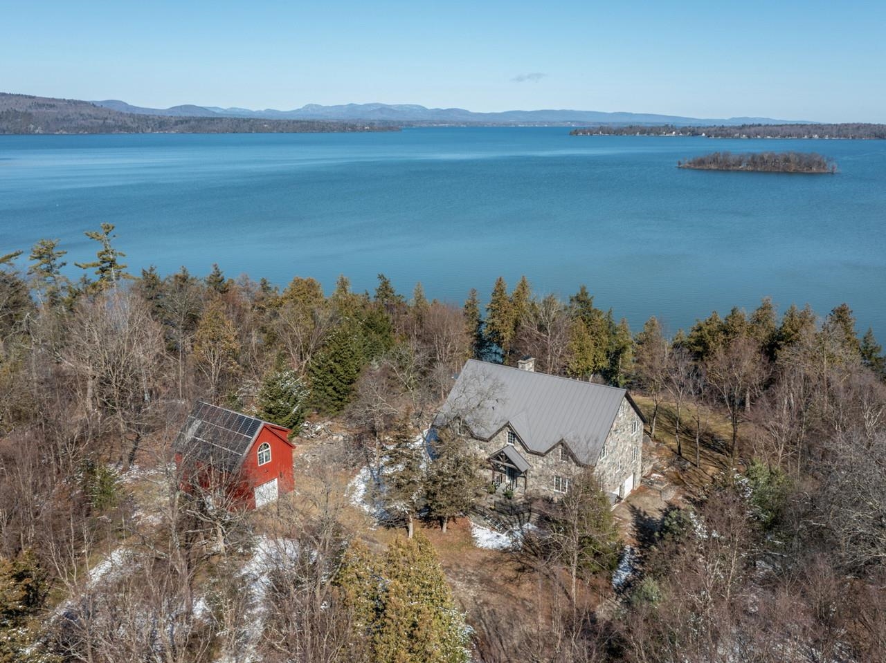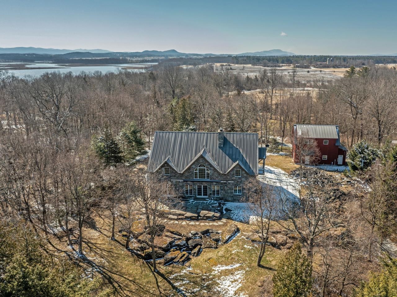 Set on 10 private acres with 250 feet of direct frontage on Lake Champlain, this exceptional custom home showcases timeless craftsmanship and striking materials throughout. Built with distinctive Panton stone and featuring stunning post-and-beam construction, the interior is both warm and architecturally impressive. The dramatic living room offers soaring ceilings and lake views, anchored by a floor-to-ceiling Panton stone fireplace with hearth - perfect for cozy gatherings year-round. Rich hardwood floors flow throughout the home with radiant heat on the first floor, complimented by beautiful cedar closets throughout, many of them walk-in closets, adding both charm and functionality. The thoughtfully designed kitchen features high-quality finishes, quartz countertops, abundant custom cabinetry, and a spacious pantry. Enjoy both a formal dining room and a casual dining area, the latter oriented to capture serene water views. A desirable first-floor primary suite provides comfort and convenience, while the upper level offers two additional bedrooms, two loft spaces, and a generous front-to-back bonus room, ideal for a home office, fitness area, or family room. Outside, a stone patio invites you to relax and entertain while taking in the natural beauty of the surroundings. A second detached garage includes a studio apartment, offering excellent potential for guest accommodations or income generation. Outdoor air ventilation. A truly well-built and thoughtfully designed lakefront retreat, blending rustic elegance with modern comfort.