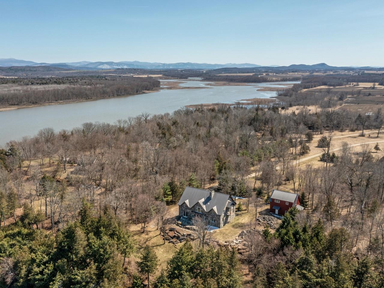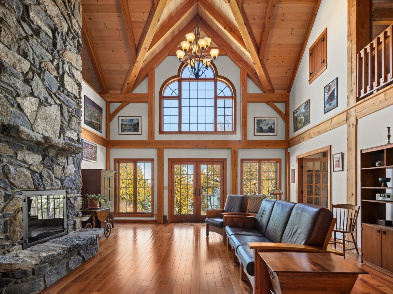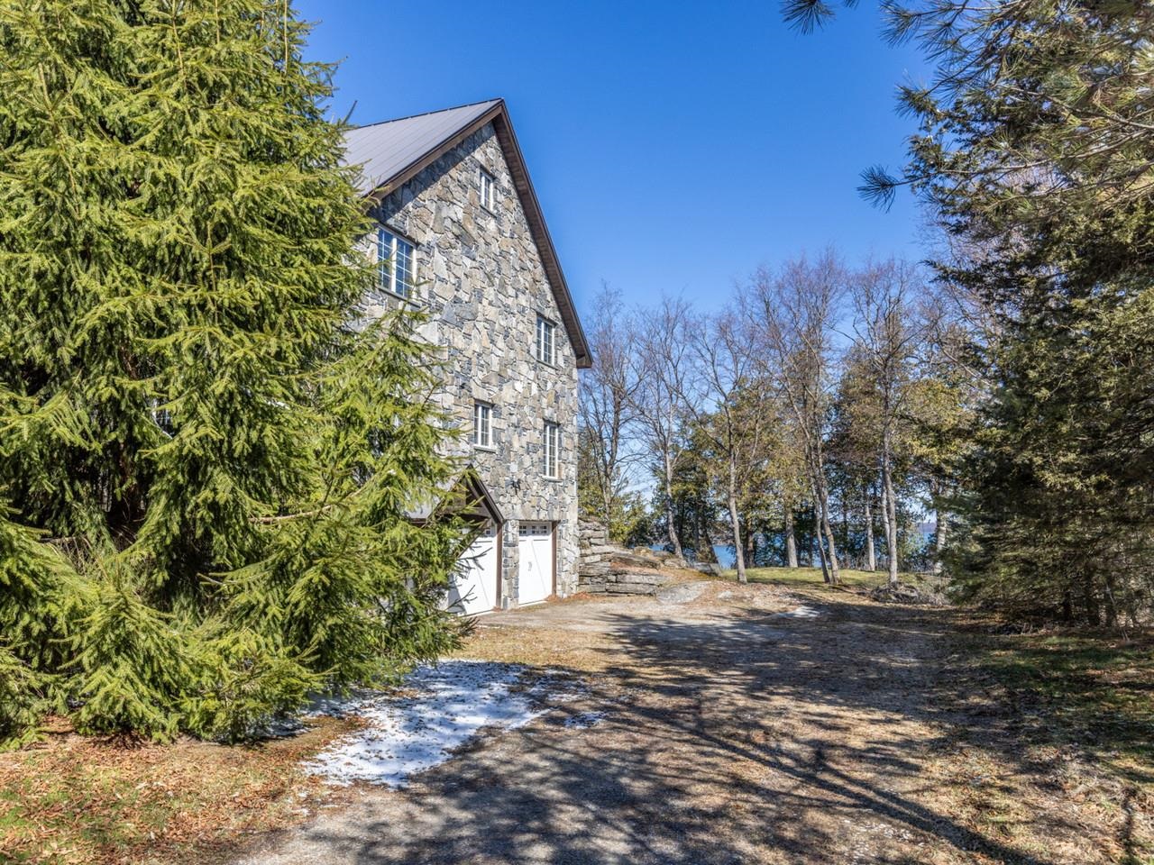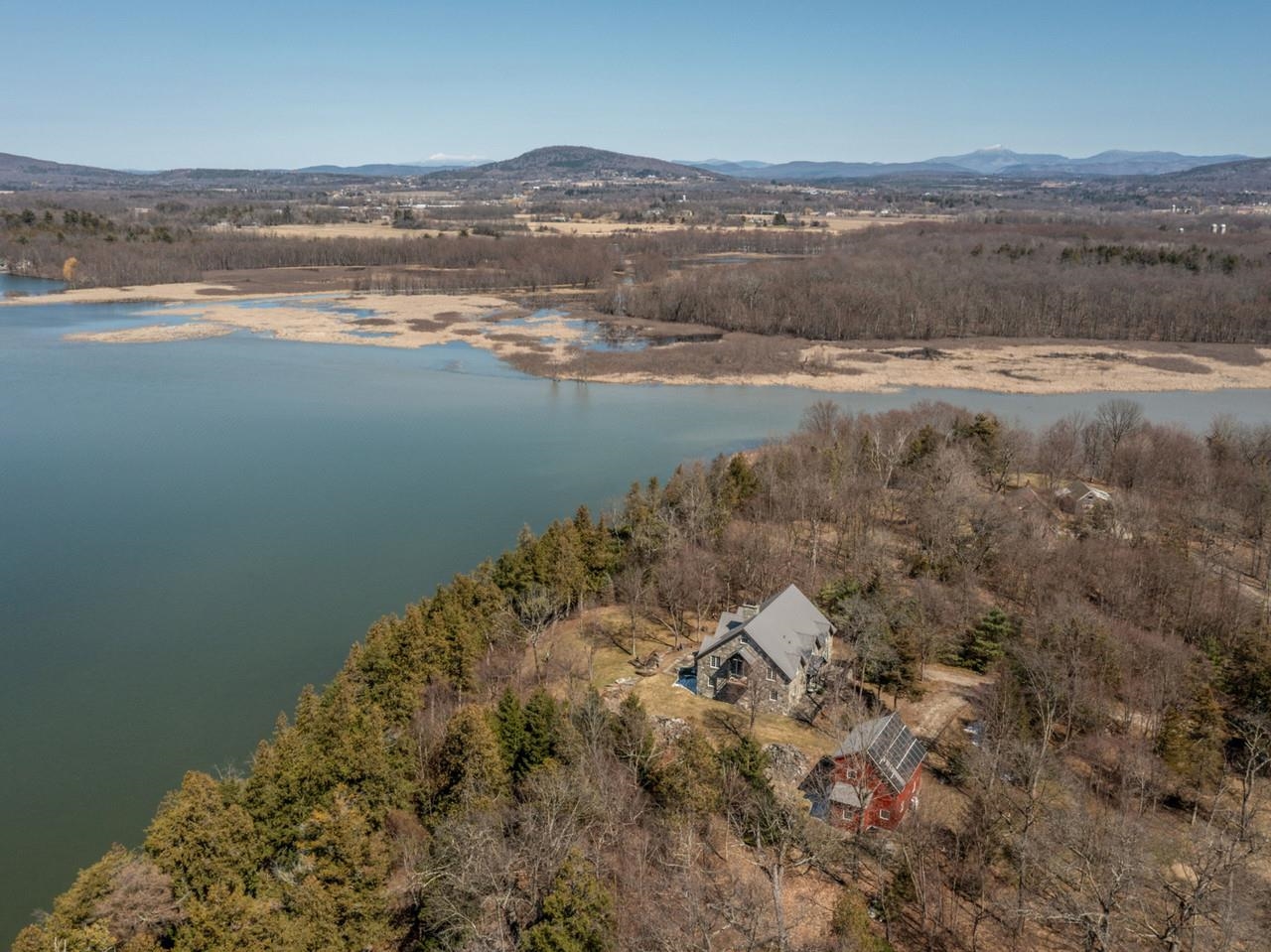 Set on 10 private acres with 250 feet of direct frontage on Lake Champlain, this exceptional custom home showcases timeless craftsmanship and striking materials throughout. Built with distinctive Panton stone and featuring stunning post-and-beam construction, the interior is both warm and architecturally impressive. The dramatic living room offers soaring ceilings and lake views, anchored by a floor-to-ceiling Panton stone fireplace with hearth - perfect for cozy gatherings year-round. Rich hardwood floors flow throughout the home with radiant heat on the first floor, complimented by beautiful cedar closets throughout, many of them walk-in closets, adding both charm and functionality. The thoughtfully designed kitchen features high-quality finishes, quartz countertops, abundant custom cabinetry, and a spacious pantry. Enjoy both a formal dining room and a casual dining area, the latter oriented to capture serene water views. A desirable first-floor primary suite provides comfort and convenience, while the upper level offers two additional bedrooms, two loft spaces, and a generous front-to-back bonus room, ideal for a home office, fitness area, or family room. Outside, a stone patio invites you to relax and entertain while taking in the natural beauty of the surroundings. A second detached garage includes a studio apartment, offering excellent potential for guest accommodations or income generation. Outdoor air ventilation. A truly well-built and thoughtfully designed lakefront retreat, blending rustic elegance with modern comfort.
