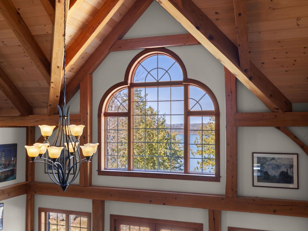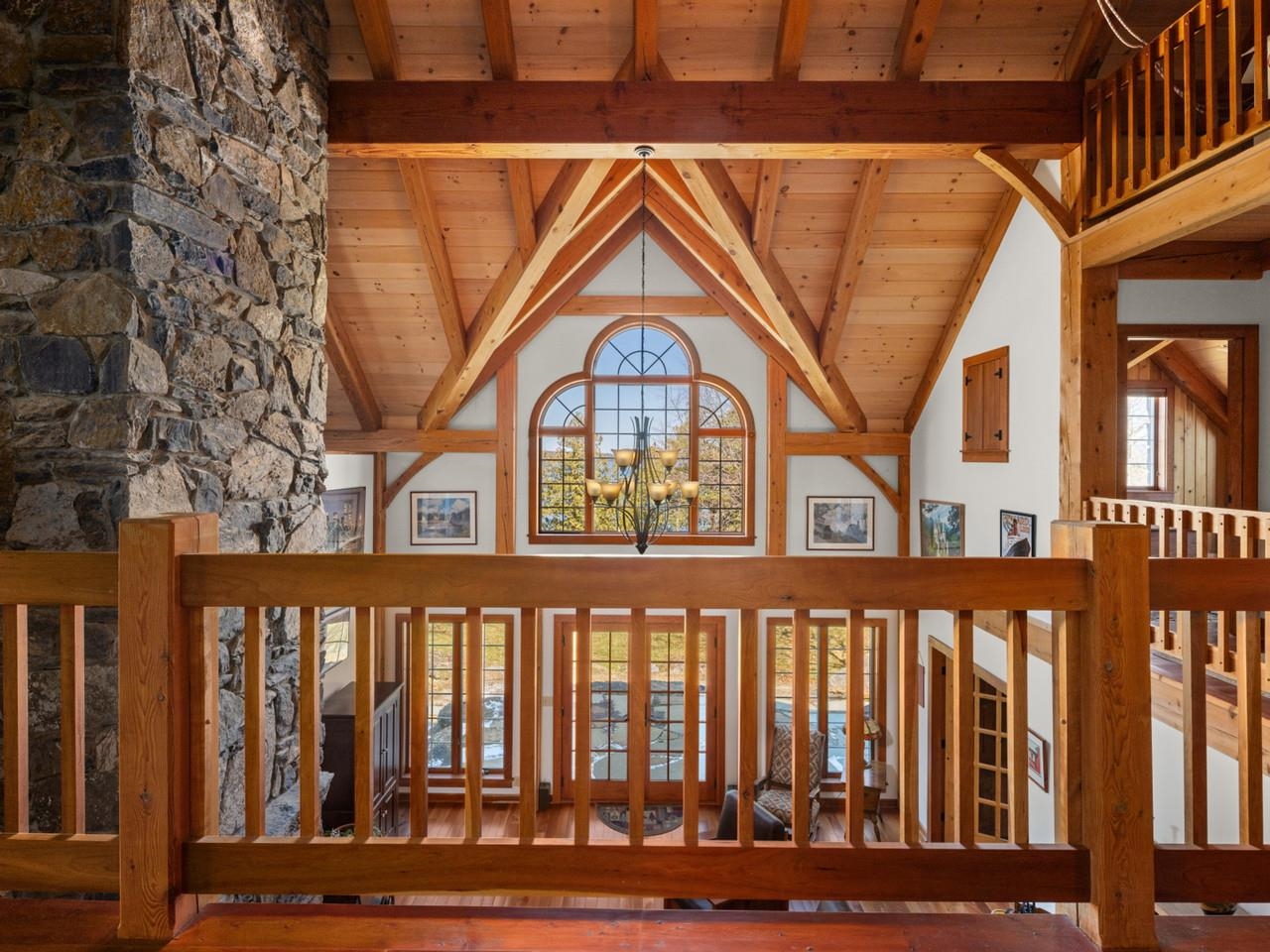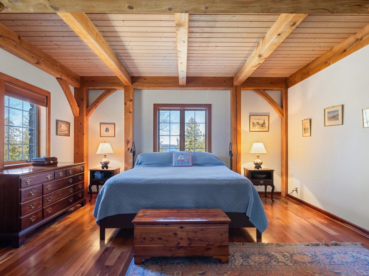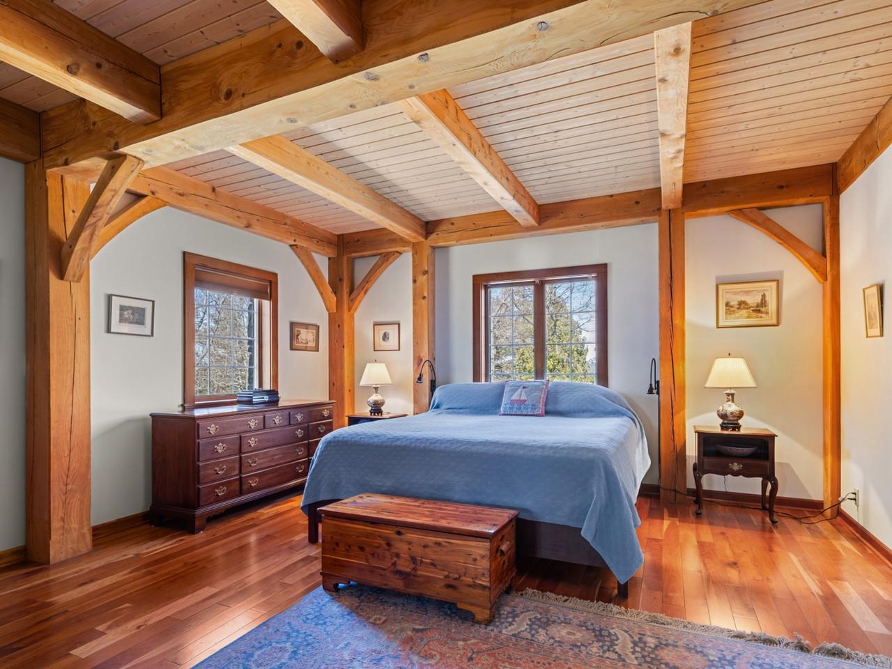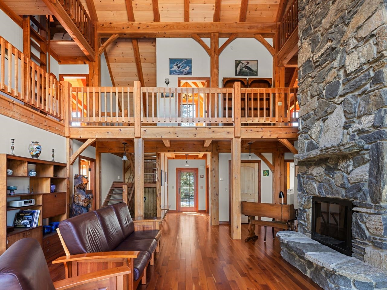 Set on 10 private acres with 250 feet of direct frontage on Lake Champlain, this exceptional custom home showcases timeless craftsmanship and striking materials throughout. Built with distinctive Panton stone and featuring stunning post-and-beam construction, the interior is both warm and architecturally impressive. The dramatic living room offers soaring ceilings and lake views, anchored by a floor-to-ceiling Panton stone fireplace with hearth - perfect for cozy gatherings year-round. Rich hardwood floors flow throughout the home with radiant heat on the first floor, complimented by beautiful cedar closets throughout, many of them walk-in closets, adding both charm and functionality. The thoughtfully designed kitchen features high-quality finishes, quartz countertops, abundant custom cabinetry, and a spacious pantry. Enjoy both a formal dining room and a casual dining area, the latter oriented to capture serene water views. A desirable first-floor primary suite provides comfort and convenience, while the upper level offers two additional bedrooms, two loft spaces, and a generous front-to-back bonus room, ideal for a home office, fitness area, or family room. Outside, a stone patio invites you to relax and entertain while taking in the natural beauty of the surroundings. A second detached garage includes a studio apartment, offering excellent potential for guest accommodations or income generation. Outdoor air ventilation. A truly well-built and thoughtfully designed lakefront retreat, blending rustic elegance with modern comfort.