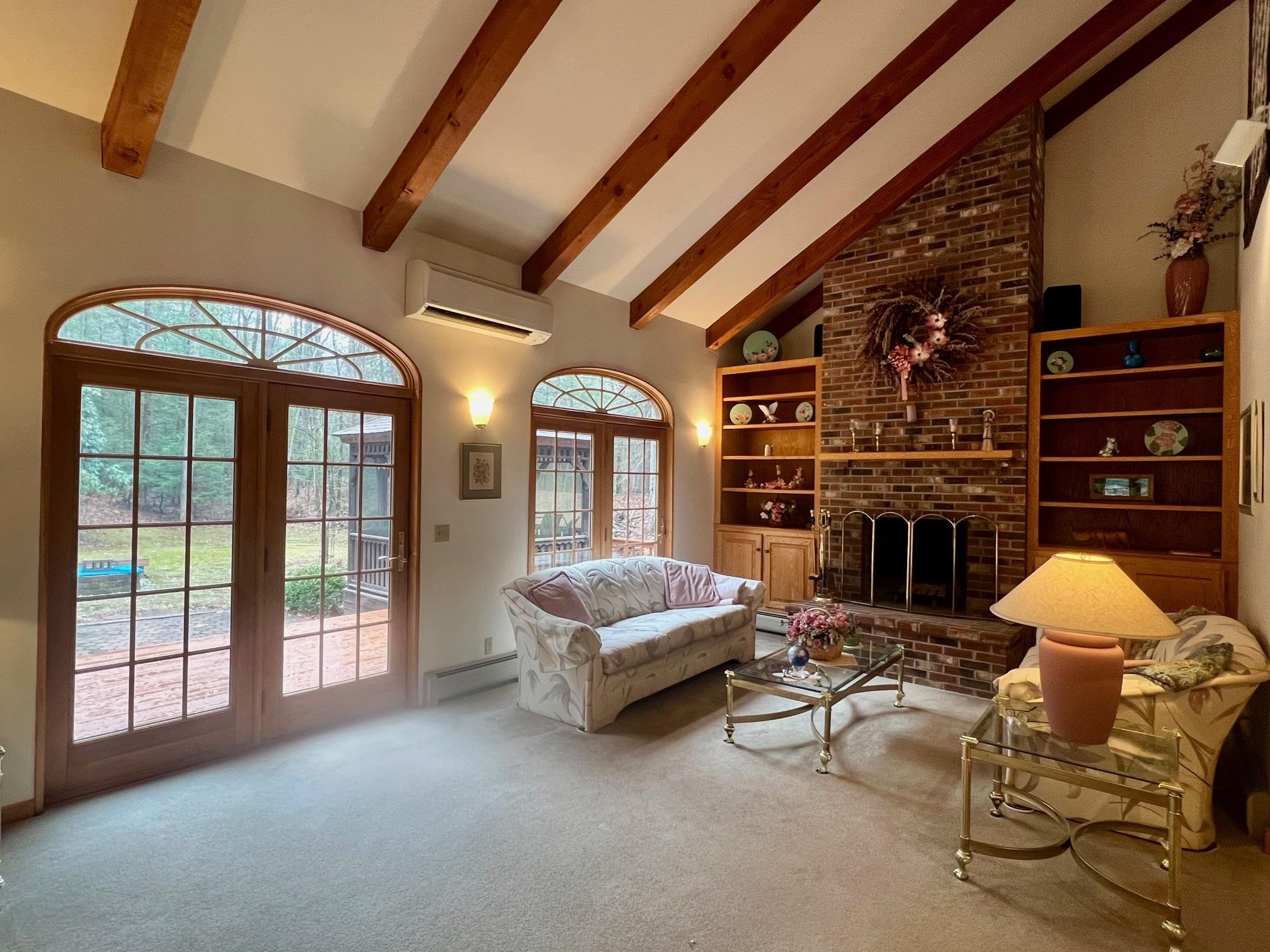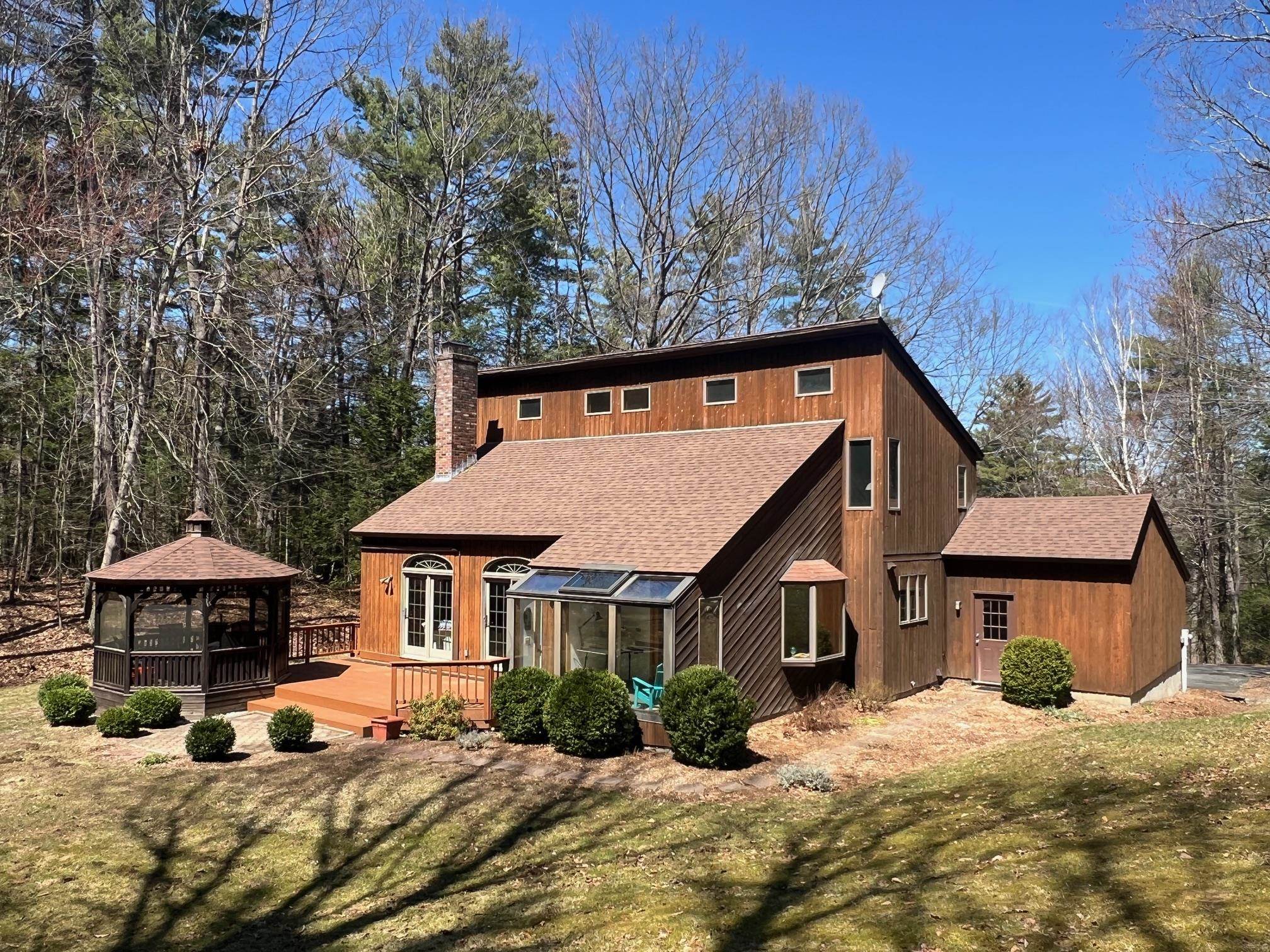 Lovely house in a lovely location! Great neighborhood. Come see this attractive, contemporary-style, lovingly maintained 3-bedroom, 3-bathroom home on almost 3 acres. Situated up-and-off the neighborhood road in a private, beautiful setting, there is so much to appreciate. Drive right into the 3-car garage and step up into the house. Admire the kitchen's quartz countertops and workspaces. The laundry area is around the corner on the main floor as well as a half-bathroom. The dining area- open to the living room, has a hardwood floor with French doors leading to the ceramic-tiled 4-season finished sunroom. The living room is open-concept and has a high vaulted ceiling. It features a set of beautiful south-facing French doors with arched window-tops that open to the back deck, yard, screened gazebo and firepit. You will appreciate the LR's mini-split and love the floor-to-ceiling brick fireplace with built-in bookshelves to either side. Around the corner, the den is a private space for TV watching and could be used as a home-office or spare bedroom for guests. Upstairs, the primary bedroom suite-with vaulted ceilings, features a renovated bathroom and sm. walk-in closet. Down the hall are two more bedrooms and another full bath. One bedroom has a hardwood floor and an additional sleeping loft, and the other, with brand-new carpet and fresh paint. The basement consists of a workshop area, utility area with the boiler and newer hot water heat pump/dehumidifier. Other sections of the basement could be finished for extra living space. At minimum, you'll have awesome storage. Not only is this property a convenient and paved drive to Brattleboro (approx 13 min, but it is also under a 10-minute paved drive to I-91 Bernardston MA exit) (1.5 miles to Vernon Rec and pool) Vernon has a great elem. school as well as "school choice". Vernon is a no-zoning town. Hiking trails nearby. Make an appointment today! Showings start: Sat. 4/18