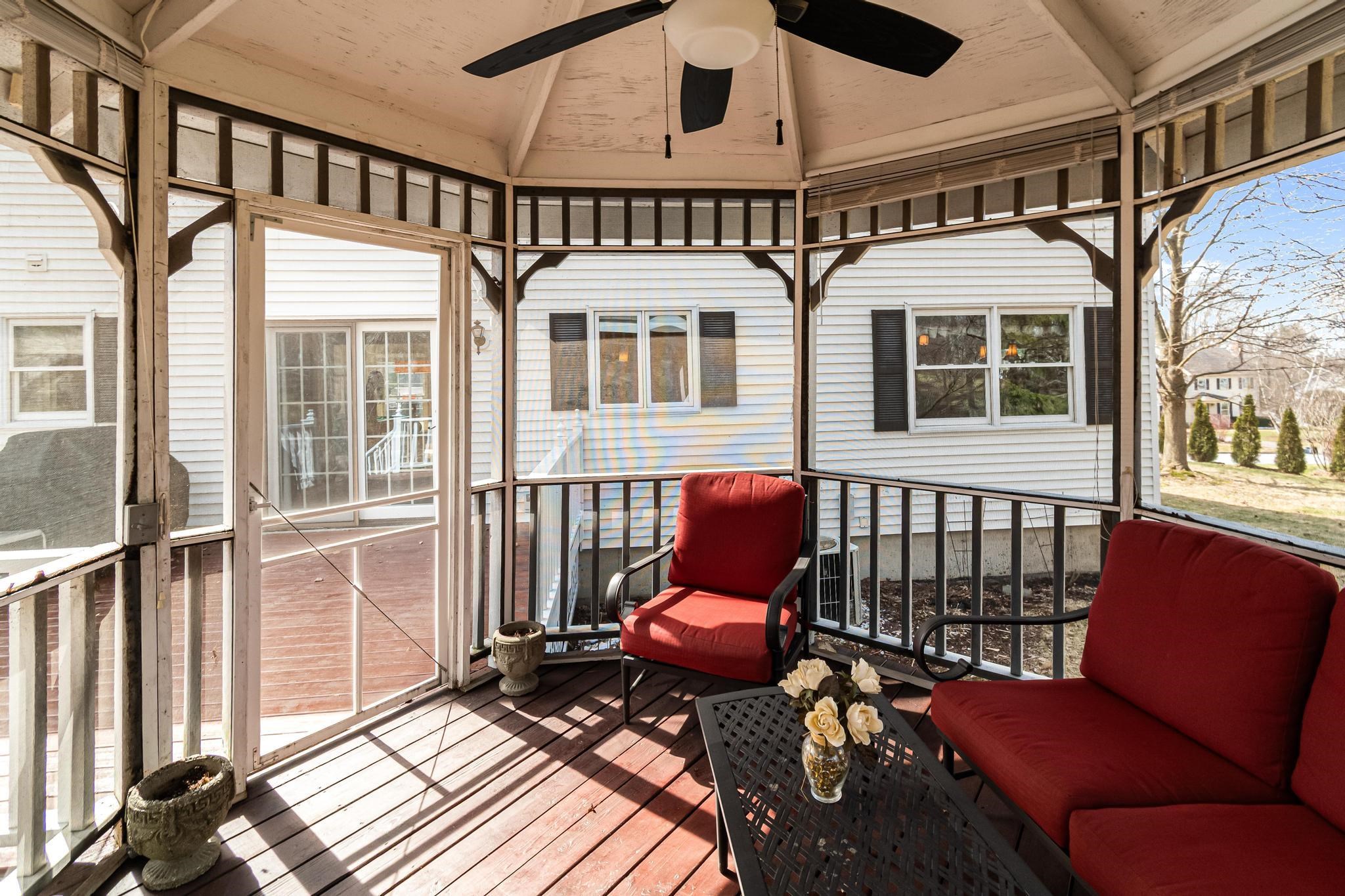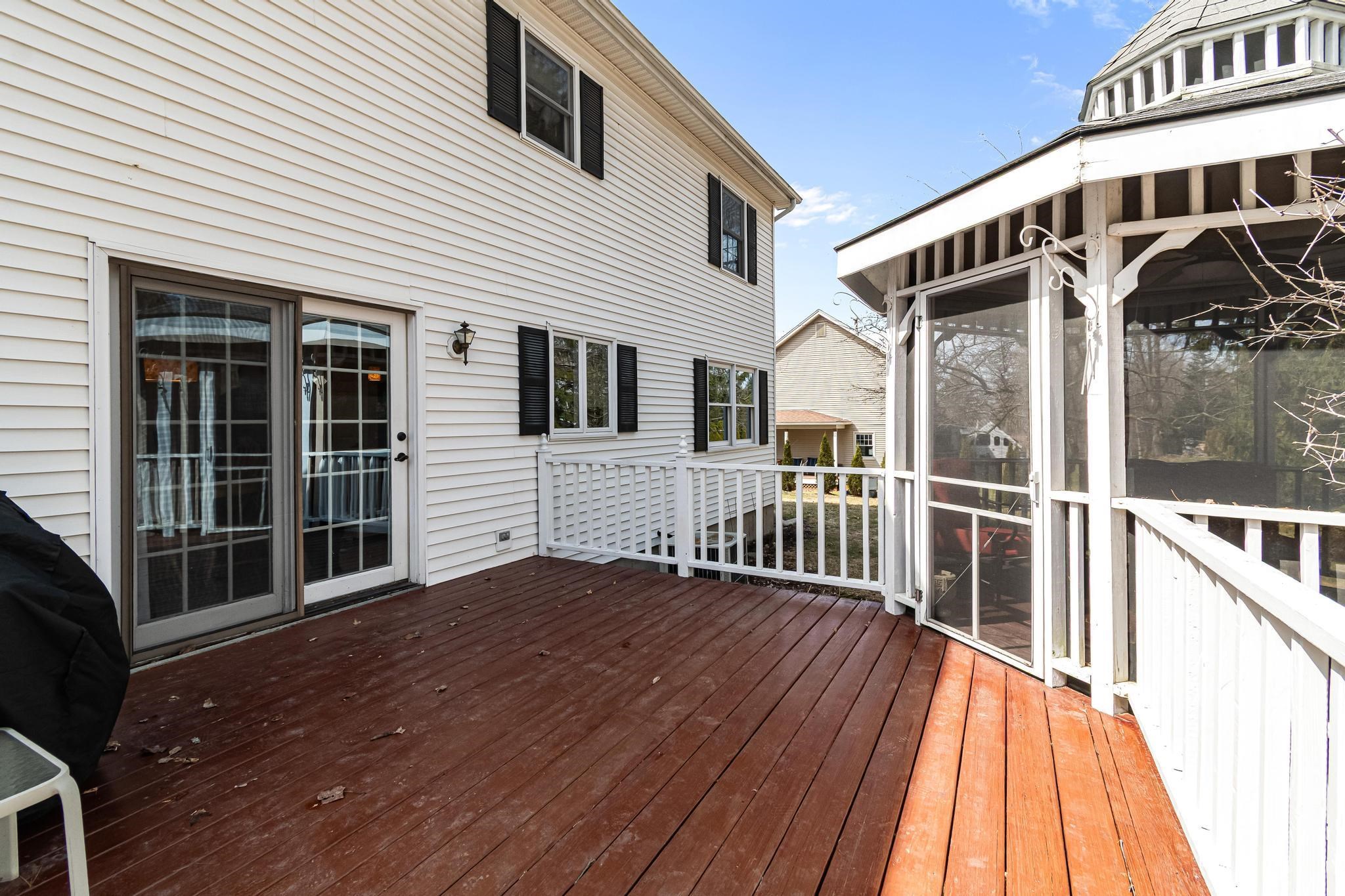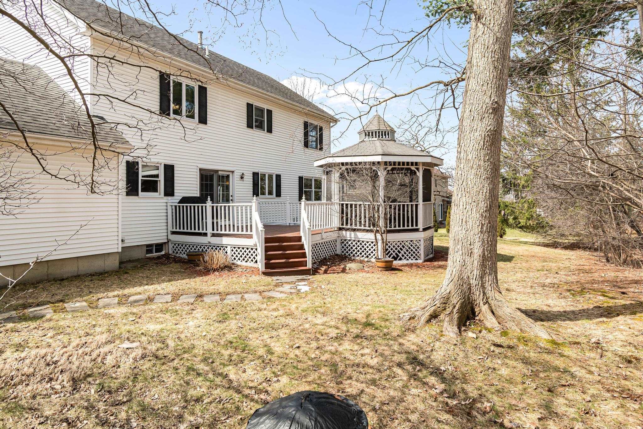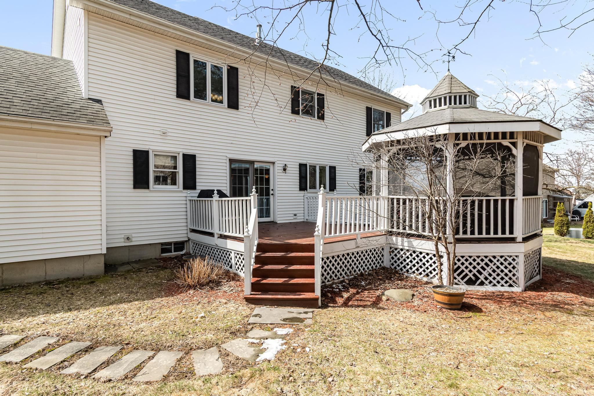 Located in Williston’s sought-after Southridge community, this 4 bed, 2.5 bath Colonial offers a spacious, well-designed layout paired with thoughtful updates and comfortable living throughout. Enter from the welcoming front porch into a bright and inviting foyer, where yellow birch hardwood flooring sets the tone and flows seamlessly into the living room, creating a warm and cohesive main living space. The kitchen is both functional and inviting, featuring a large island with granite countertops, ample cabinetry, and an eat-in nook for casual meals. Tiled flooring continues into the adjacent formal dining area, offering a great setup for both everyday living and entertaining. From the kitchen, step directly out to the back deck—perfect for indoor-outdoor flow during the warmer months. The first floor also includes a versatile front den, ideal for a home office or additional living space, along with a convenient half bath with laundry and direct access to the attached two-car garage. Upstairs, the spacious primary suite provides a relaxing retreat with a walk-in closet and a full en suite bath complete with a soaking tub, step-in shower, and vanity. Three additional bedrooms, a second full bathroom with granite countertops, and a hardwood-floored hallway complete the second level. The partially finished basement adds excellent flexibility, offering bonus space for recreation, a media room, home gym, or office, along with additional unfinished storage. Outside, enjoy a beautifully landscaped lot with a large back deck and a standout screened gazebo, complete with electricity. Additional highlights include updated lighting fixtures throughout and a central vacuum. As part of the Southridge HOA, residents enjoy access to a swimming pool, basketball and tennis courts, and 67 acres of shared open space. All this, just minutes to Williston amenities, including local schools, I-89, and Tafts Corners, making this home a perfect blend of comfort, convenience, and community.