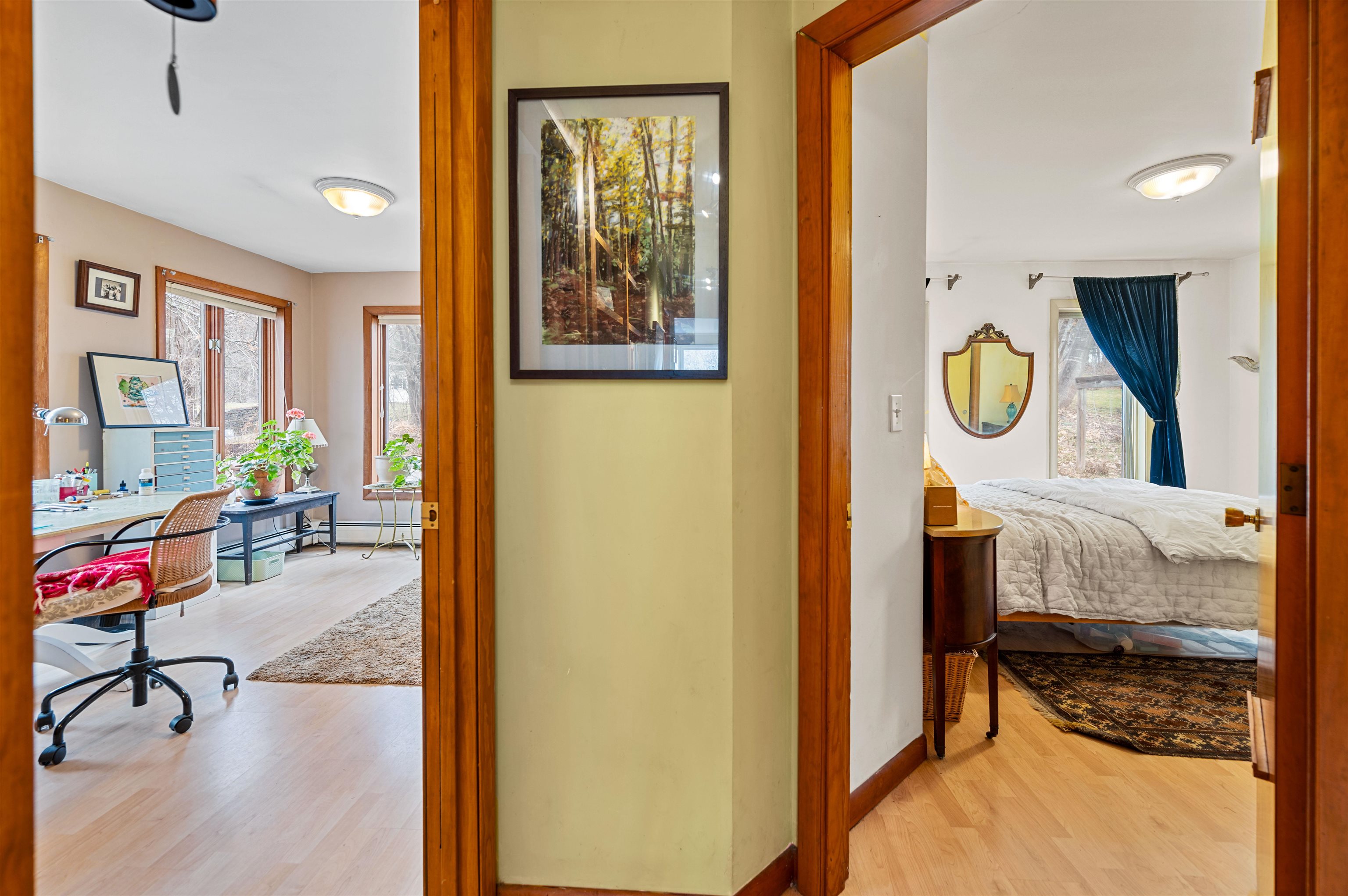 This well-loved home is a hidden gem just minutes from downtown Montpelier. Quiet and naturally beautiful, the setting offers morning birdsong, regular visits from deer, fox, and other wildlife, and easy access to nearby walking paths and wooded trails. It feels tucked away, yet close to everything. Natural light fills the home from all four sides, highlighting a thoughtful mix of character and updates. The living room is open to the kitchen, featuring hardwood floors and a wood stove, while the sunroom/dining area offers radiant heated floors and walls of windows overlooking trees and gardens. Bright, comfortable, and flexible, this is a home that works beautifully for everyday living as well as gathering with friends and family. The kitchen has been updated with stone countertops, stainless steel appliances, a gas range, and a clean, modern feel. Three bedrooms provide flexibility; the primary bedroom is currently being used as an art studio with its own door leading to the backyard. The full bath includes tile flooring, a glass block window detail, and a generously sized linen closet. Additional features include a whole-house air exchange system, internal perimeter drain with sump pump, baseboard hot water heat, and a tiled mudroom entry. The one-car garage beneath the home offers direct access, and storage is thoughtfully integrated throughout with built-ins, a cedar closet, and basement space. Outside, established perennial gardens complement the natural surroundings. Within walking distance to town, this property offers a rare combination of privacy, natural light, and connection to its setting.
