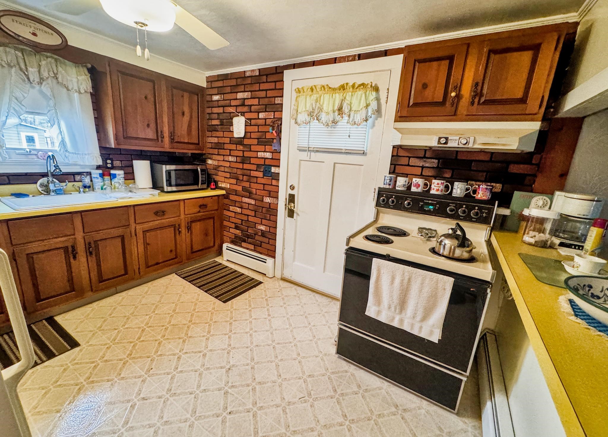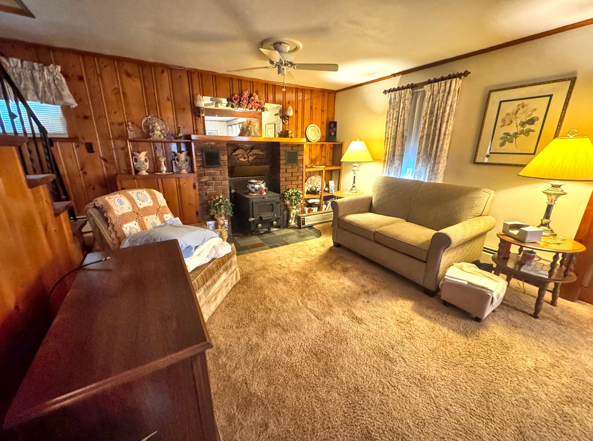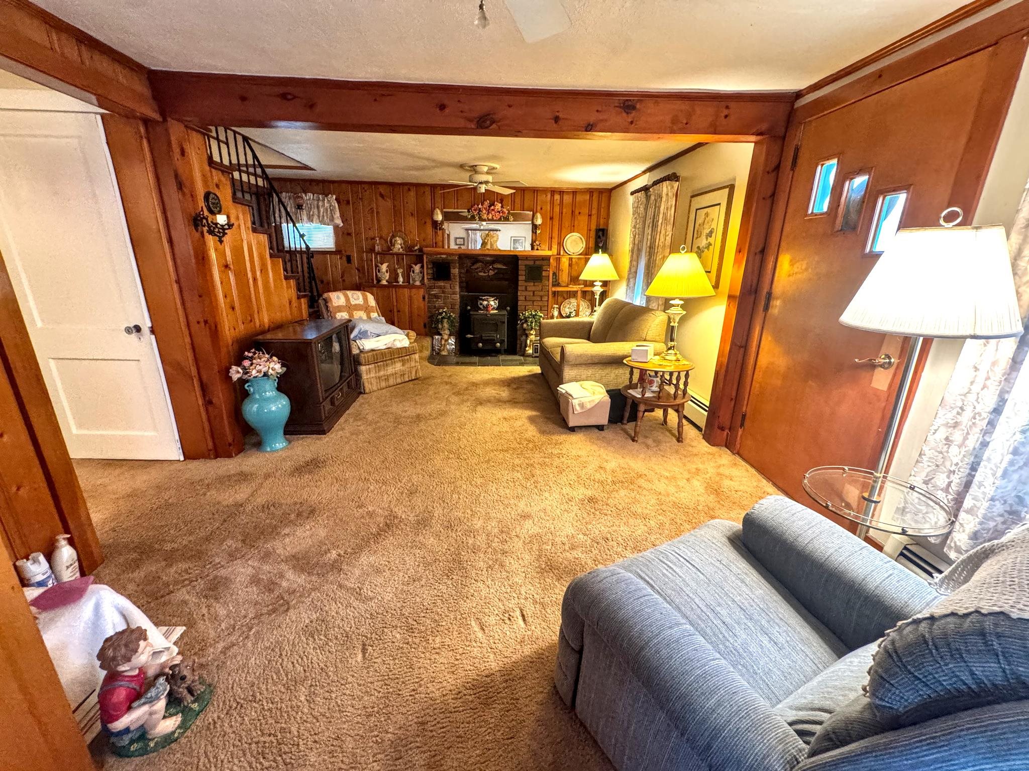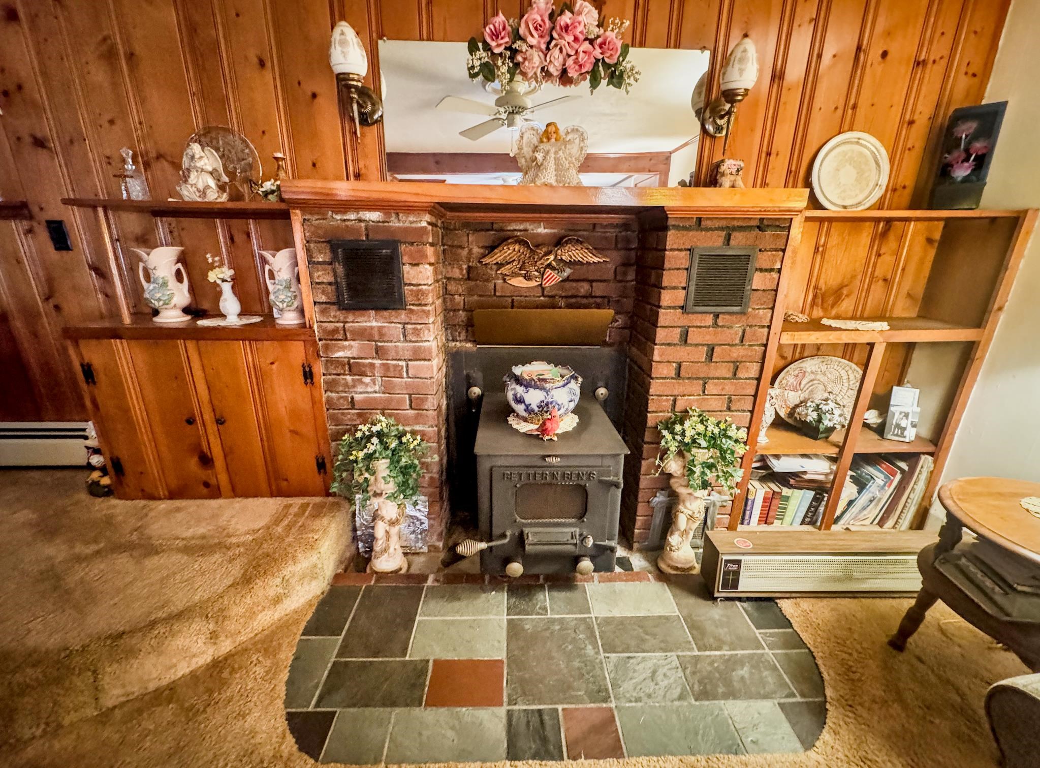 - Ceiling Fan, Dining Area, Wood Fireplace, 1 Fireplace, Hearth, Laundry Hook-ups, Natural Light, Natural Woodwork, Indoor Storage, Wood Stove Insert