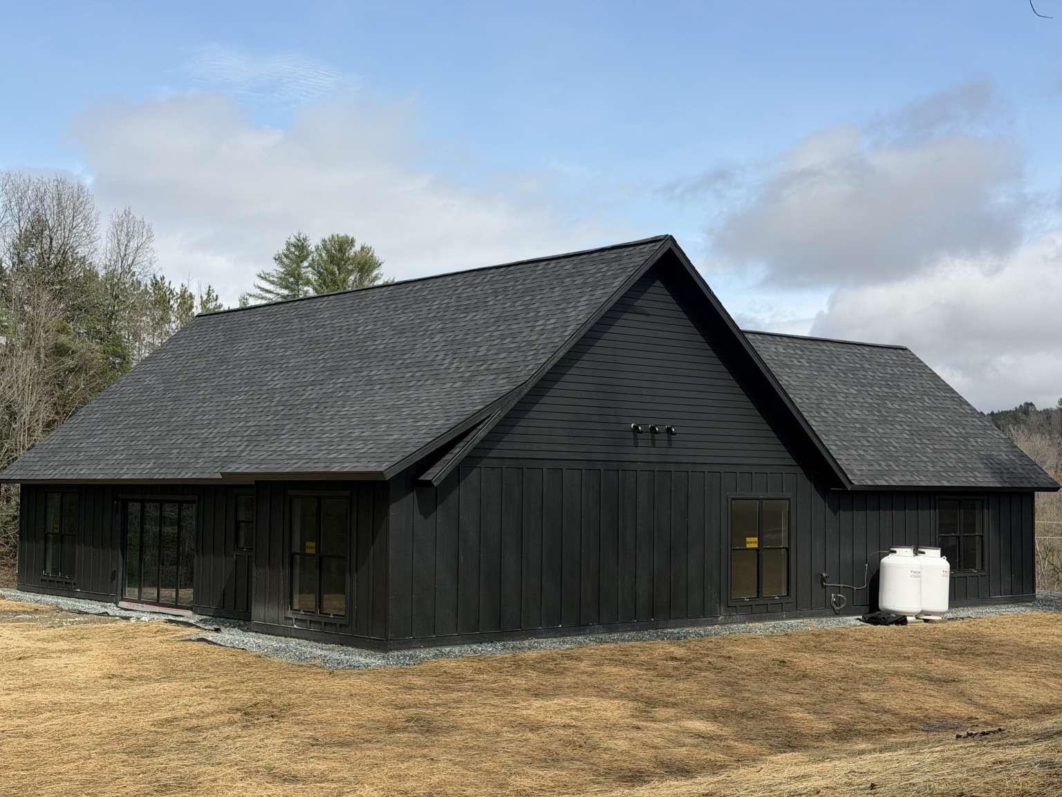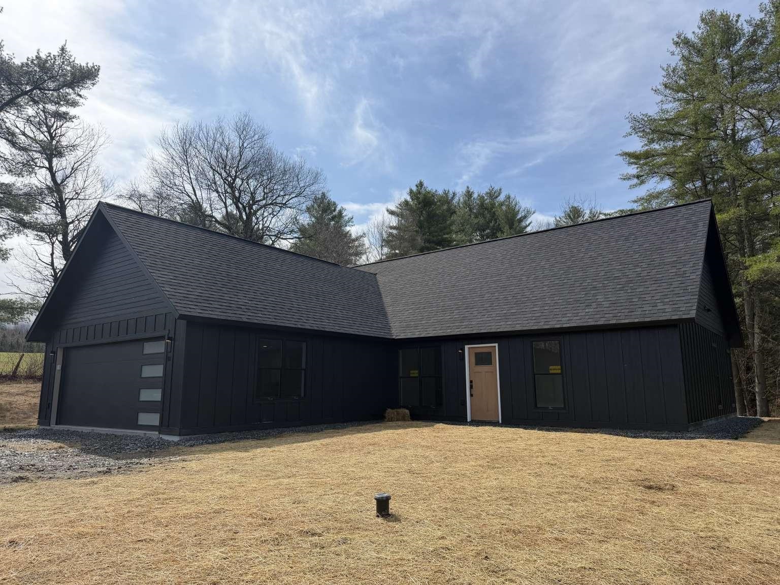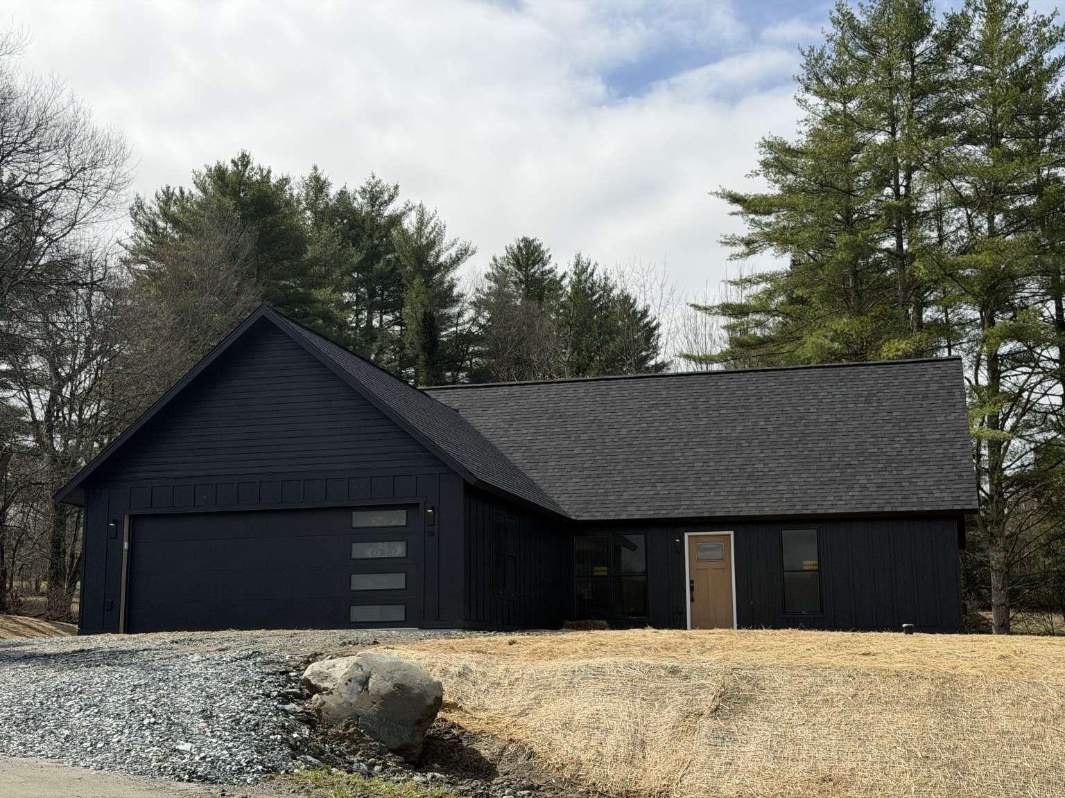 Newly constructed and thoughtfully designed, this contemporary home offers modern comfort on more than an acre of land. Featuring 3 bedrooms and 2 bathrooms, the home includes a spacious primary suite with a spacious dual-sink vanity and an attached walk-in closet. The open-concept living space is beautifully appointed with stainless steel appliances, a large kitchen island ideal for cooking and entertaining, and sleek finishes throughout. A grand sliding glass door frames scenic landscape views, creating a seamless indoor–outdoor connection. A heated, attached two-car garage adds both convenience and year-round comfort. Ideally situated just seconds from town and only minutes from Stowe, this property blends accessibility with peaceful surroundings. Enjoy easy access to the Lamoille Valley rail trail located just across the street, perfect for outdoor recreation. The expansive lawn showcases a spring-fed, clay-lined pond—an inviting focal point overlooking the natural landscape. Additional highlights include public water service and existing power hookups for a potential Additional Dwelling Unit (ADU), offering flexibility for future expansion or income potential—truly a rare two-in-one opportunity.